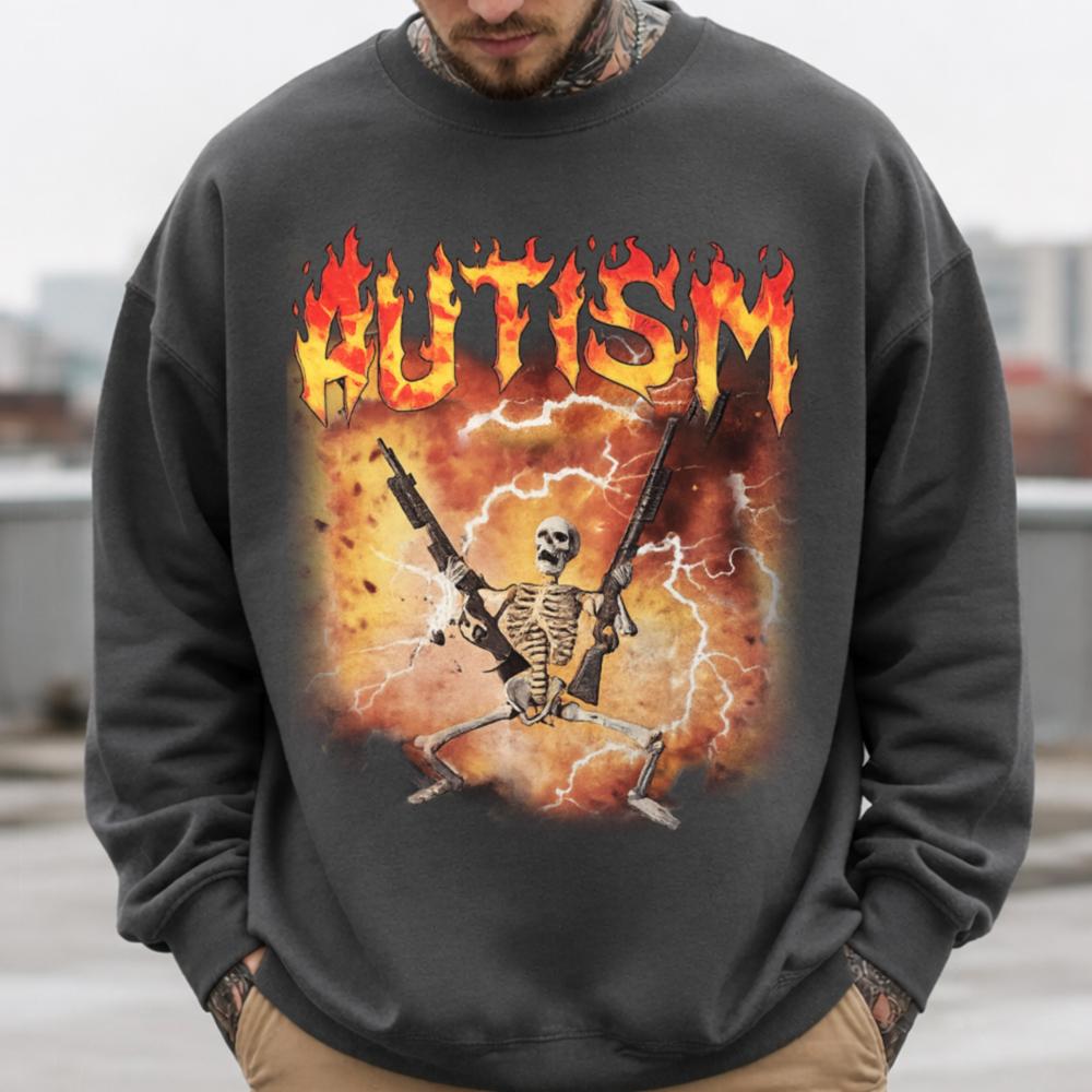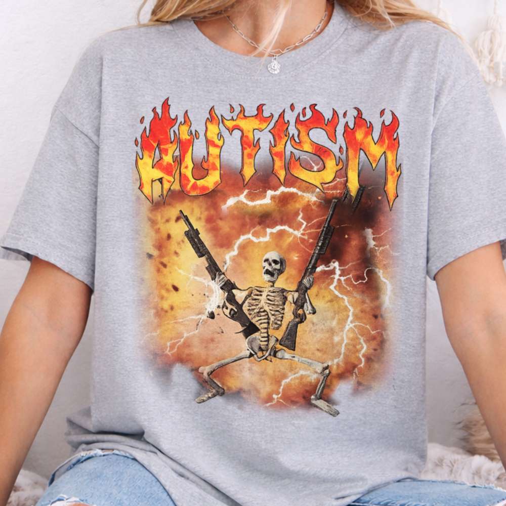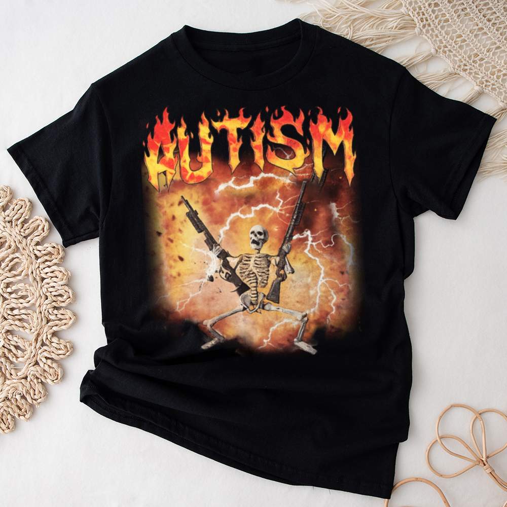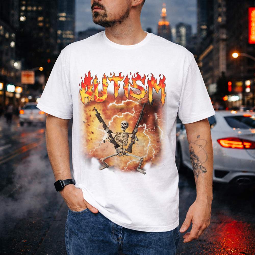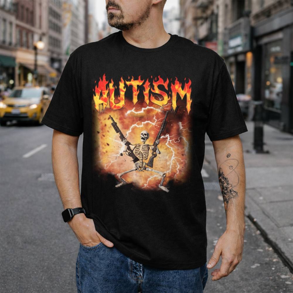 If you’re the type who laughs when you probably shouldn’t, this Autism Dark Humor T-Shirt is calling your name. The design? A skeleton mid-chaos, dual-wielding rifles in front of an explosion, with the word “AUTISM” blazing in a fiery font. It’s raw, unfiltered, and built for those who thrive on irony and rebellion.