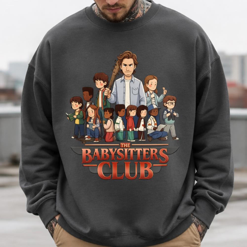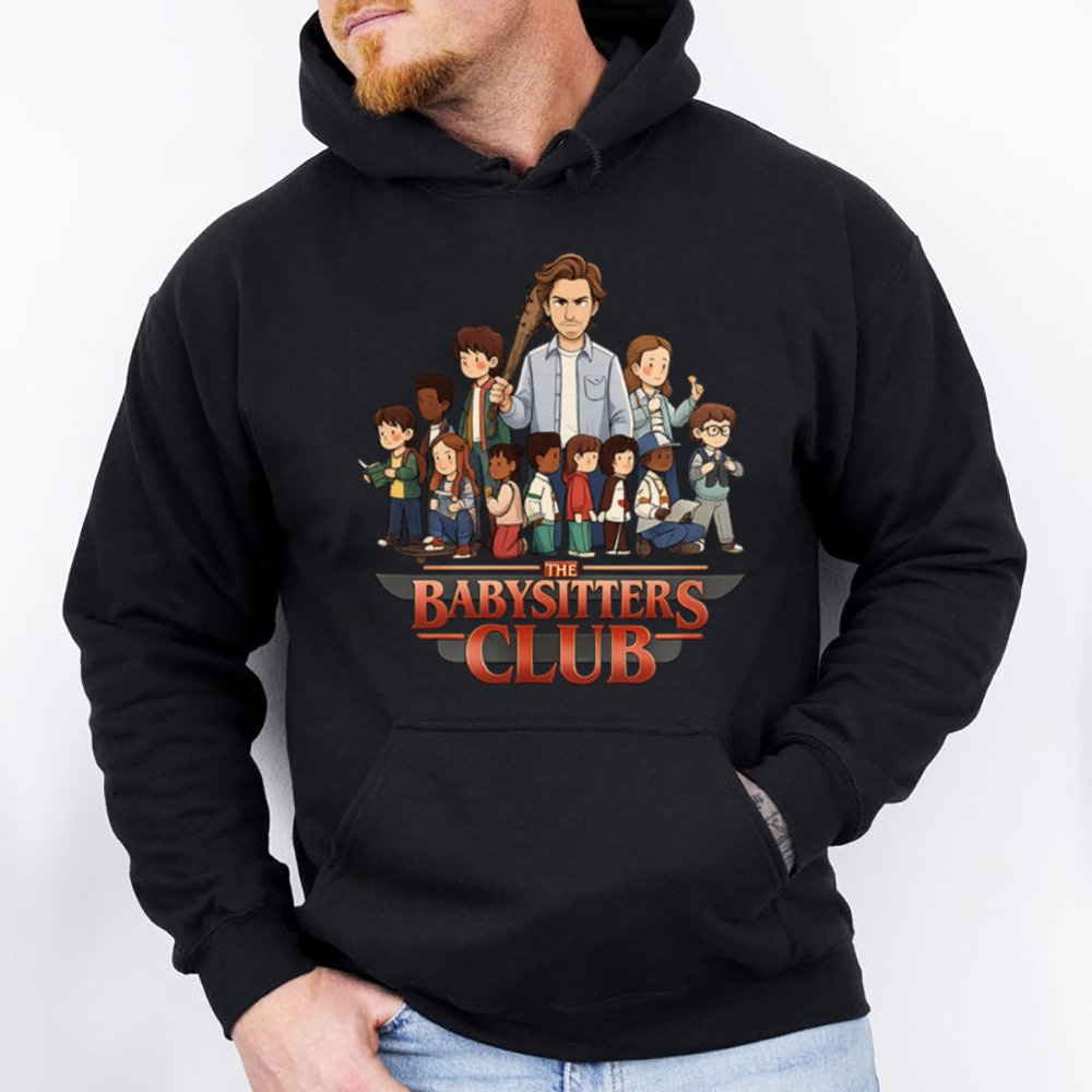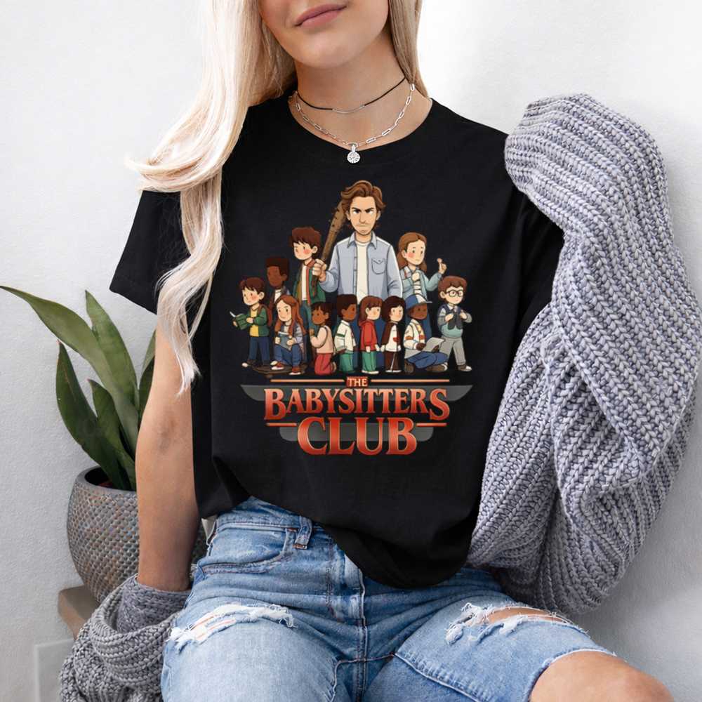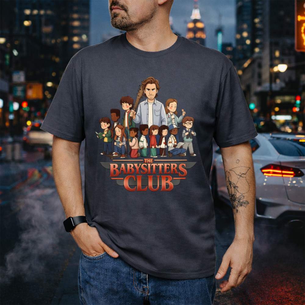 Say hello to the world’s most chaotic babysitter squad! The Babysitters Club Steve Harrington T-Shirt hilariously reima gines everyone’s favorite bat-wielding babysitter from Stranger Things as the fearless leader of a very retro-looking gang of kids. Styled like an old-school book cover mashup, this tee fuses pop culture nostalgia with clever parody in a way only true fans will fully appreciate.