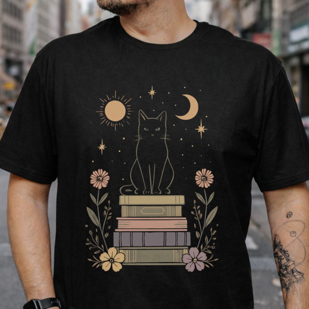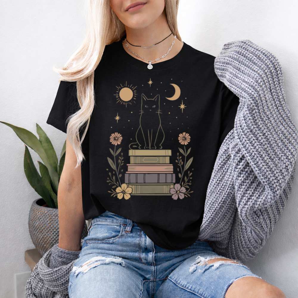 Embrace your love for cozy nights in with our Cat Lover T-Shirt, designed specifically for introverts. Featuring a charming graphic of a cat perched on a stack of books under a starry sky, this T-Shirt captures the essence of tranquility and introspection. The soft black fabric complements the whimsical design, making it perfect for any casual outing or a relaxed day at home. Ideal for bookworms and cat lovers alike, this shirt is a great addition to your wardrobe for cozy coffee shop visits, book club meetings, or simply lounging at home. Wear it proudly to express your unique personality and love for quiet moments.