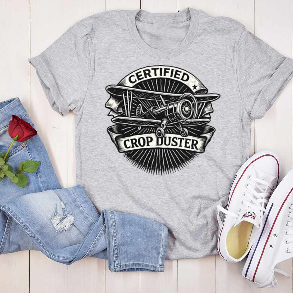 Take your humor to new heights with the Certified Crop Duster T-Shirt. This vintage-inspired design features a retro prop plane surrounded by a bold sunburst and banner, with the cheeky title “Certified Crop Duster” front and center. Whether you’re into aviation or just own your gas with pride, this shirt flies high on laughs.