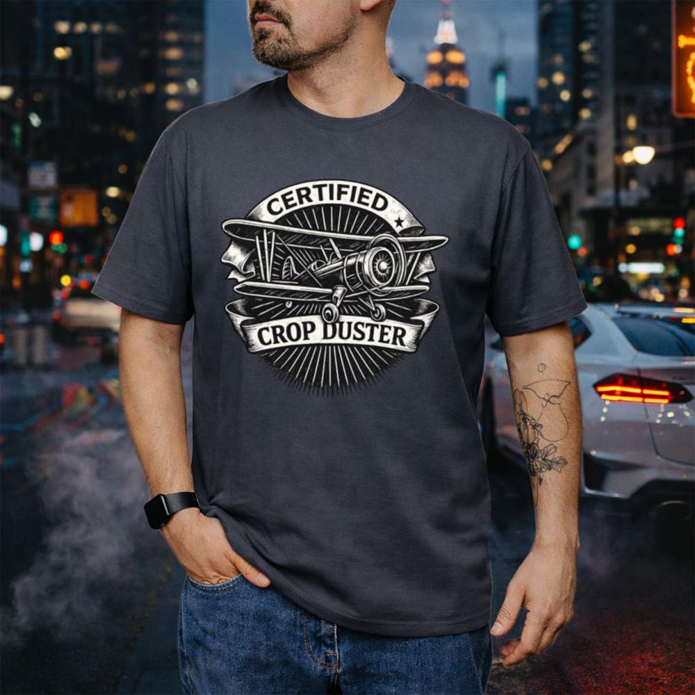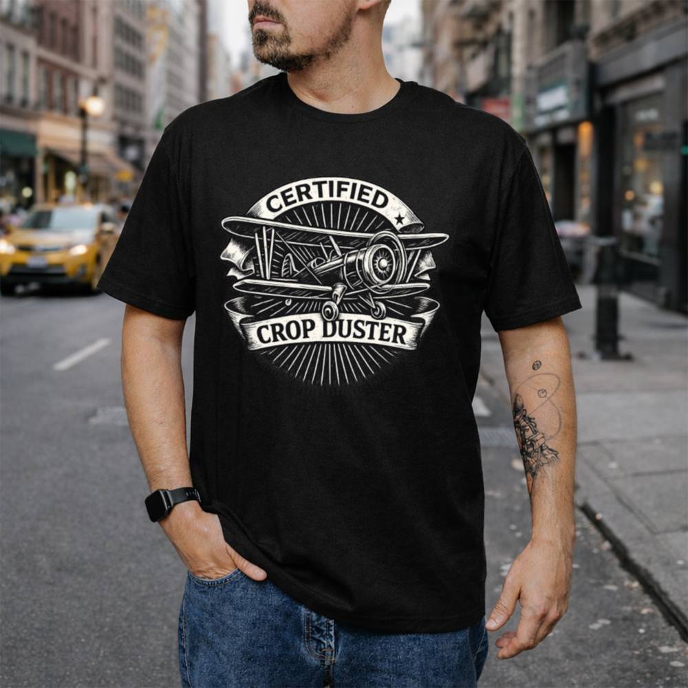 Embrace the gas and grab your Certified Crop Duster T-Shirt today because not all heroes wear capes… some just let it rip.