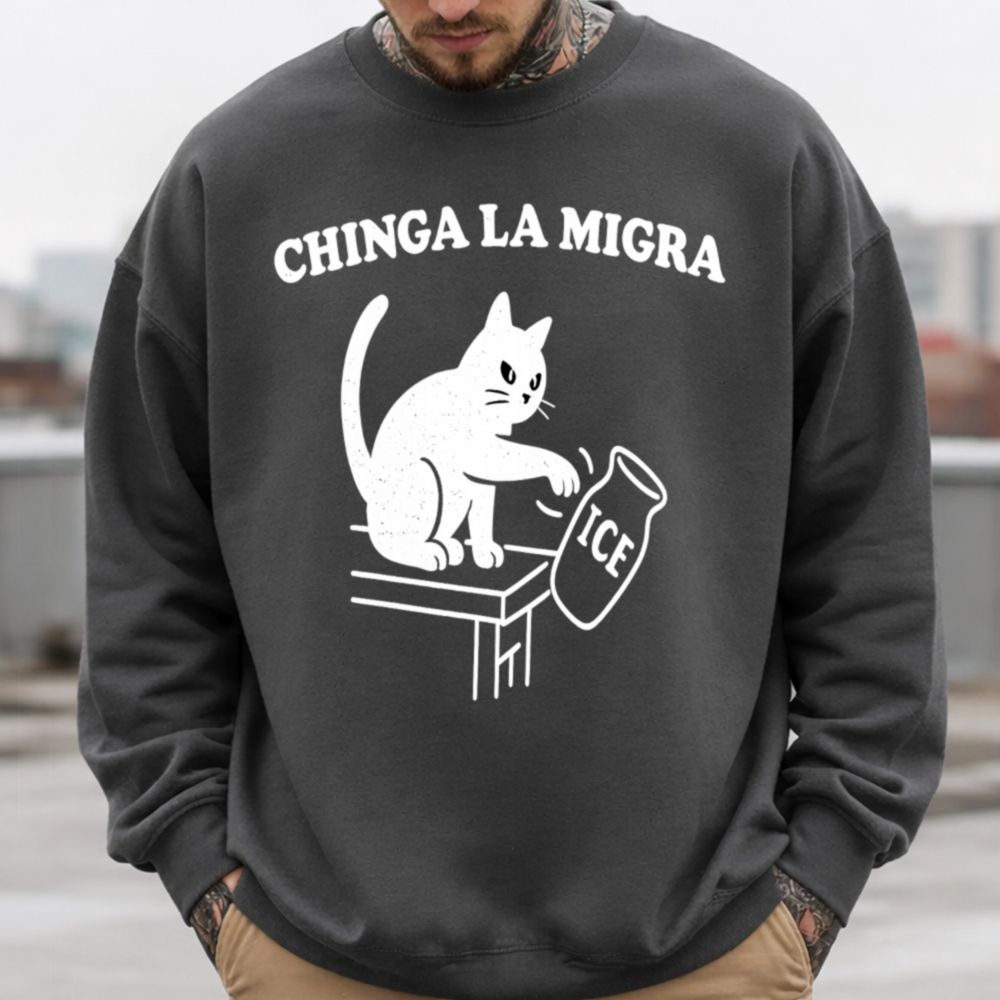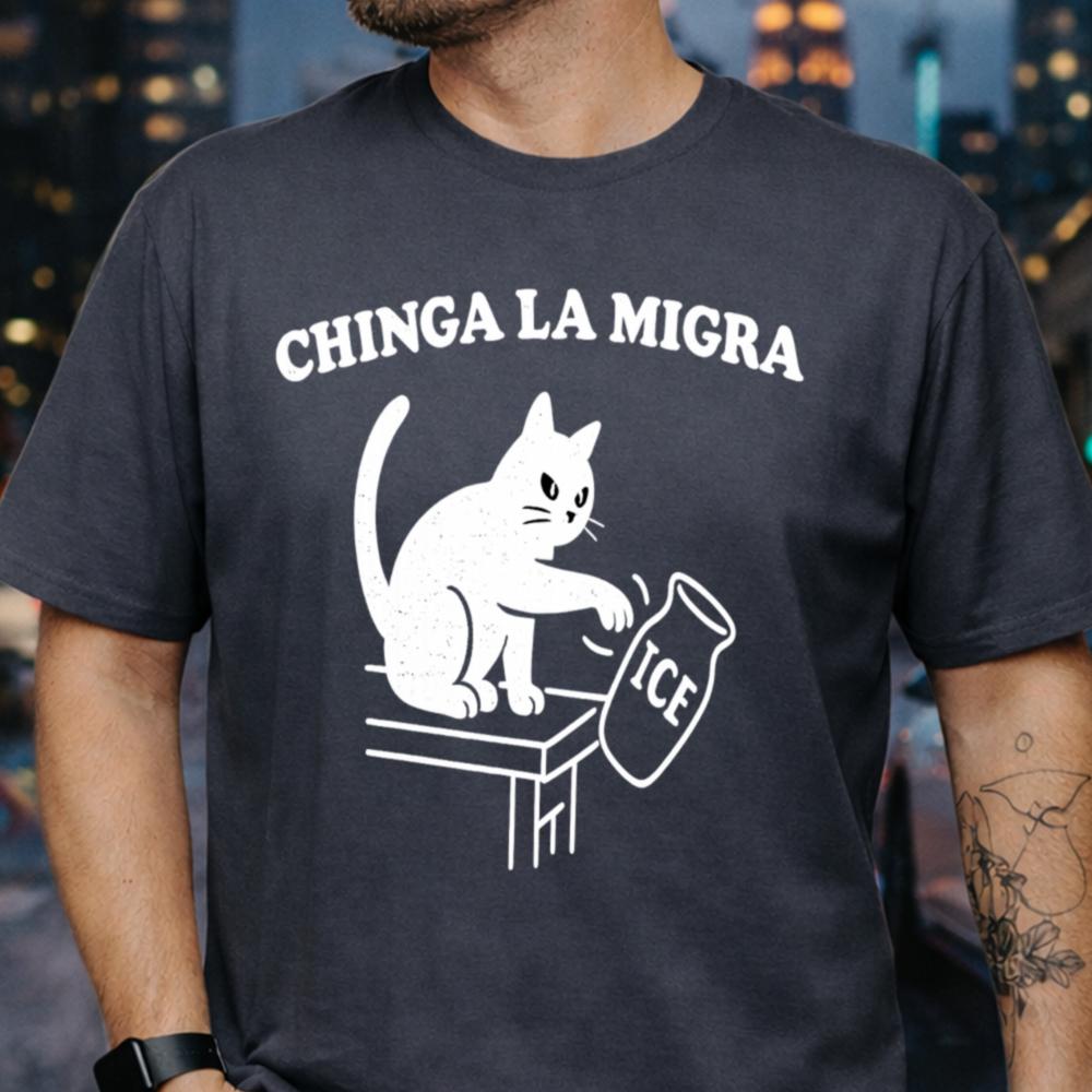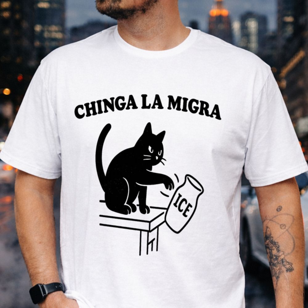 Say it with your chest. The Chinga La Migra T-Shirt is more than just a funny design it’s a loud, unapologetic protest piece. With a smug cat swiping an ICE-labeled jar off a table and the iconic phrase “Chinga La Migra” above it, this shirt takes a clear stand against oppressive immigration enforcement and celebrates immigrant resistance.