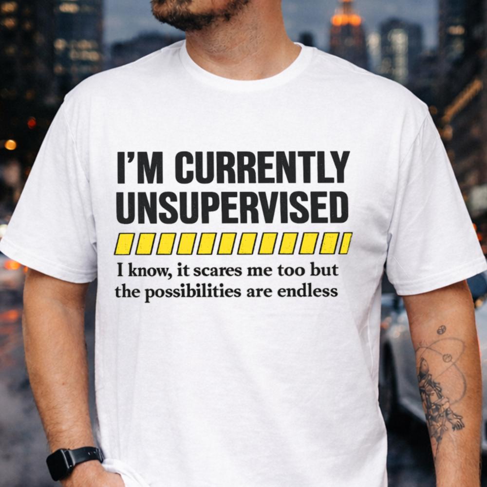Bold. Witty. Slightly dangerous (in the best way). The Currently Unsupervised Funny T-Shirt for Men is made for guys who don’t take themselves too seriously and like it that way. Featuring the hilarious quote “I’m currently unsupervised. I know, it scares me too but the possibilities are endless,” this shirt lets you wear your mischief with pride.