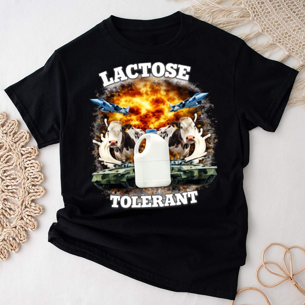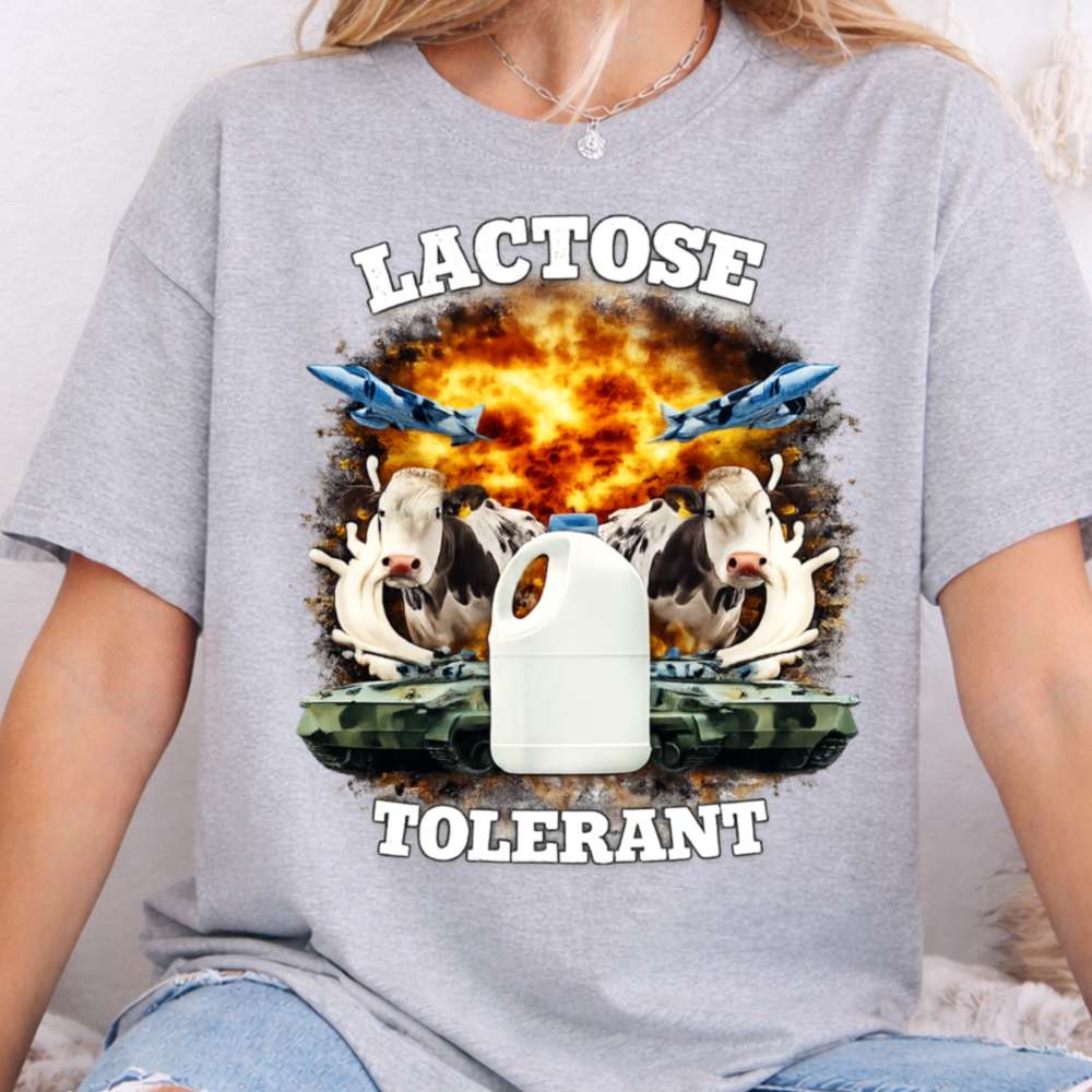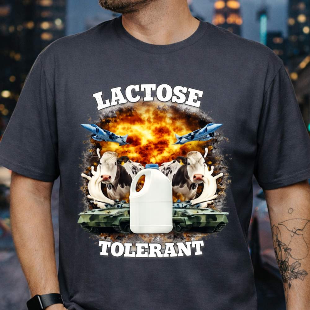 The dark humor inappropriate lactose war satire t-shirt is made for those who treat food sensitivities like full-blown battle stories. Featuring chaotic, over-the-top imagery with dramatic explosions, cows, and bold lettering, this design transforms everyday dairy struggles into outrageous satire.