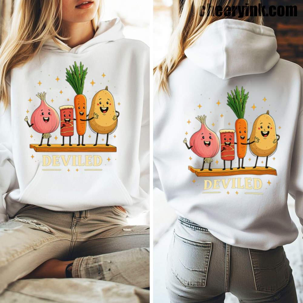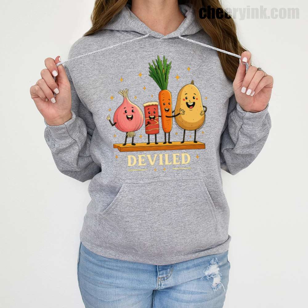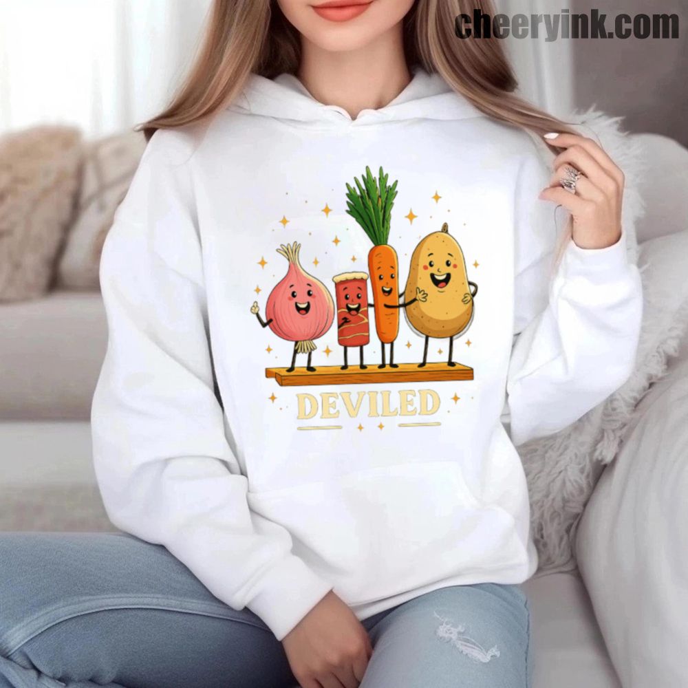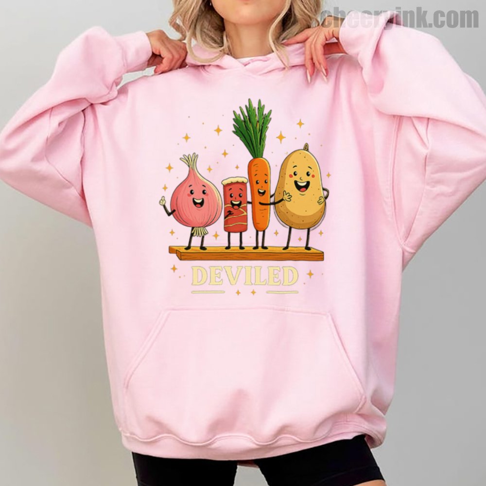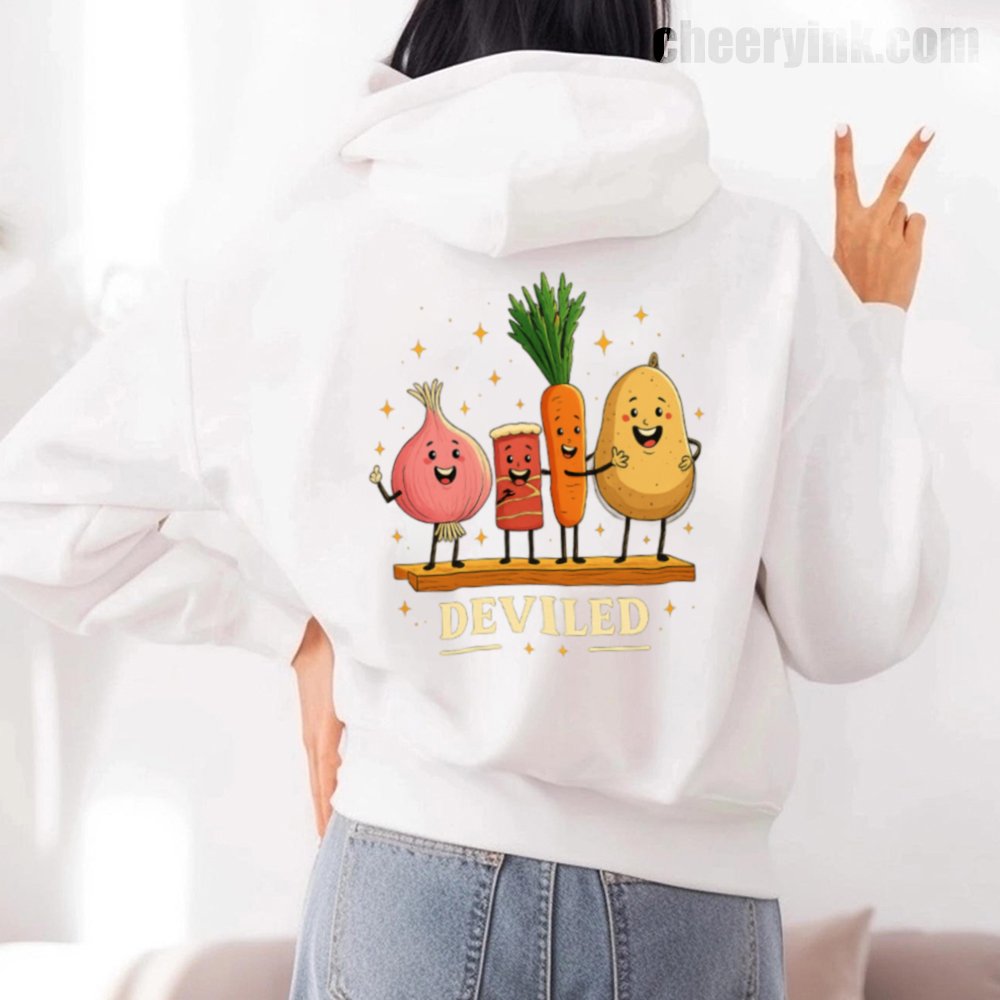 Meet your new go-to comfort piece the Deviled Hoodie, where food and fun collide in one adorable, pun-filled design. Featuring cheerful cartoon versions of your favorite kitchen staples looking mischievously “deviled,” this hoodie adds a touch of personality to any casual outfit.