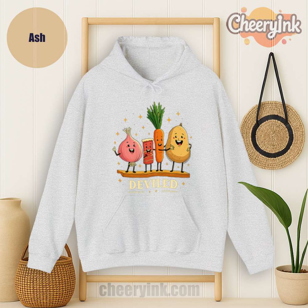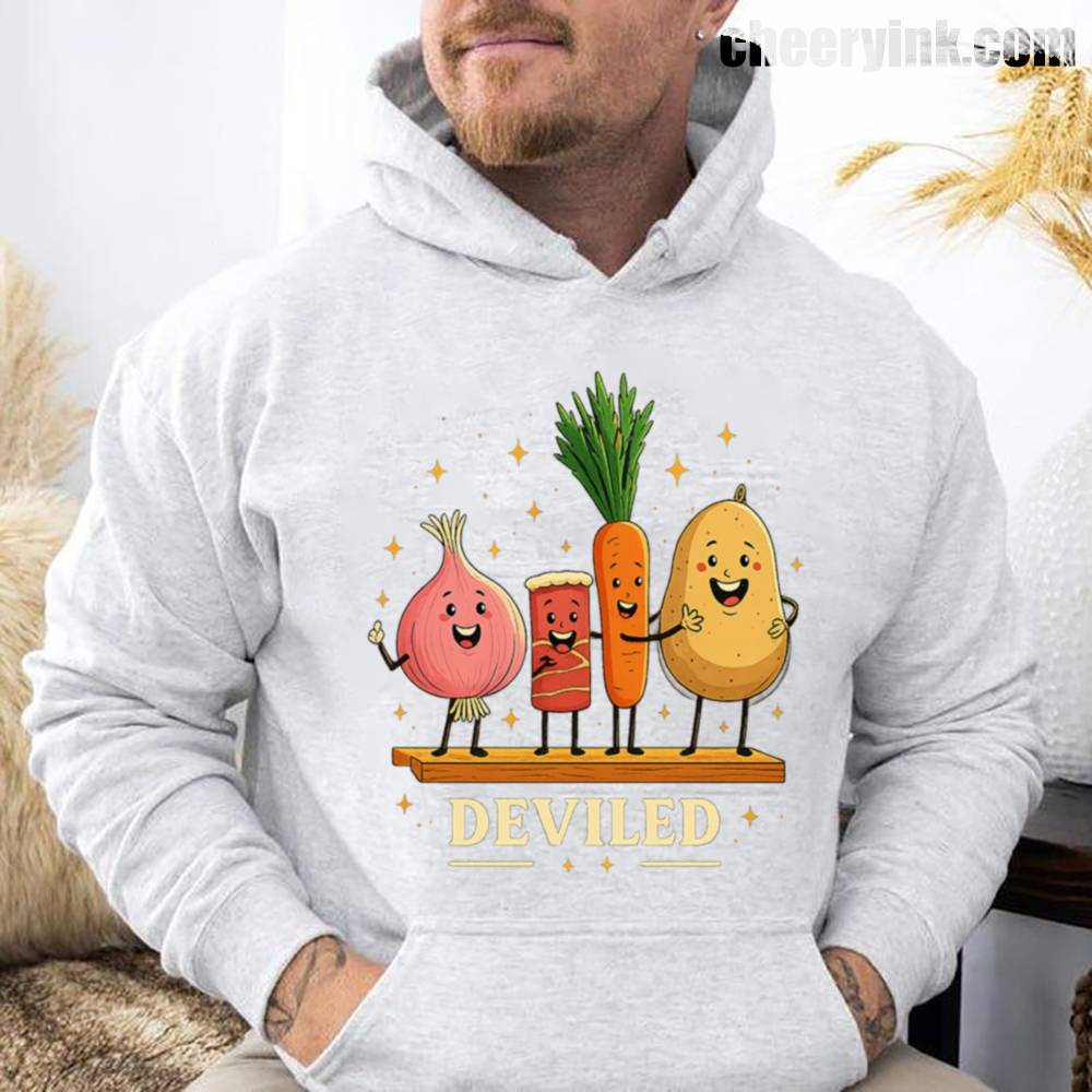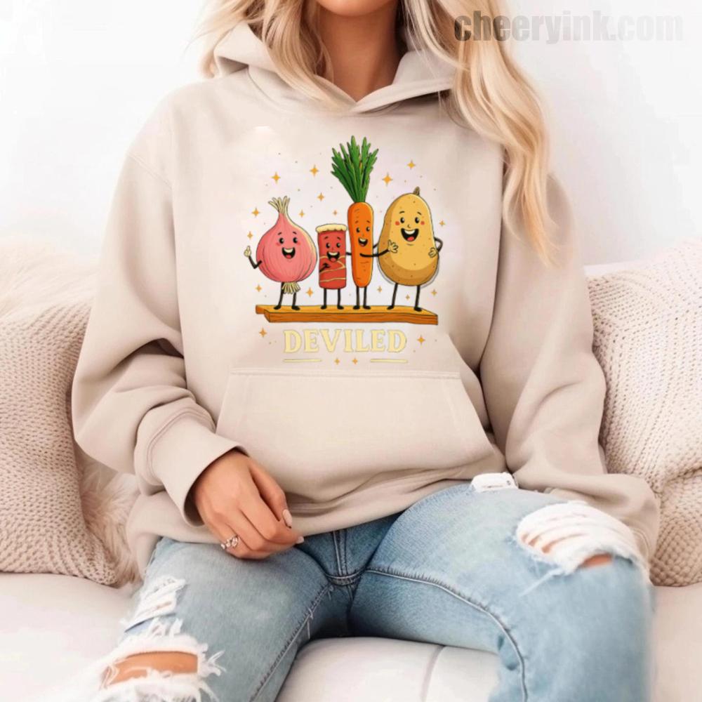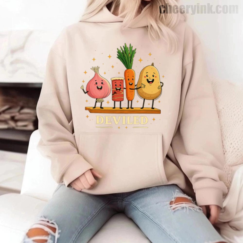 Meet your new go-to comfort piece the Deviled Hoodie, where food and fun collide in one adorable, pun-filled design. Featuring cheerful cartoon versions of your favorite kitchen staples looking mischievously “deviled,” this hoodie adds a touch of personality to any casual outfit.