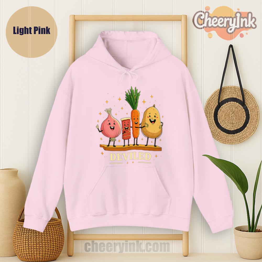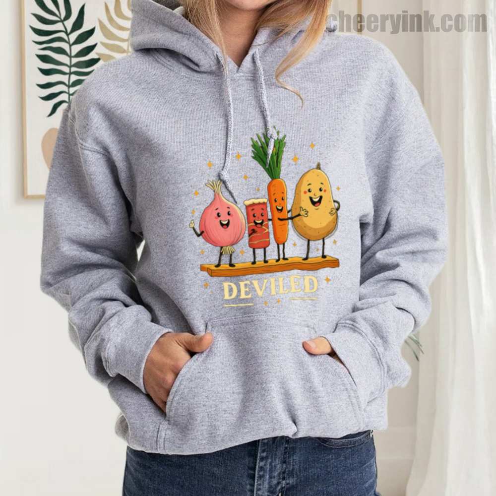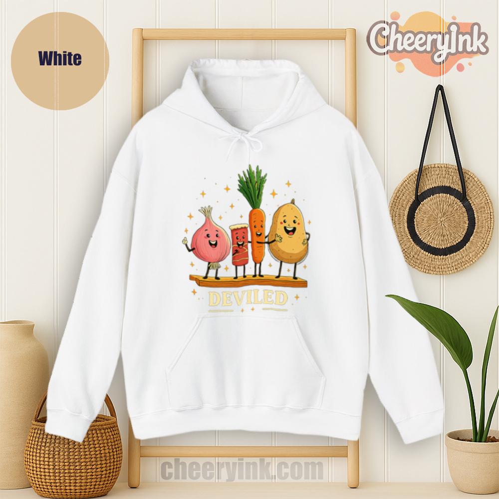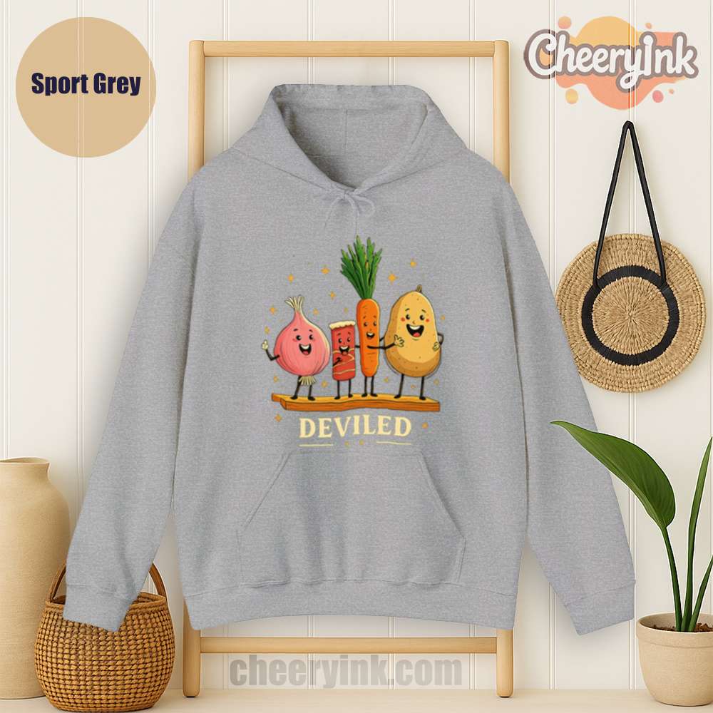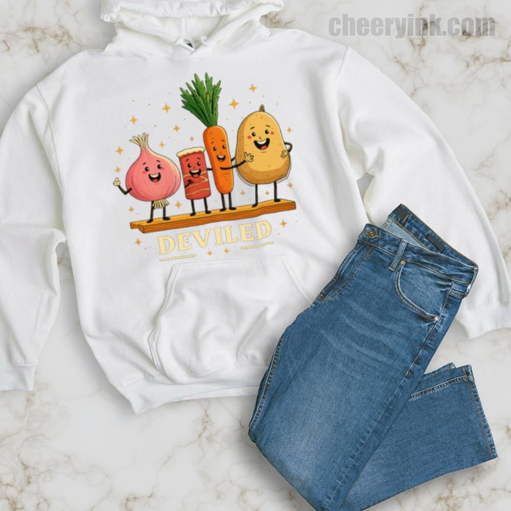Meet your new go-to comfort piece the Deviled Hoodie, where food and fun collide in one adorable, pun-filled design. Featuring cheerful cartoon versions of your favorite kitchen staples looking mischievously “deviled,” this hoodie adds a touch of personality to any casual outfit.