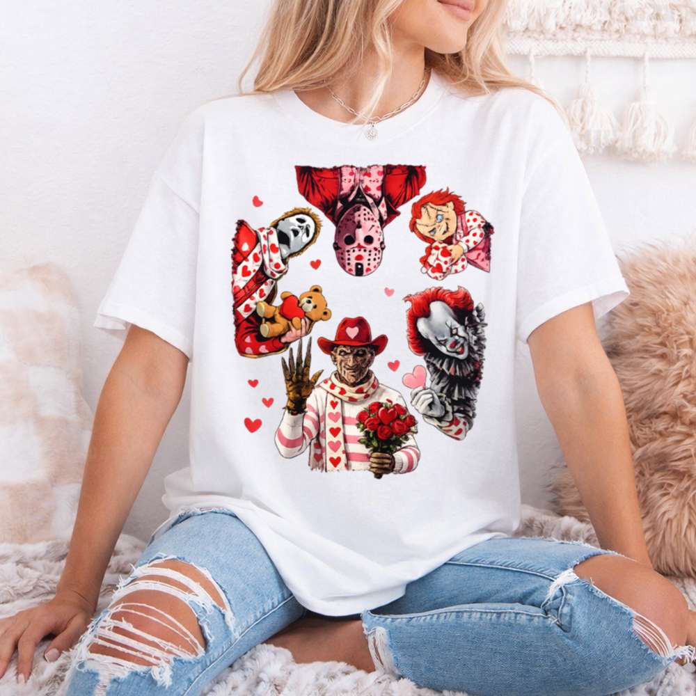 Crafted from soft, breathable cotton and designed for a unisex fit, this shirt feels great whether you’re cuddling up for a scary movie night or heading out for a Valentine’s date with dark-humored flair. The bold, vibrant graphic is perfect for horror fans who enjoy irony, parody, or showing off their cult-movie love.