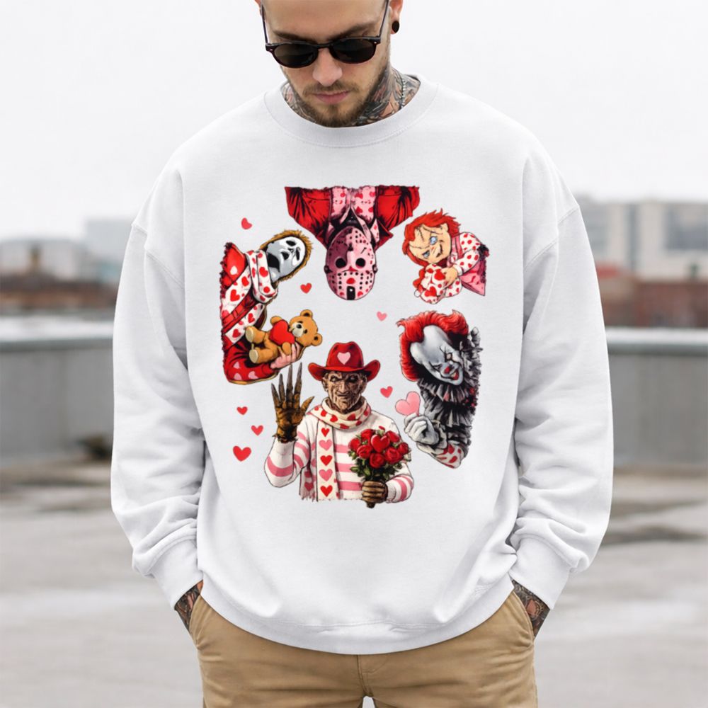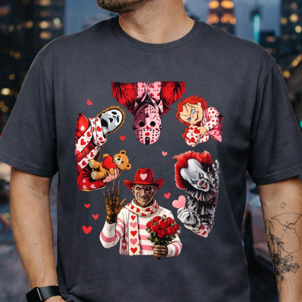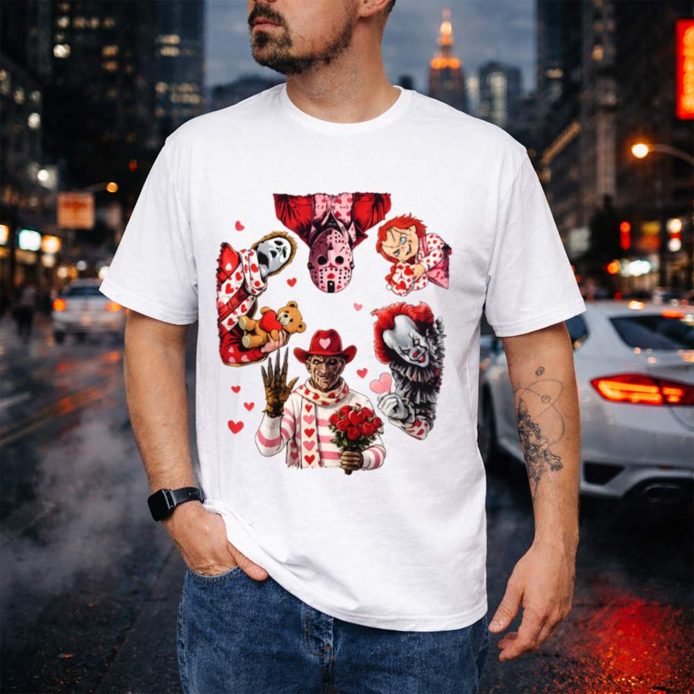 Celebrate Valentine’s Day with a killer twist in our Funny Horror Valentine T-Shirt. This design mashes up horror royalty Michael, Jason, Freddy, Chucky, Pennywise, and Ghostface into a heart-filled, bloodless display of affection. Decked out in pinks, reds, scarves, hearts, roses, and teddy bears, these notorious icons are suddenly… adorable?