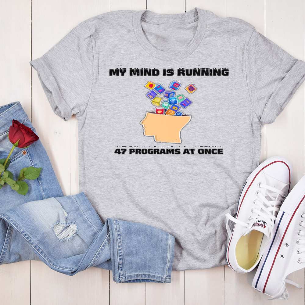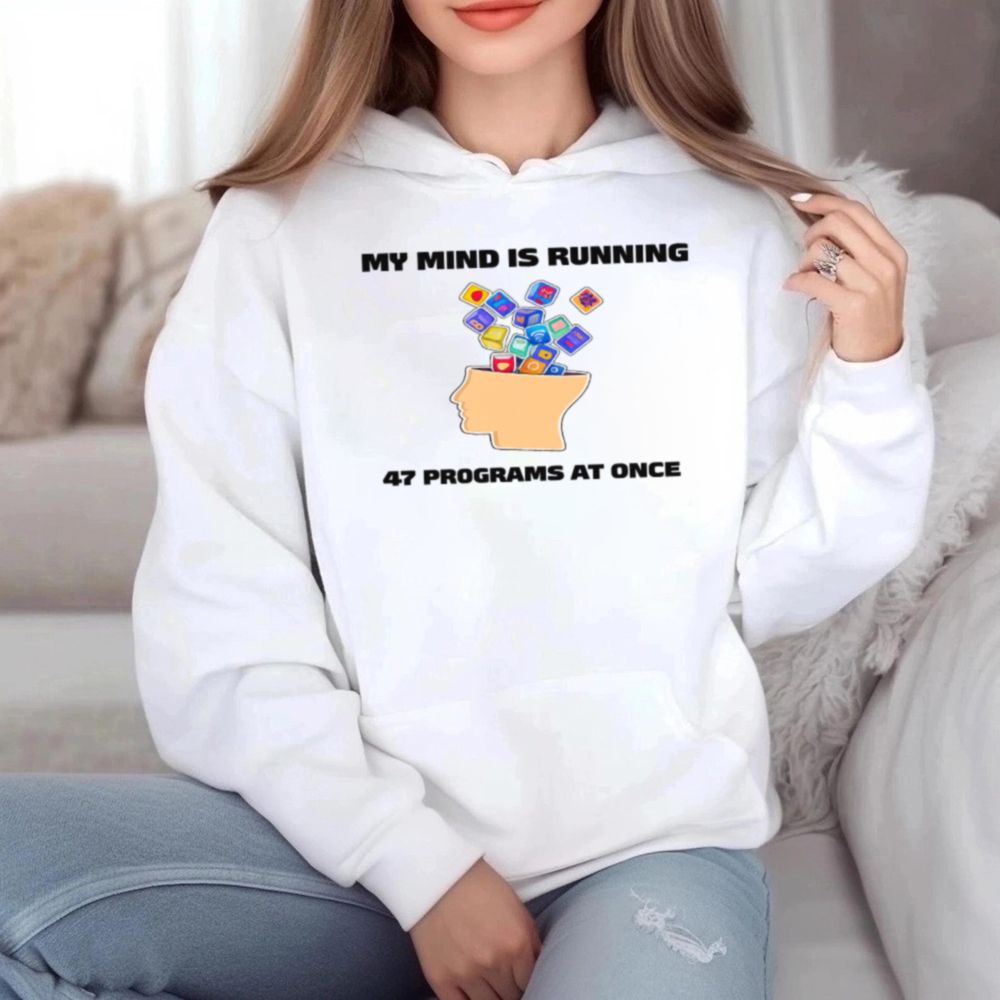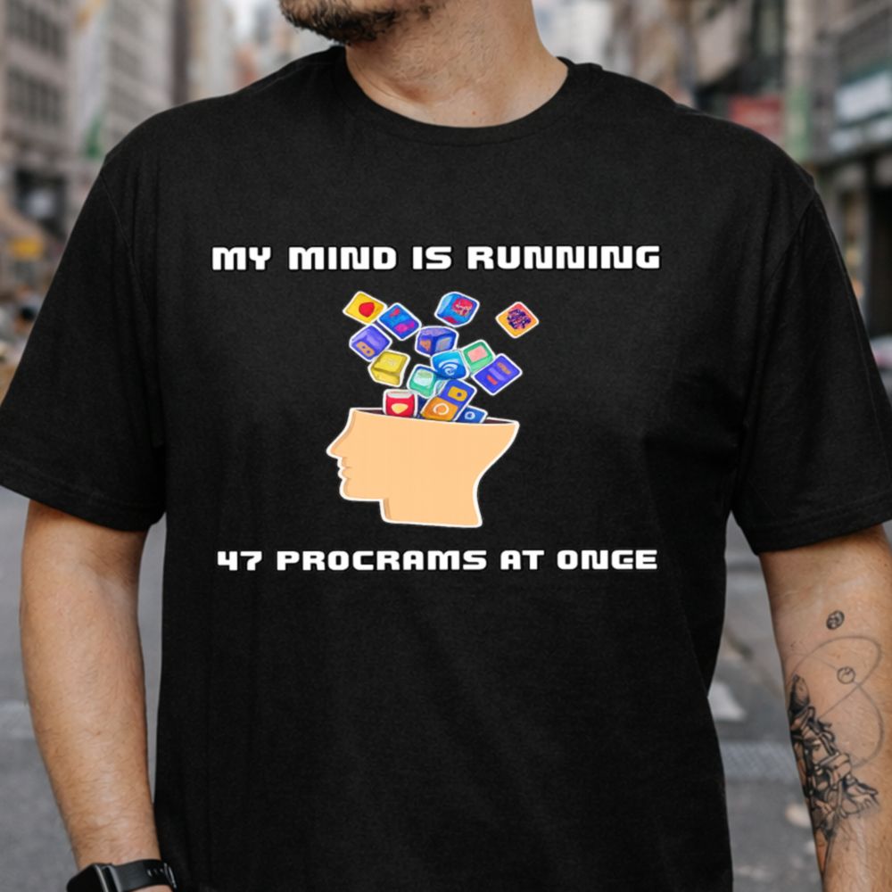 If your thoughts never arrive one at a time, this design will feel painfully accurate. The funny overthinking multitask mind t-shirt captures the mental overload of running dozens of ideas simultaneously, even when you’re doing absolutely nothing. With a playful visual of thoughts spilling out like active apps, it turns internal chaos into relatable humor.