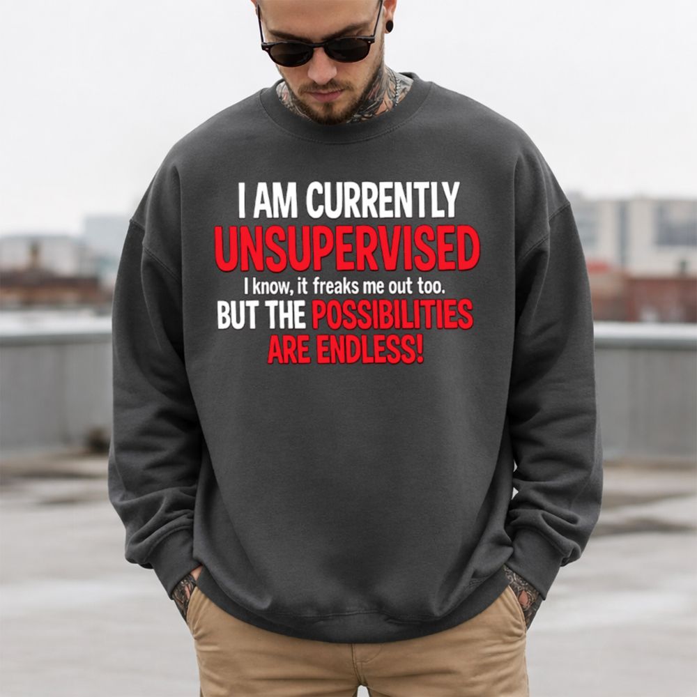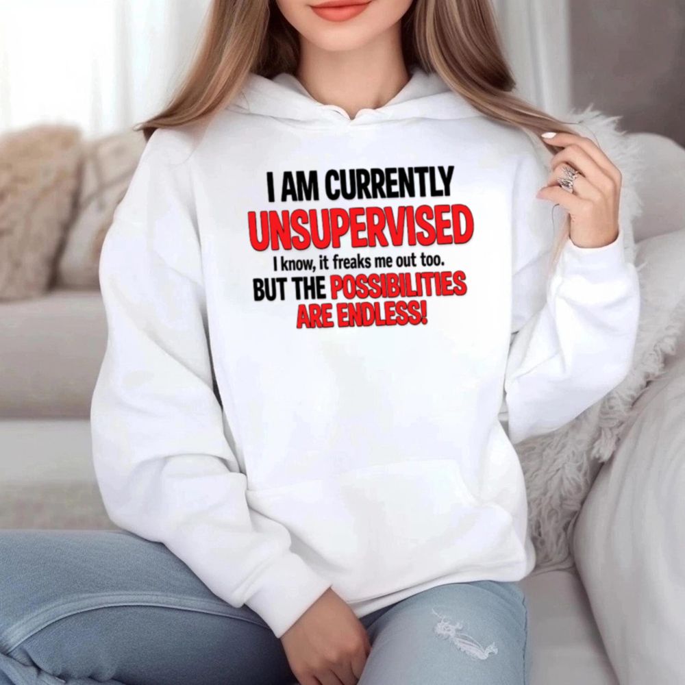 The I Am Currently Unsupervised T-Shirt is a hilarious must-have for the mischief-makers and class clowns of the world. With bold red lettering and chaotic energy, this unisex tee delivers a clear warning (and invitation): the possibilities are endless, and someone let you out unsupervised. Soft, funny, and dangerously fun.