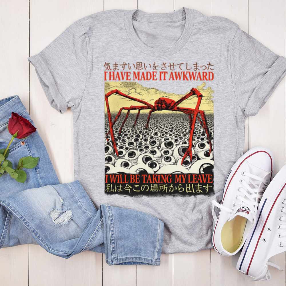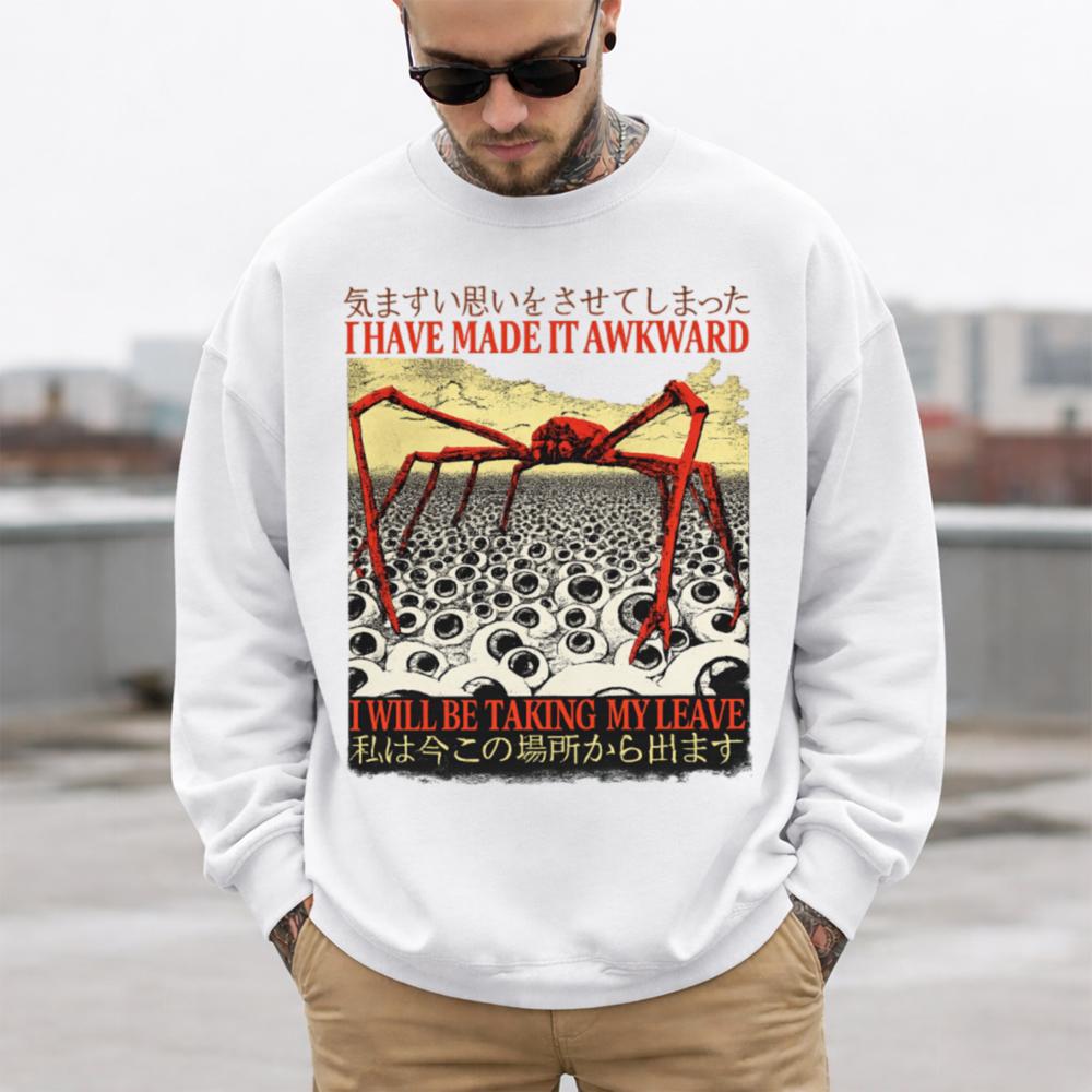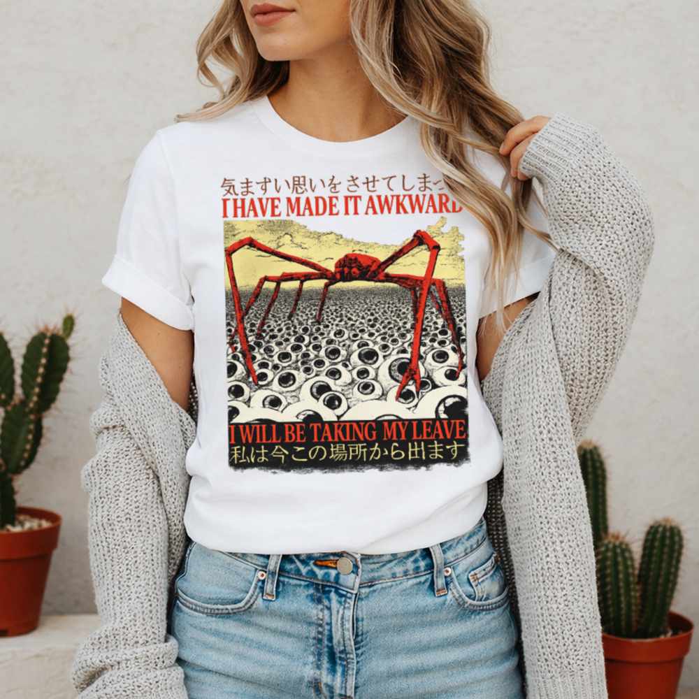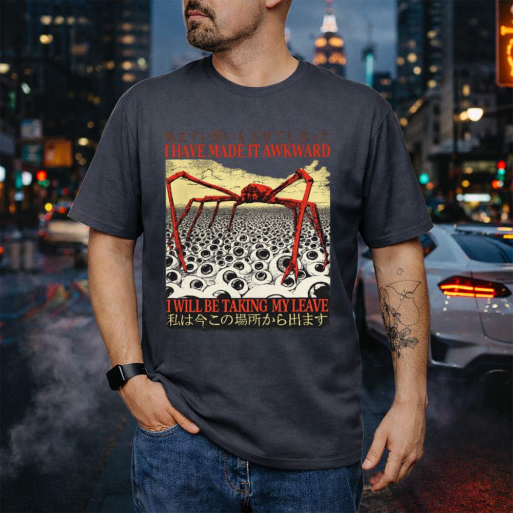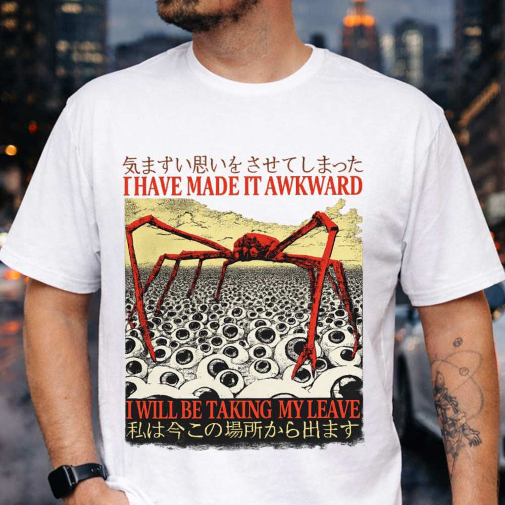 When words fail and the silence is deafening, the I Have Made It Awkward T-Shirt says it all so you don’t have to. This bold design features a giant red spider poised to exit stage left over a crowd of judging eyeballs. With the captions “I HAVE MADE IT AWKWARD” and “I WILL BE TAKING MY LEAVE”, it’s a painfully relatable tribute to social missteps and introvert struggles.
