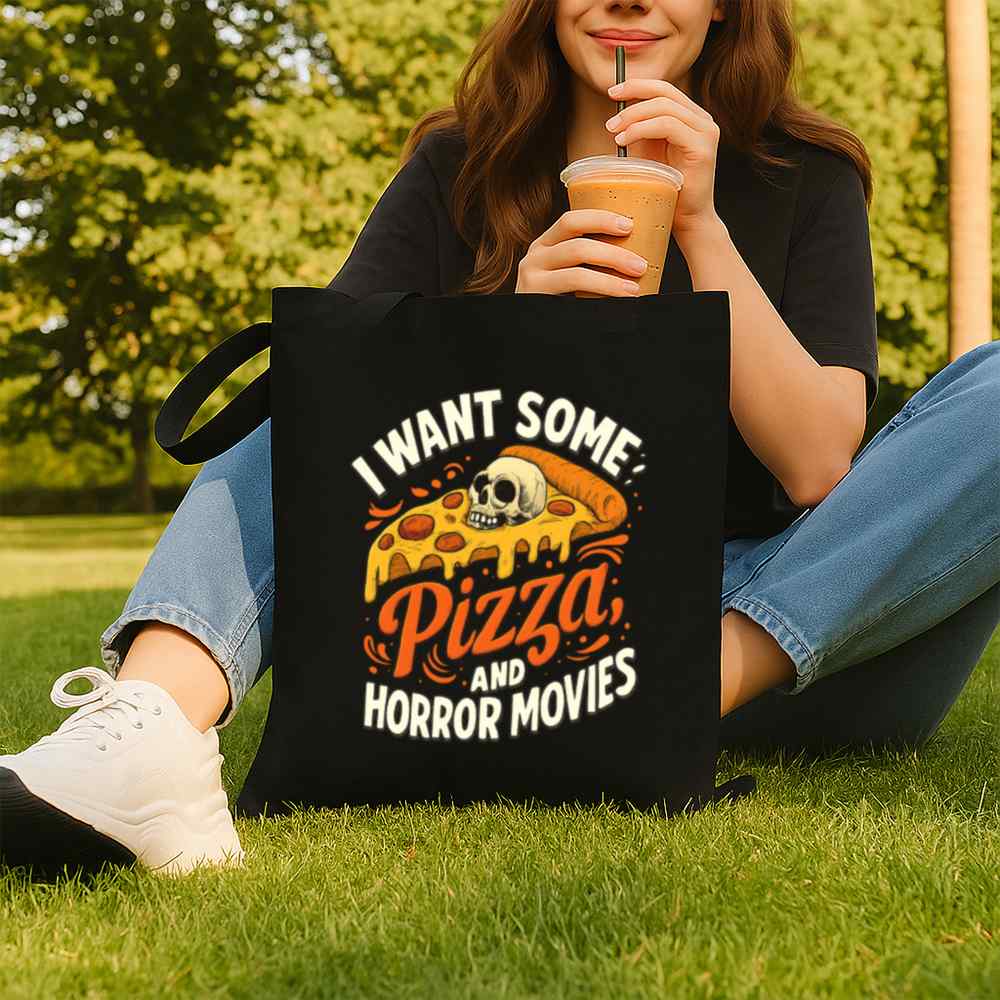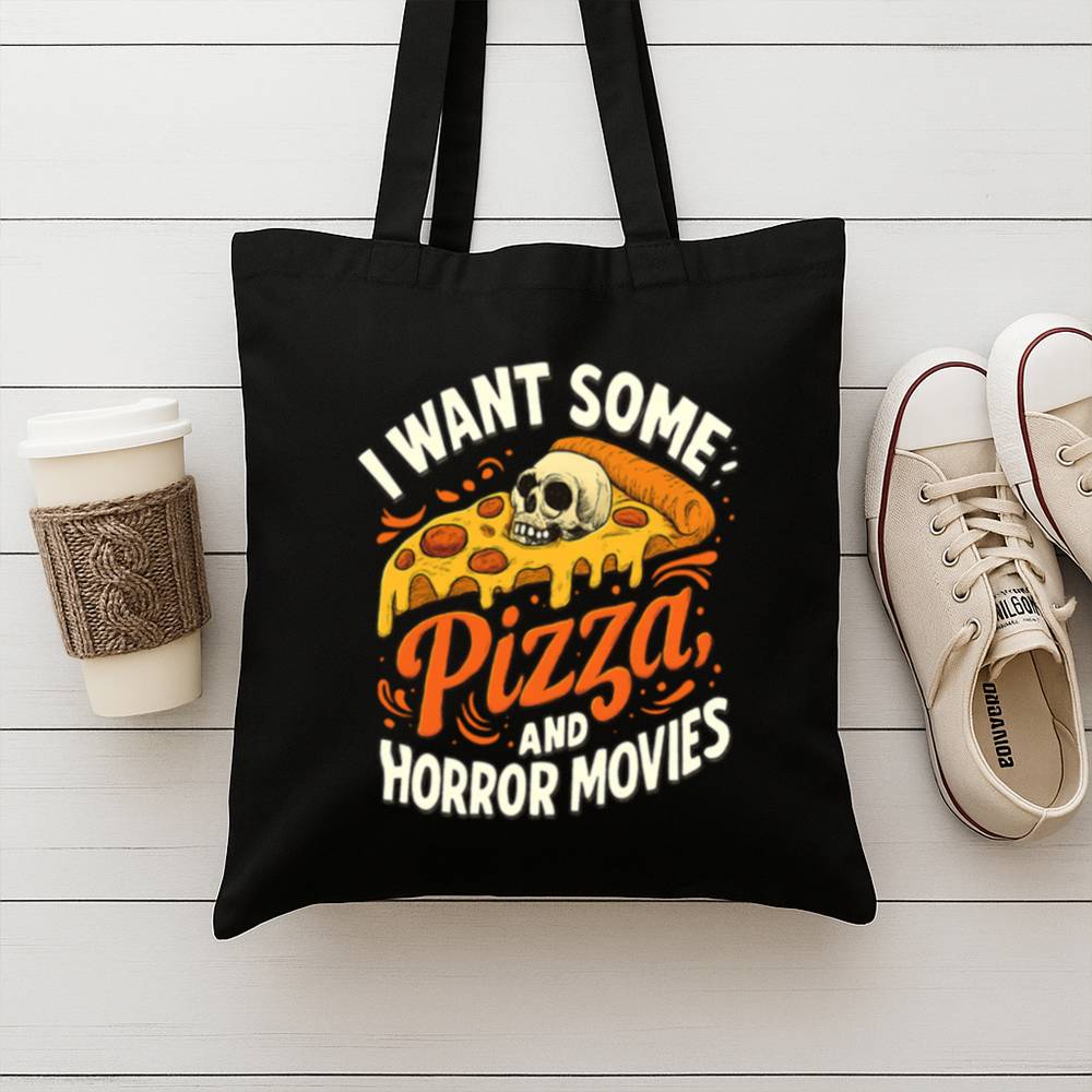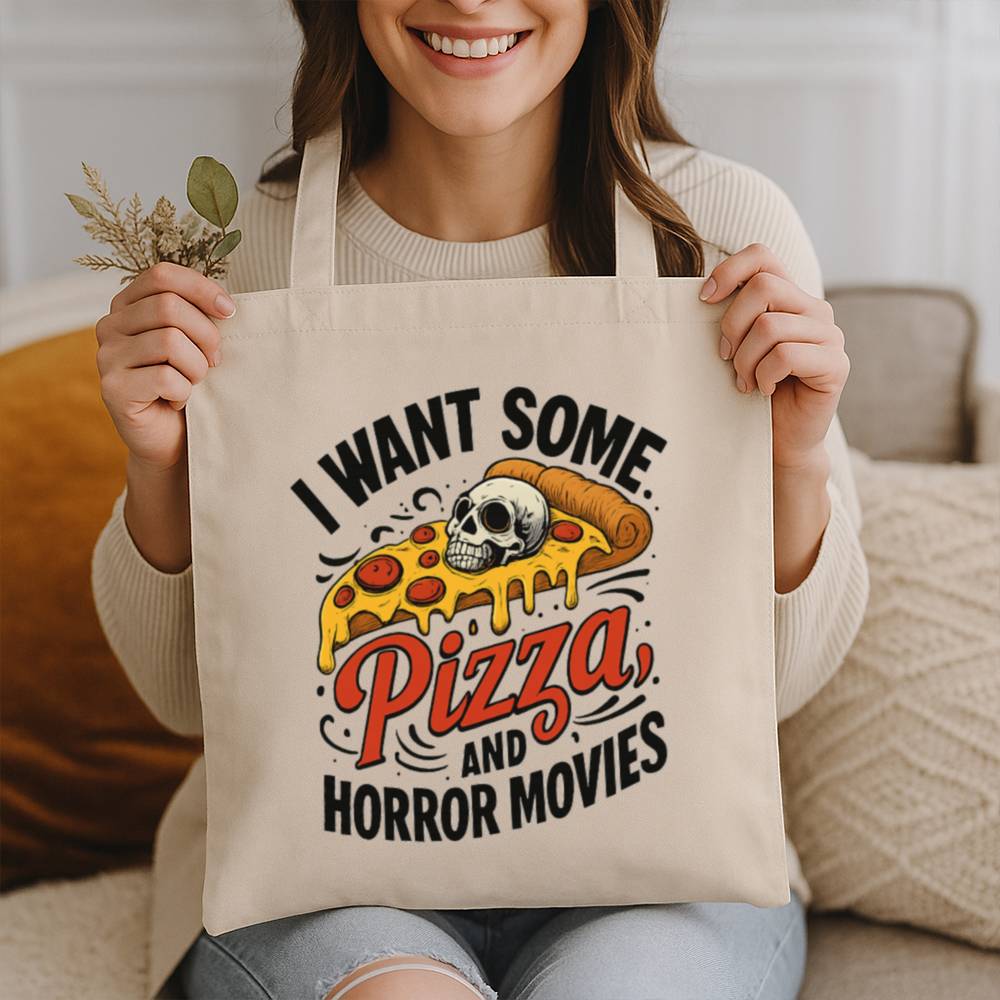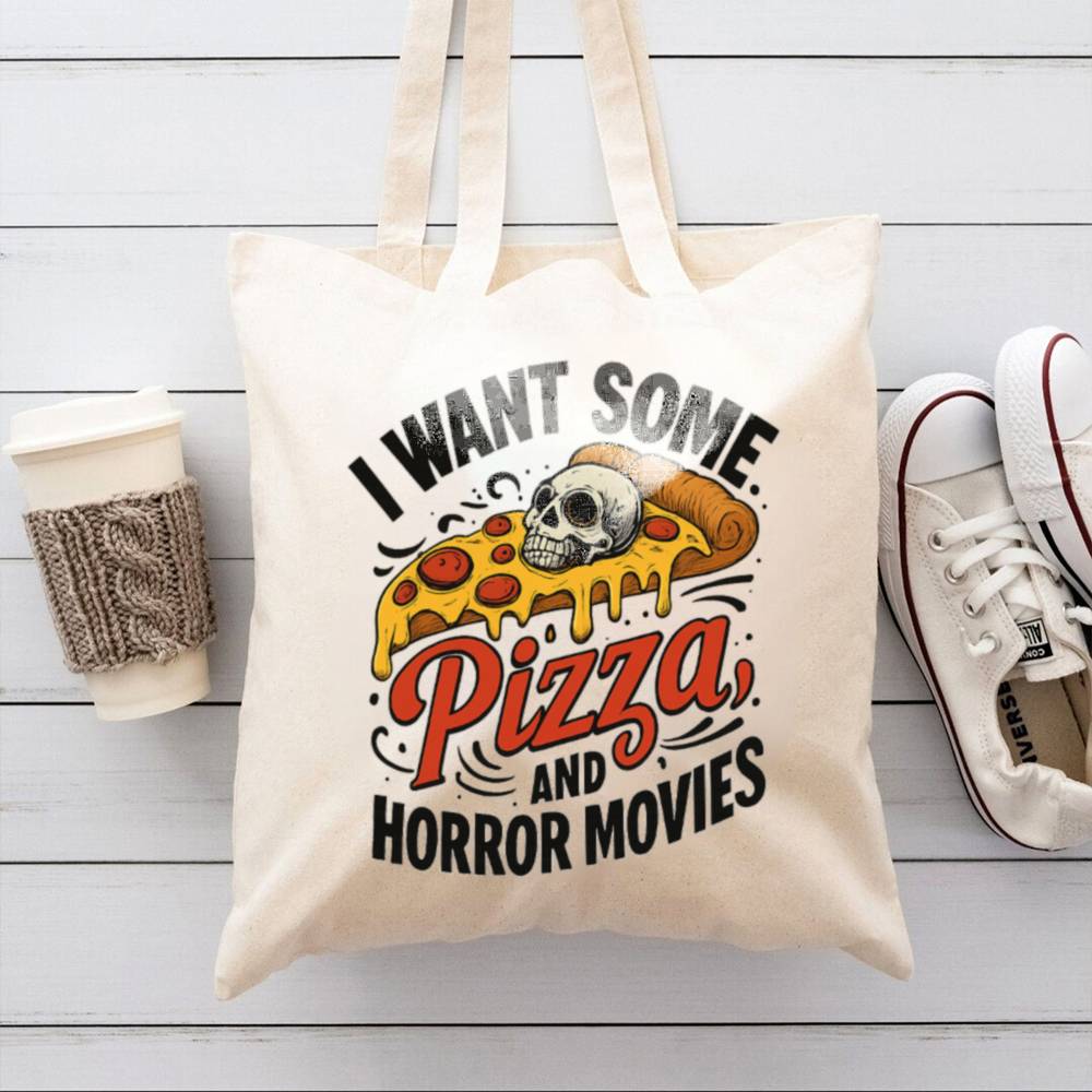 Why carry boring bags when you can carry your spooky sense of humor everywhere you go? The I Want Some Pizza and Horror Movies tote bag. tote bag is a fun, eco-friendly accessory for horror lovers and pizza fans alike. Featuring a skull resting on a gooey slice of pizza, it’s a bold design that gets noticed.