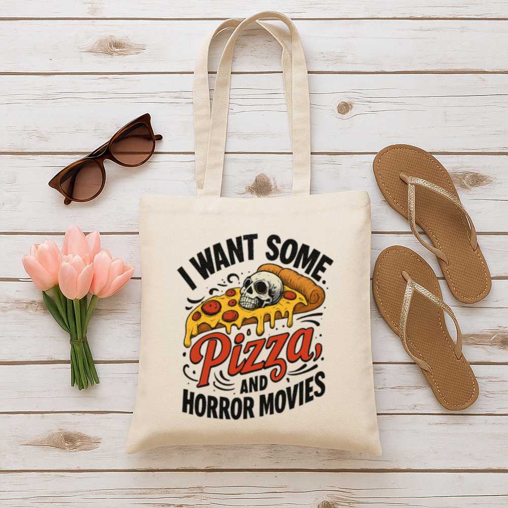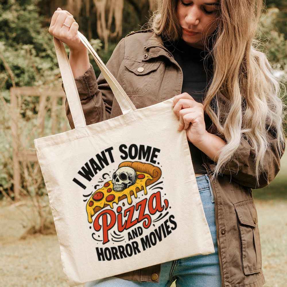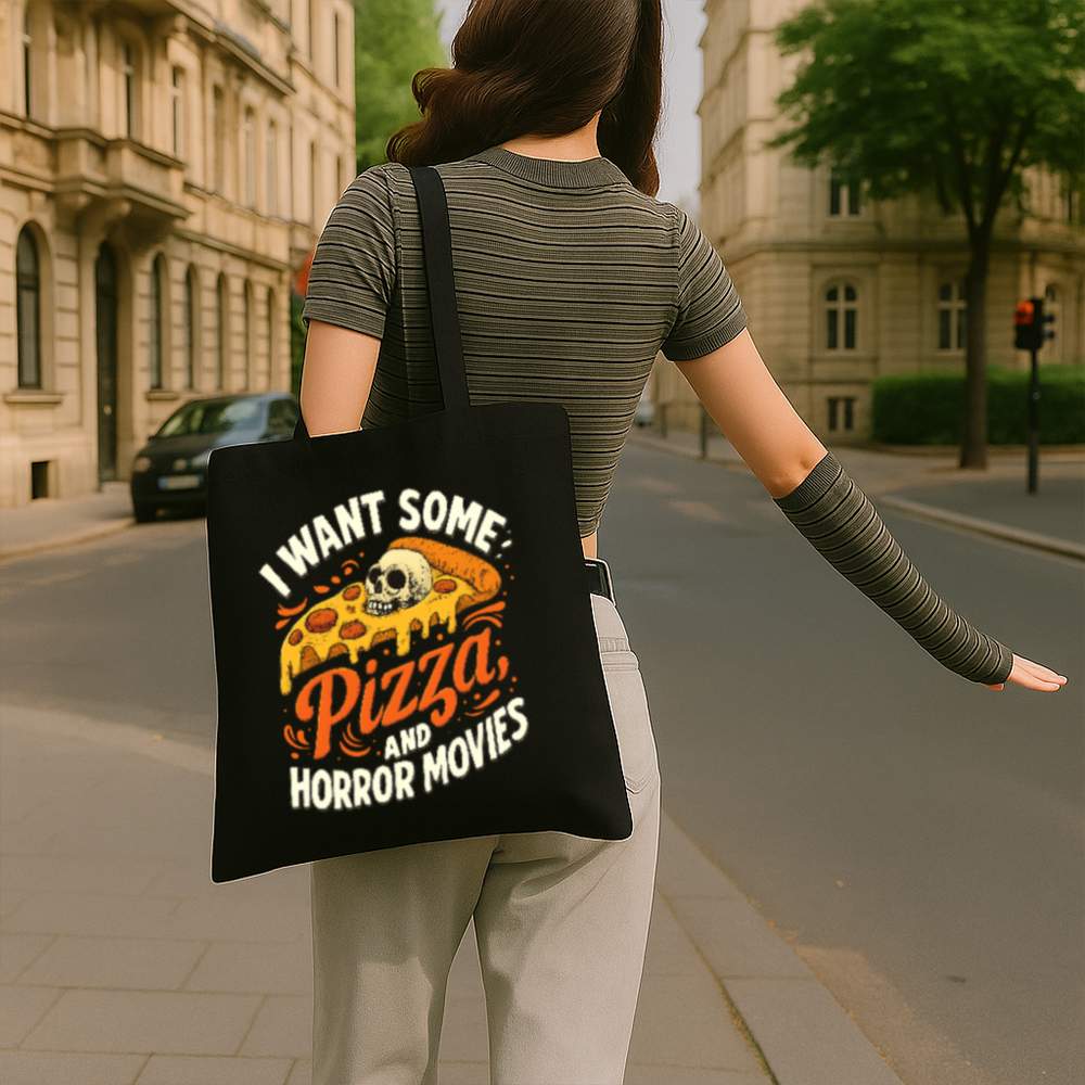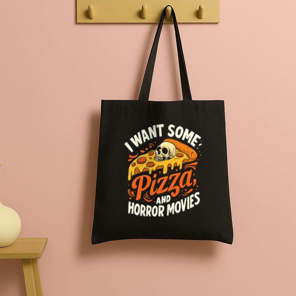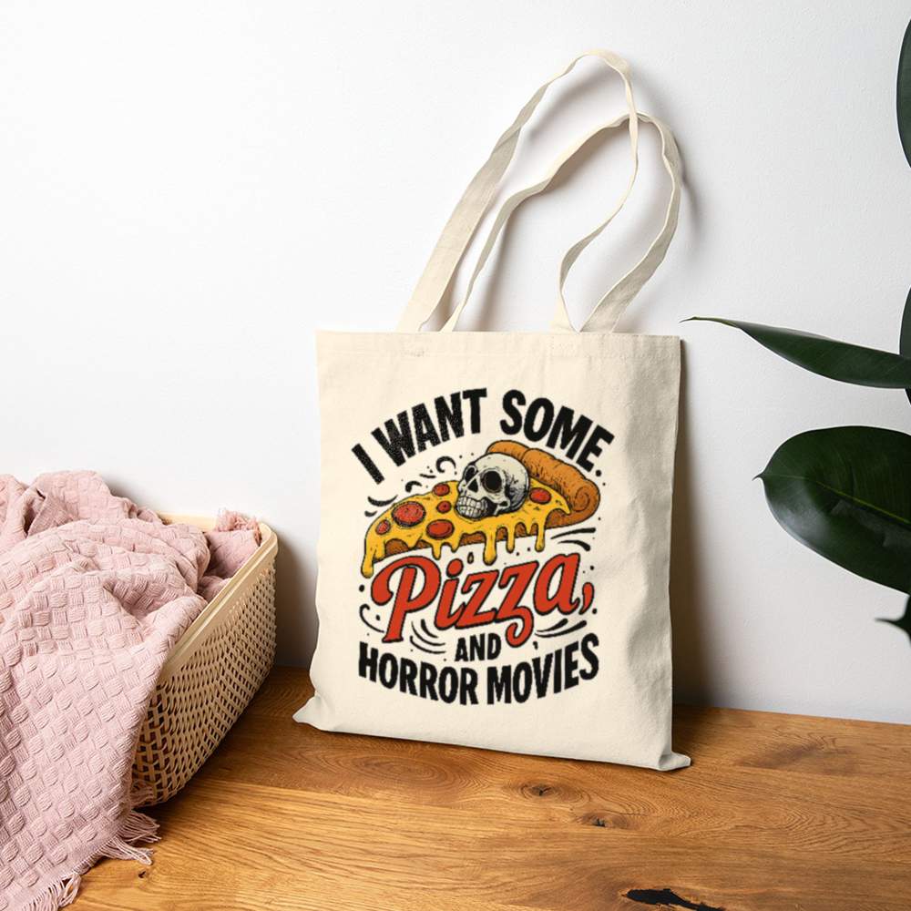Why carry boring bags when you can carry your spooky sense of humor everywhere you go? The I Want Some Pizza and Horror Movies tote bag. tote bag is a fun, eco-friendly accessory for horror lovers and pizza fans alike. Featuring a skull resting on a gooey slice of pizza, it’s a bold design that gets noticed.