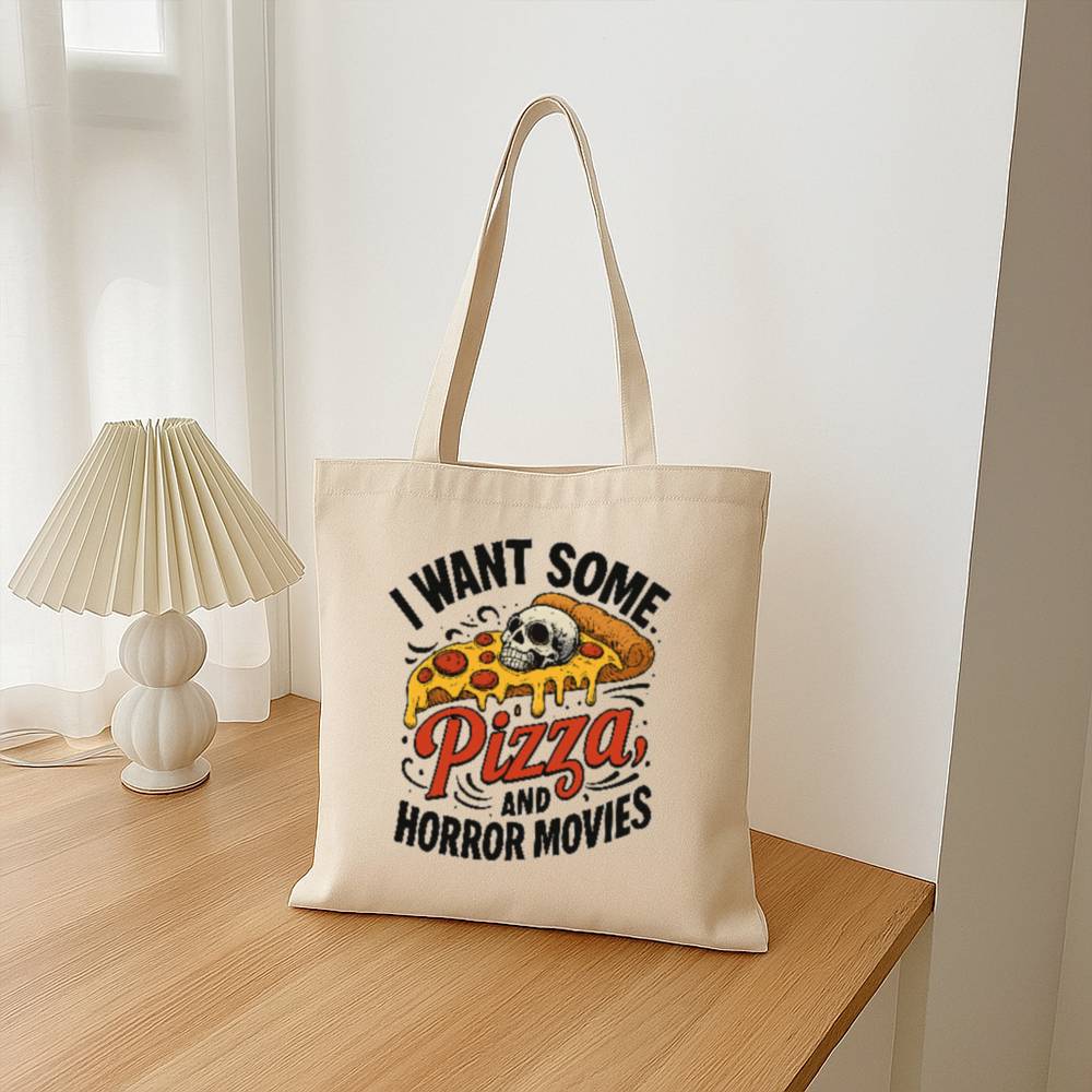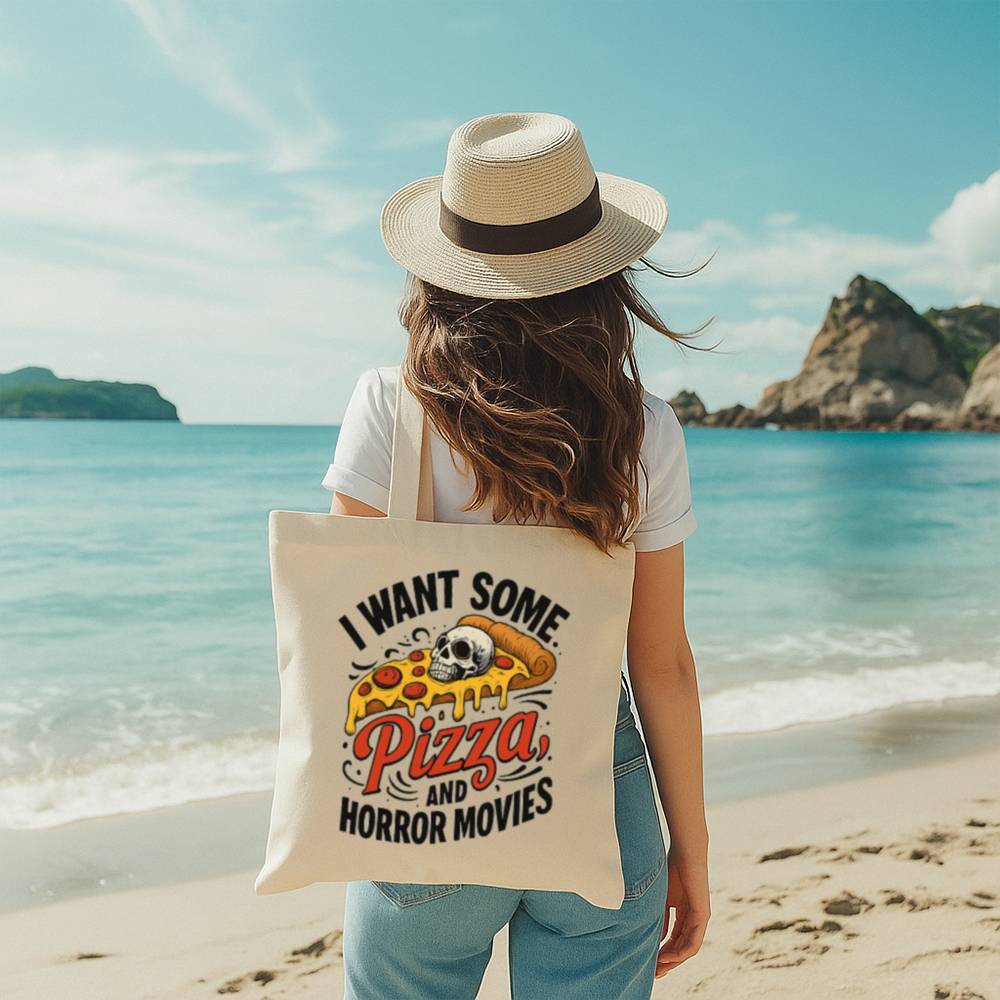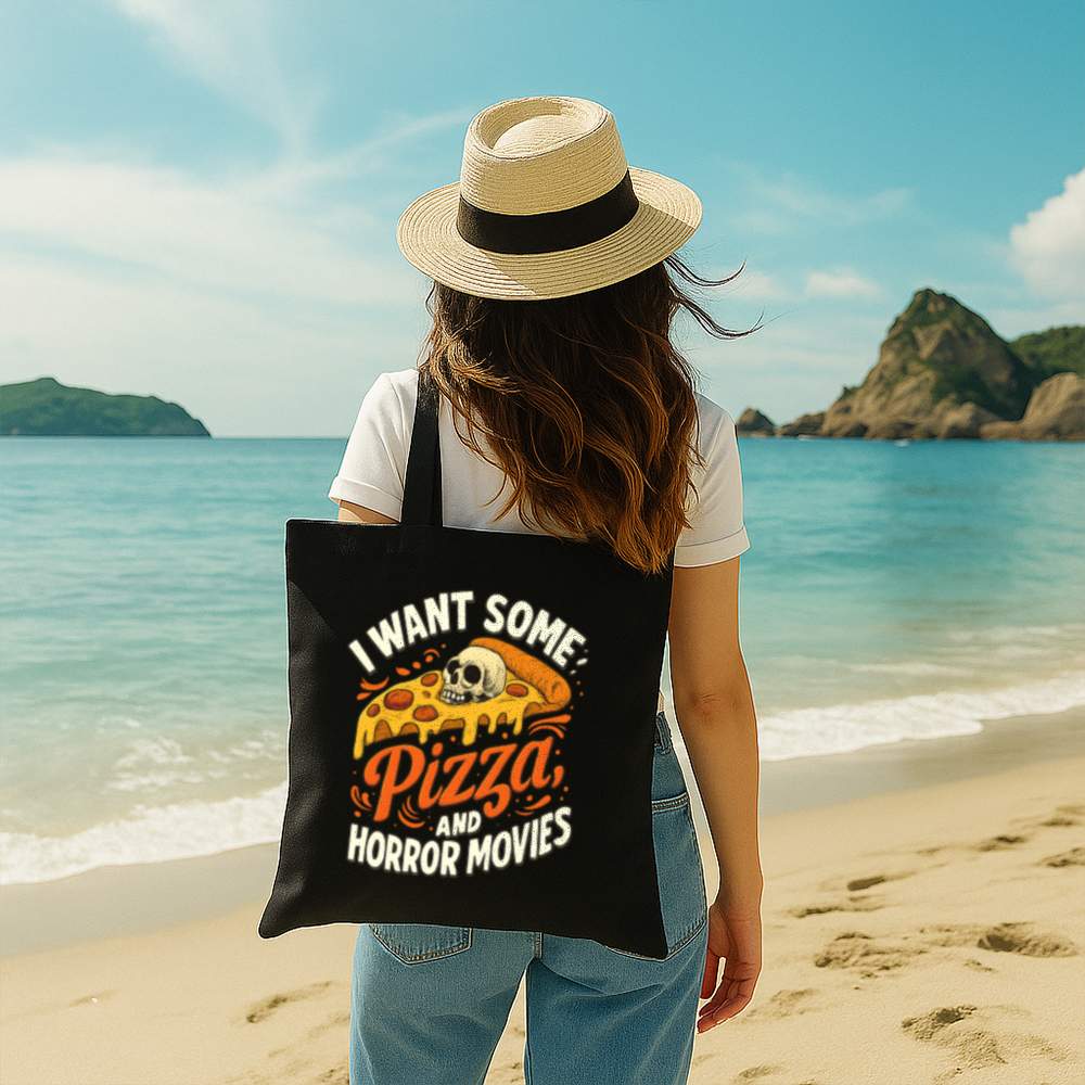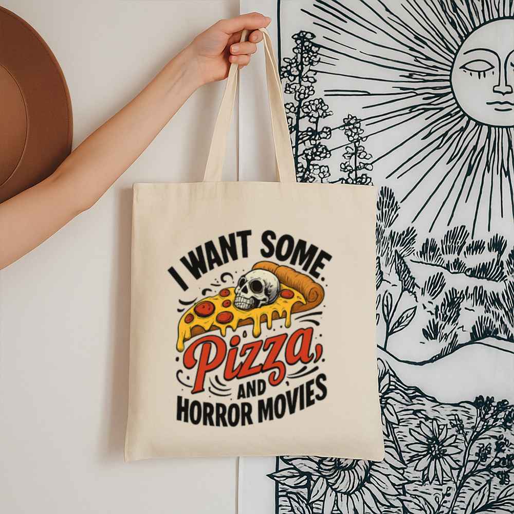 Why carry boring bags when you can carry your spooky sense of humor everywhere you go? The I Want Some Pizza and Horror Movies tote bag. tote bag is a fun, eco-friendly accessory for horror lovers and pizza fans alike. Featuring a skull resting on a gooey slice of pizza, it’s a bold design that gets noticed.