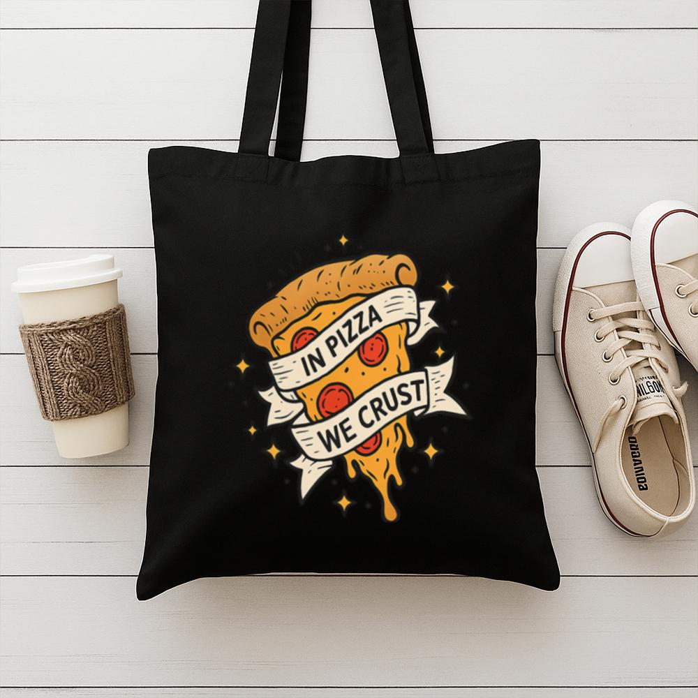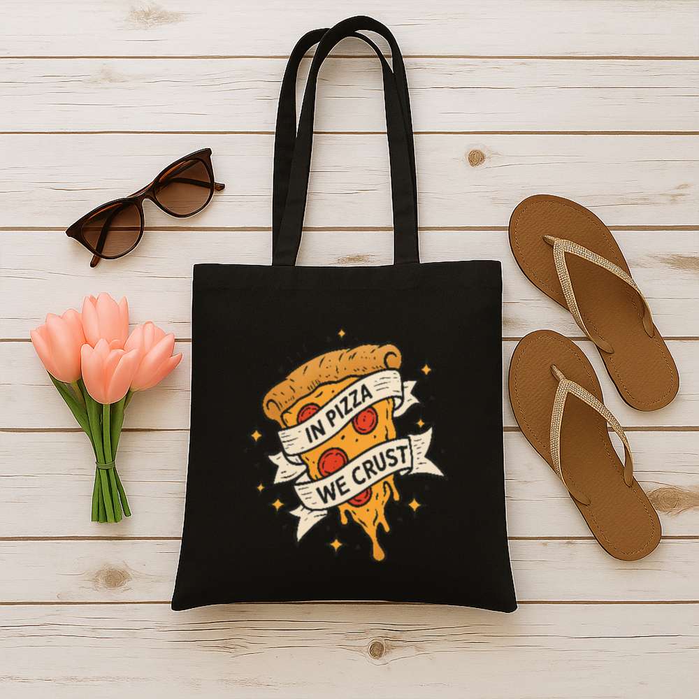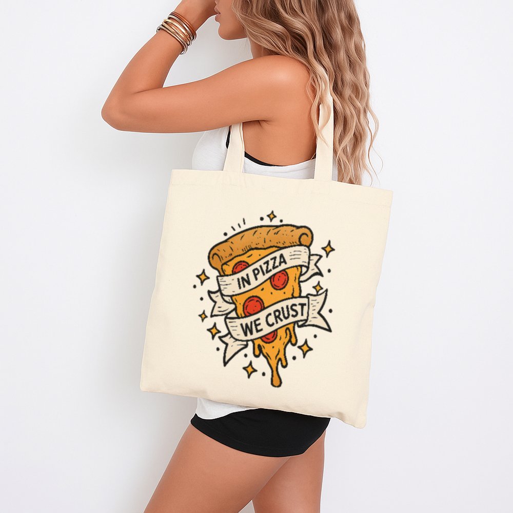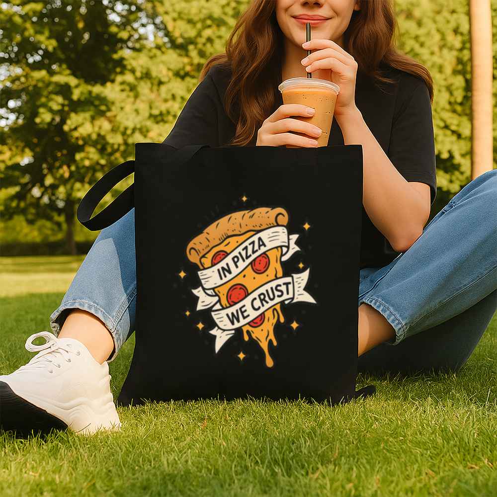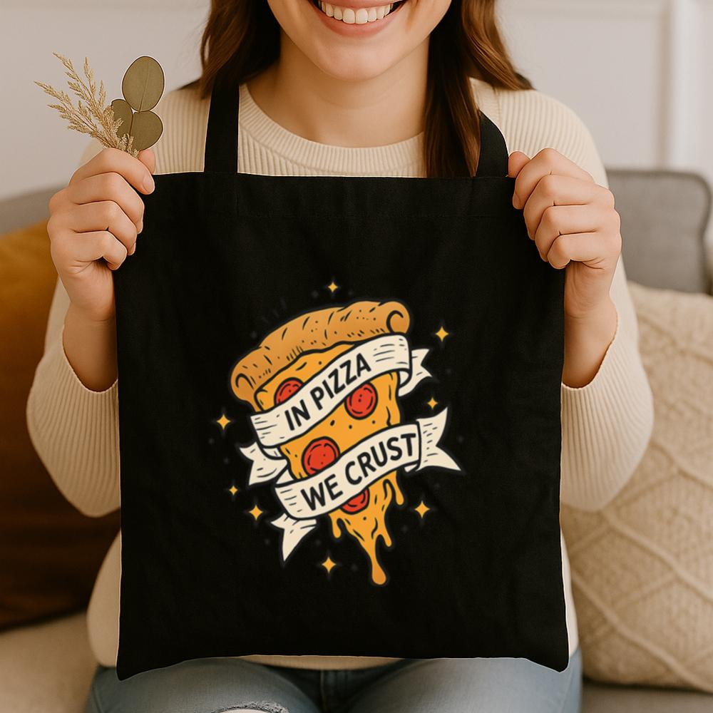 Make a bold, funny statement wherever you go with this In Pizza We Crust Tote Bag. Designed for lovers of pizza and puns, this tote features a cheesy pepperoni slice wrapped in a cheeky banner that shows where your true loyalty lies. Great for groceries, library hauls, or your next pizza run.