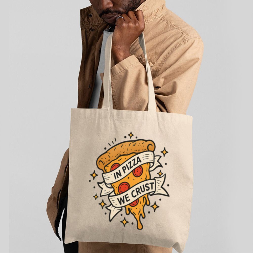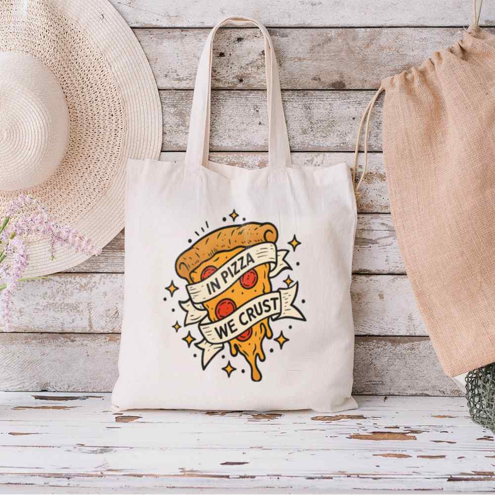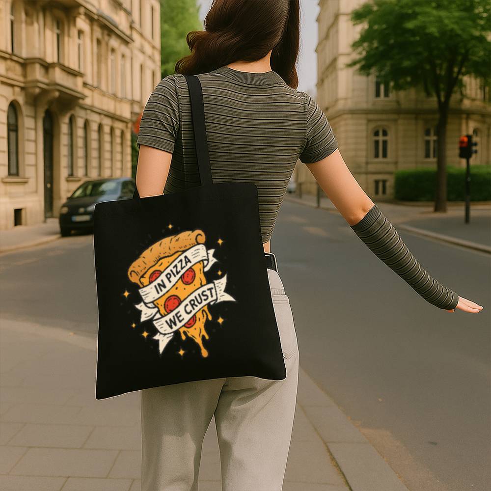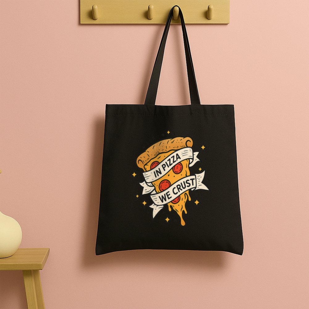 Make a bold, funny statement wherever you go with this In Pizza We Crust Tote Bag. Designed for lovers of pizza and puns, this tote features a cheesy pepperoni slice wrapped in a cheeky banner that shows where your true loyalty lies. Great for groceries, library hauls, or your next pizza run.
