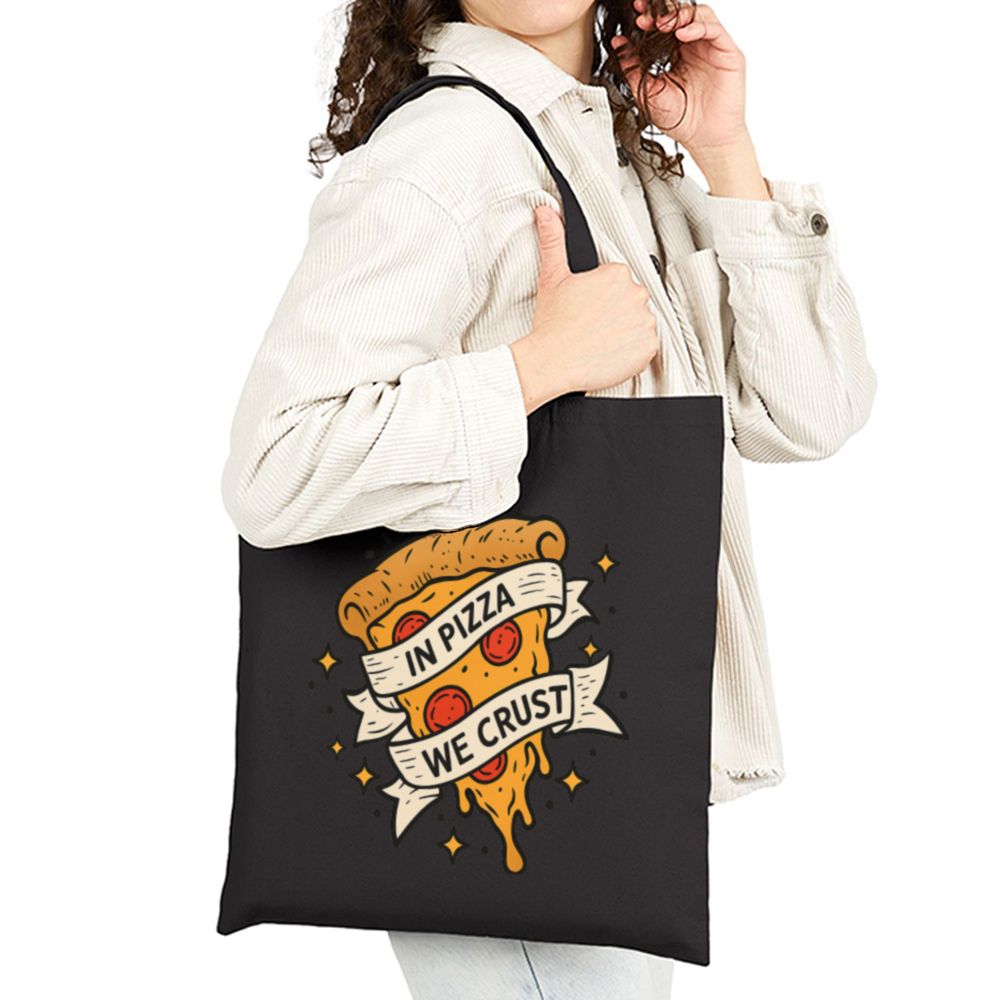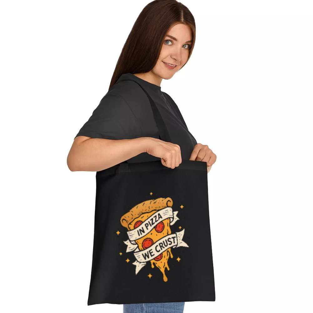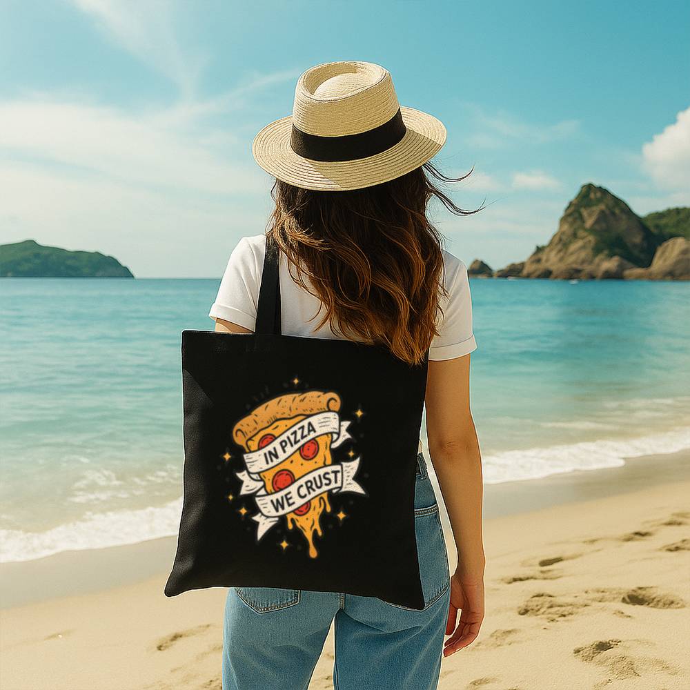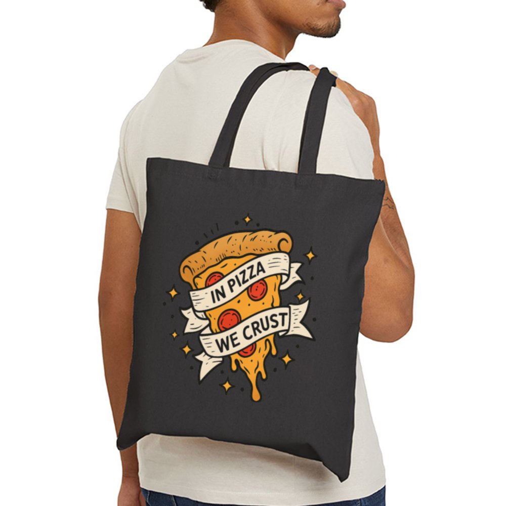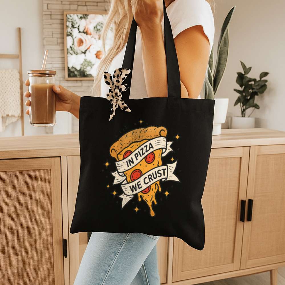 Make a bold, funny statement wherever you go with this In Pizza We Crust Tote Bag. Designed for lovers of pizza and puns, this tote features a cheesy pepperoni slice wrapped in a cheeky banner that shows where your true loyalty lies. Great for groceries, library hauls, or your next pizza run.
