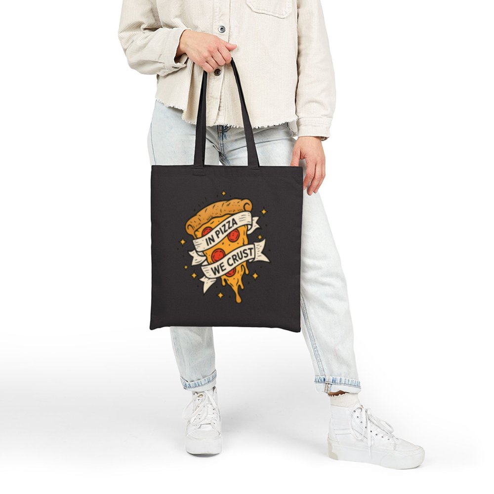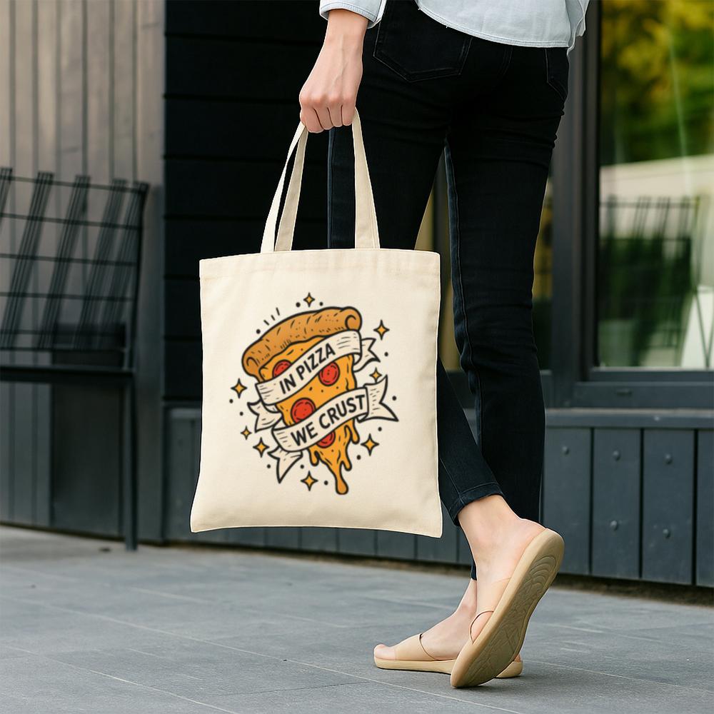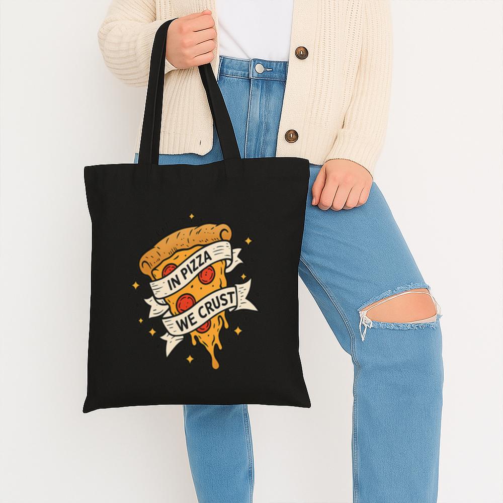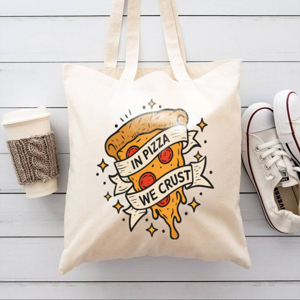 Don’t crust anyone else with your essentials carry this In Pizza We Crust Tote Bag and keep your style fresh from the oven.