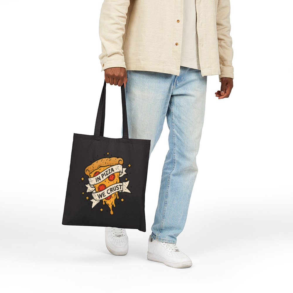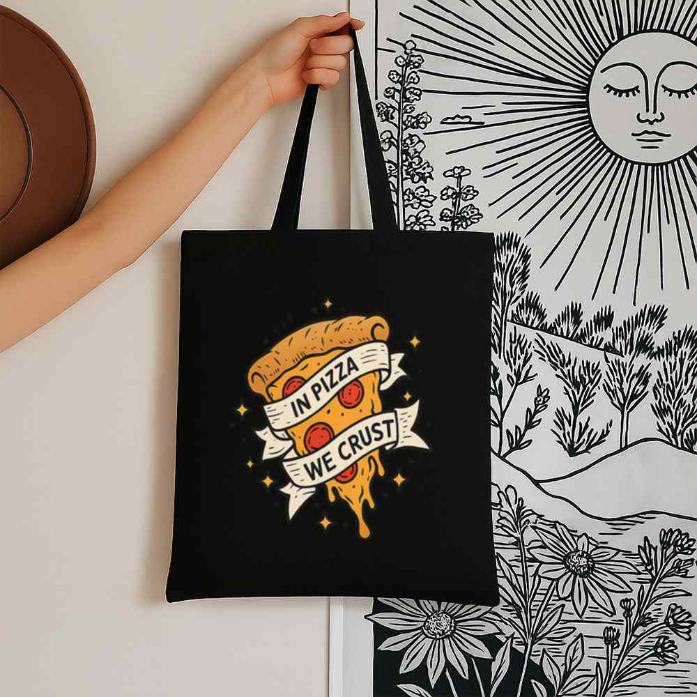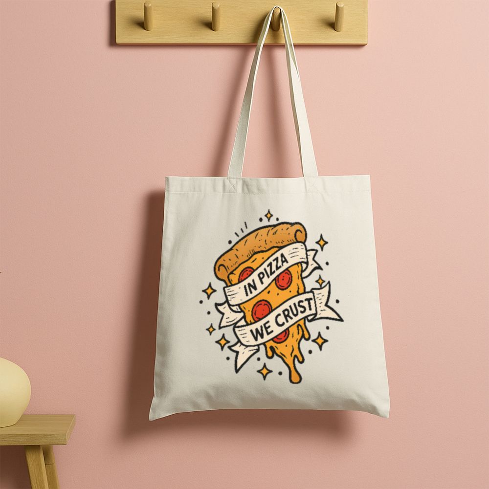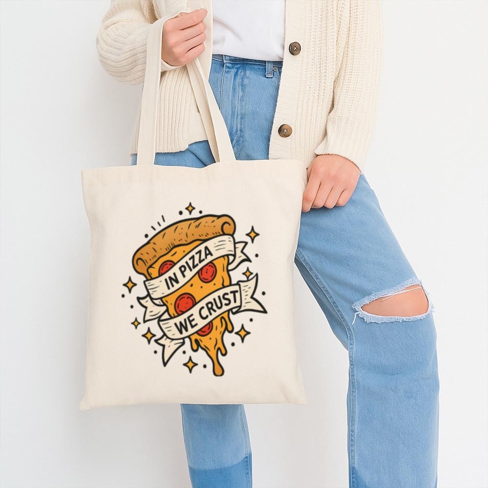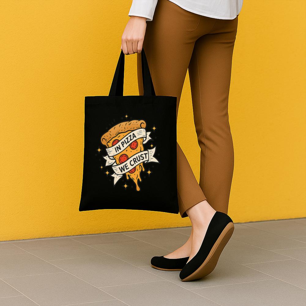 Don’t crust anyone else with your essentials carry this In Pizza We Crust Tote Bag and keep your style fresh from the oven.