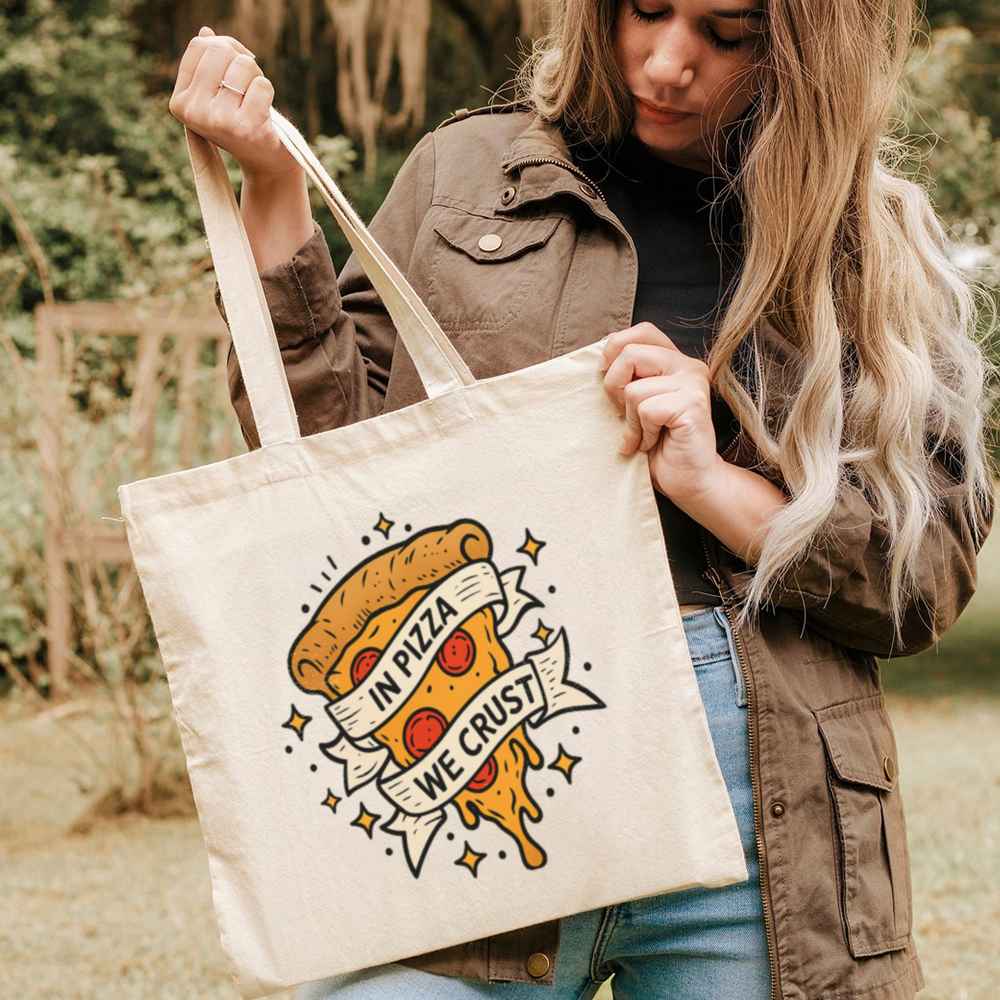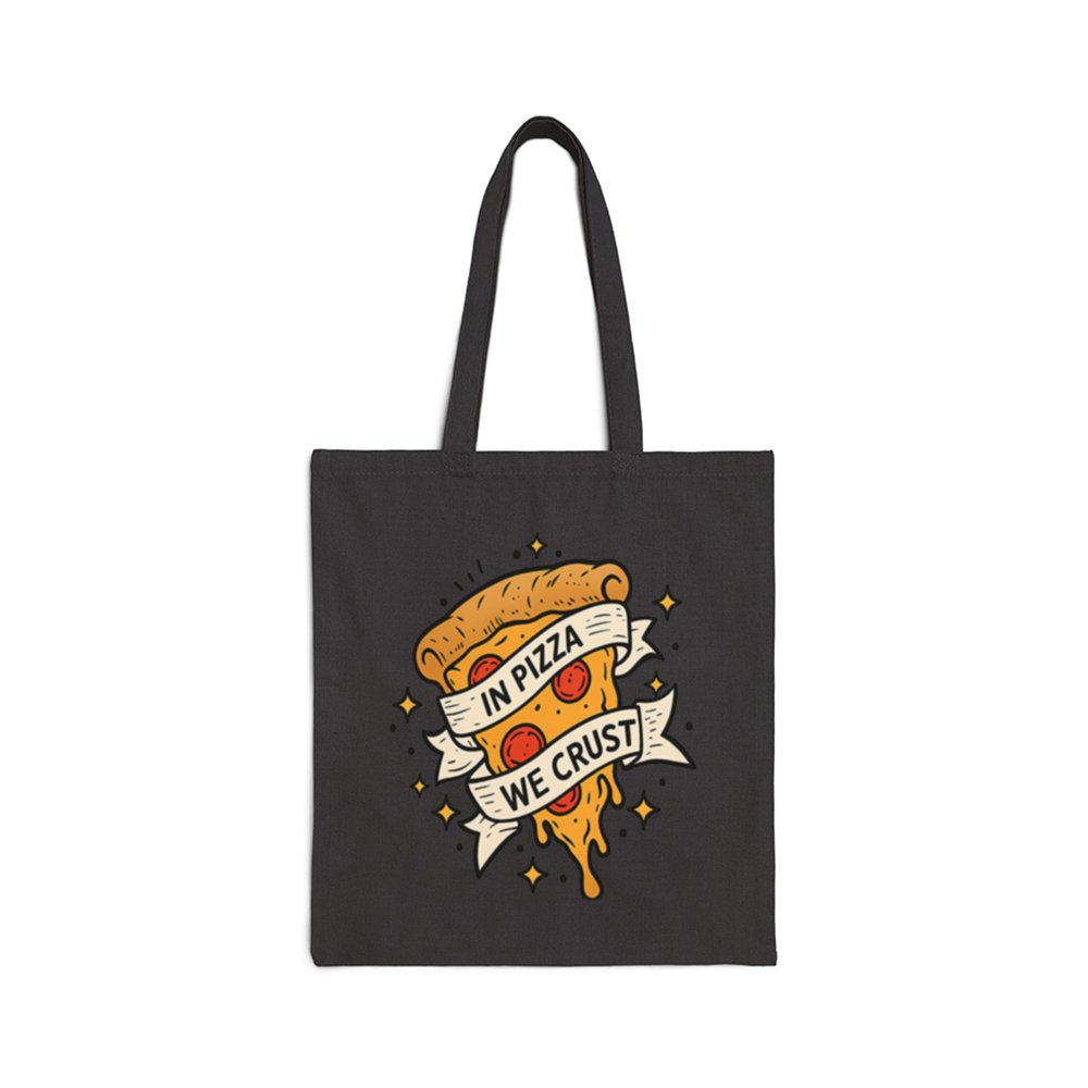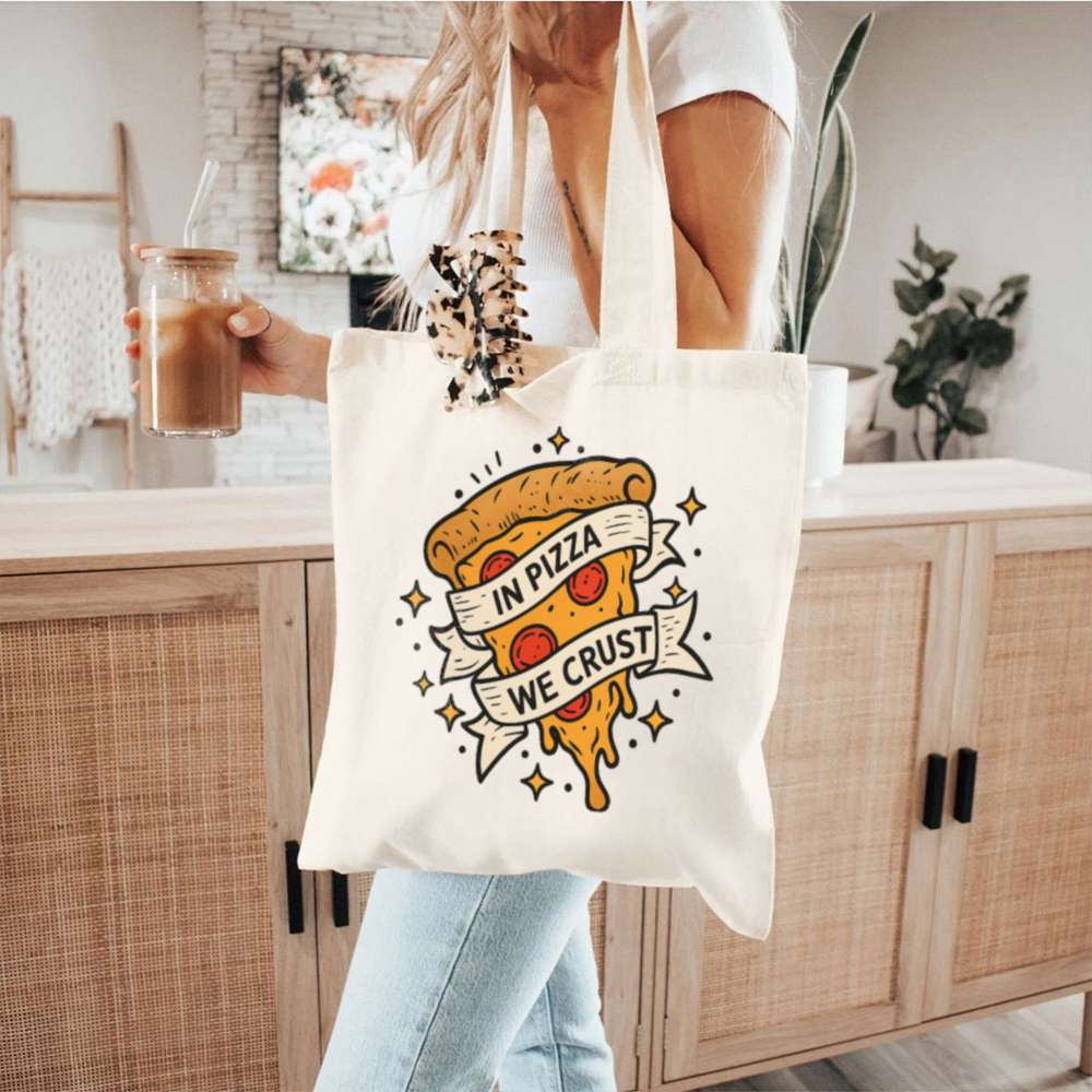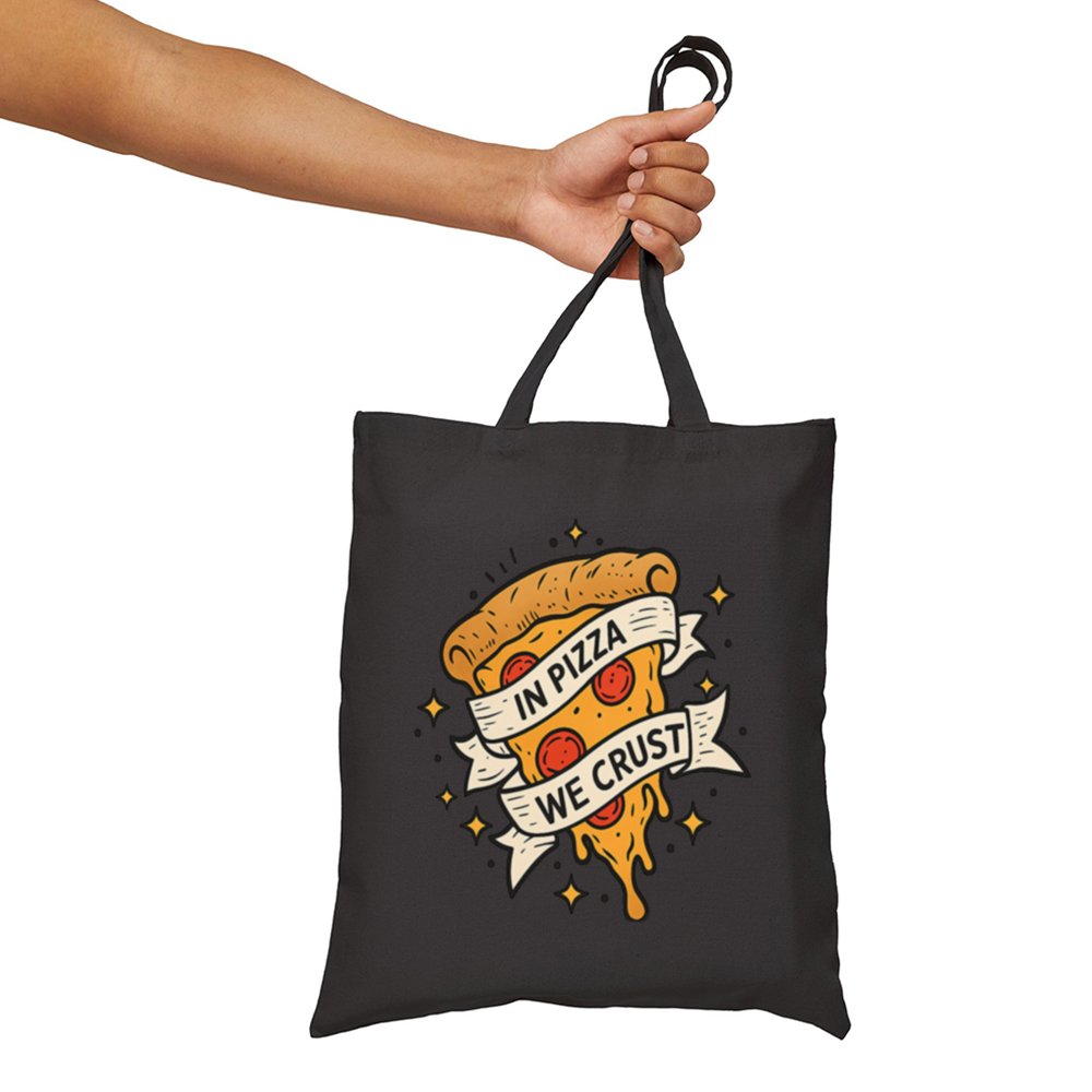Don’t crust anyone else with your essentials carry this In Pizza We Crust Tote Bag and keep your style fresh from the oven.