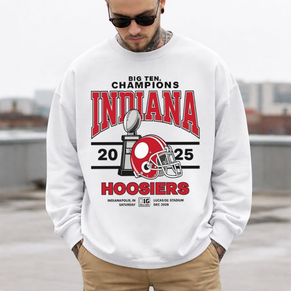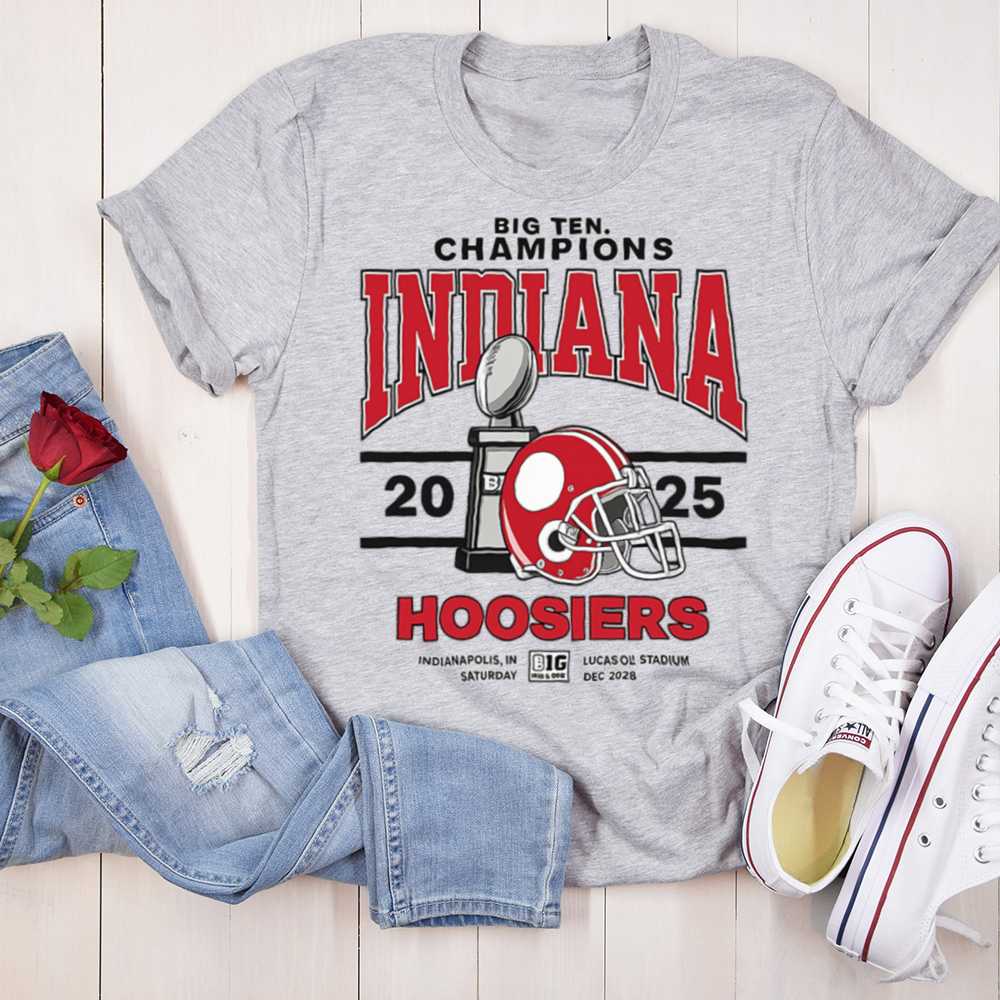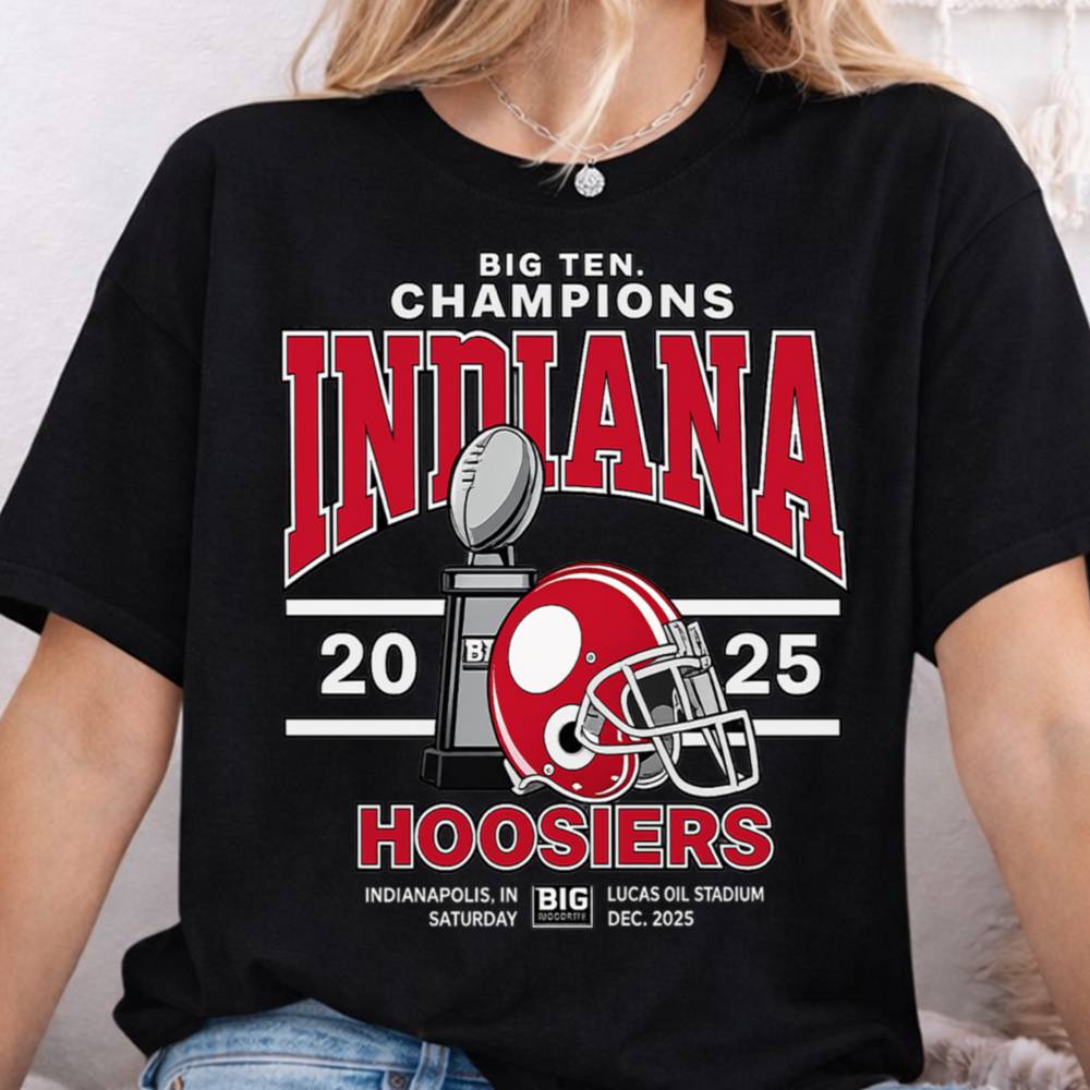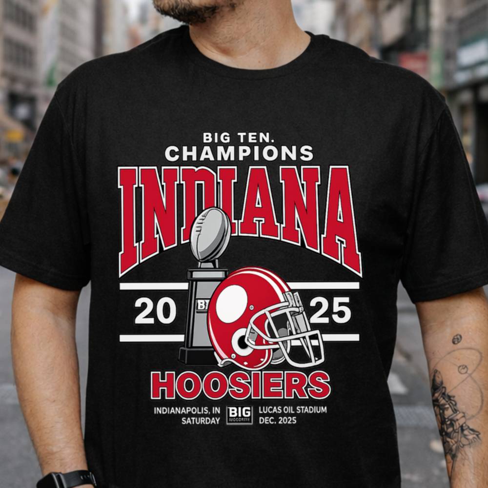 Show your team spirit with the ultimate fan gear: the Indiana Hoosiers Big Ten Champions T-Shirt. This eye-catching design honors the Hoosiers’ 2025 championship win, complete with a football trophy, helmet, and event details from the Lucas Oil Stadium showdown in Indianapolis.