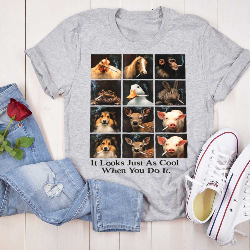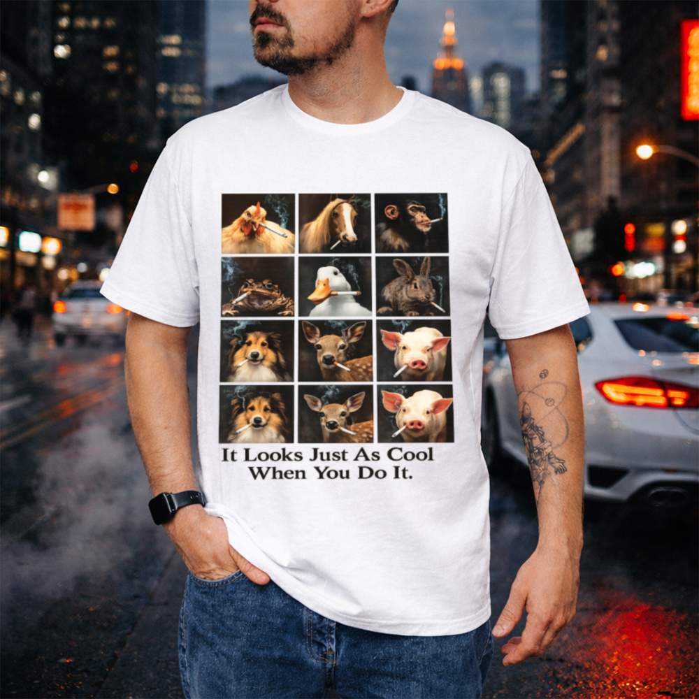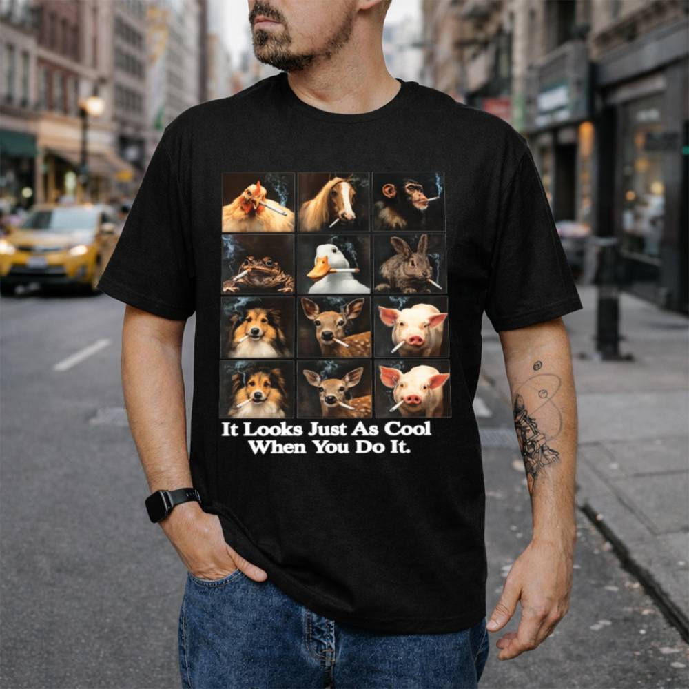 The It Looks Just As Cool When You Do It T-Shirt delivers a cheeky, thought-provoking twist on anti-smoking advocacy. Featuring a grid of animals from chickens and ducks to dogs and deer all humorously smoking cigarettes, the message hits hard: what looks absurd on animals isn’t any cooler on humans. With the bold caption beneath, this shirt speaks volumes in the most unexpected way.