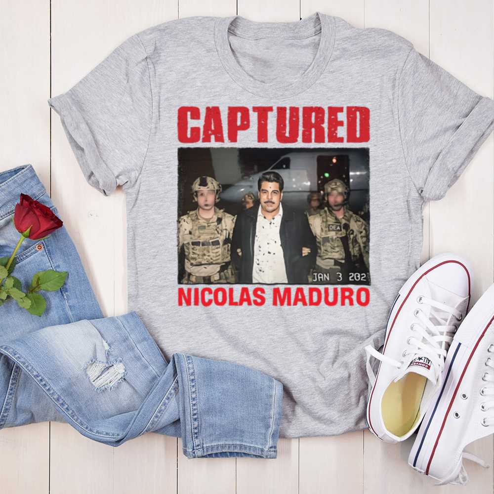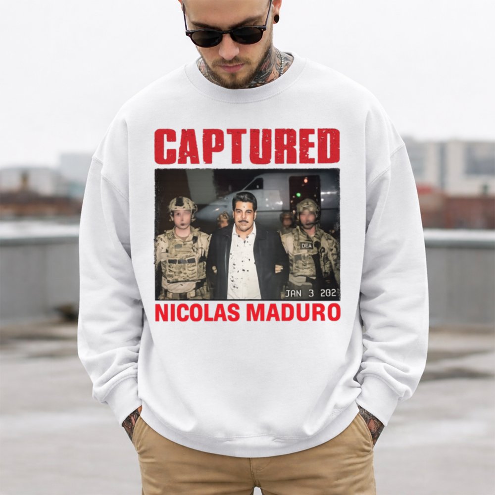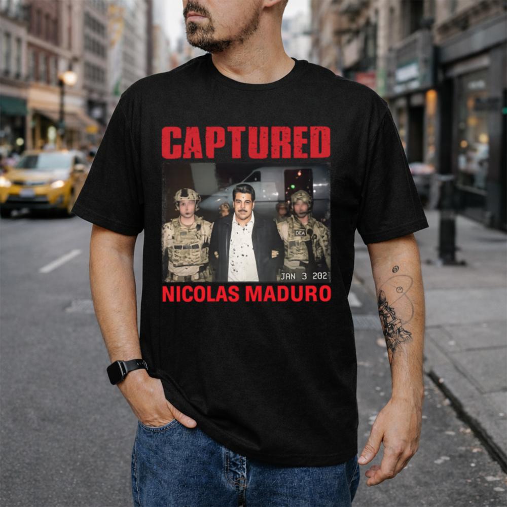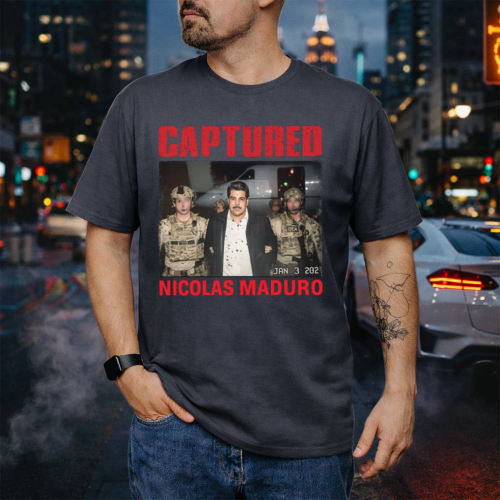 The Maduro Captured T-Shirt captures the dream of millions in a single powerful image. Featuring a dramatic, stylized depiction of Nicolás Maduro under arrest by DEA agents, the design reads “CAPTURED – NICOLAS MADURO” with the mock date “Jan 3 2026” stamped like surveillance footage. It’s a bold piece of protest apparel for those who stand against dictatorship and demand accountability.