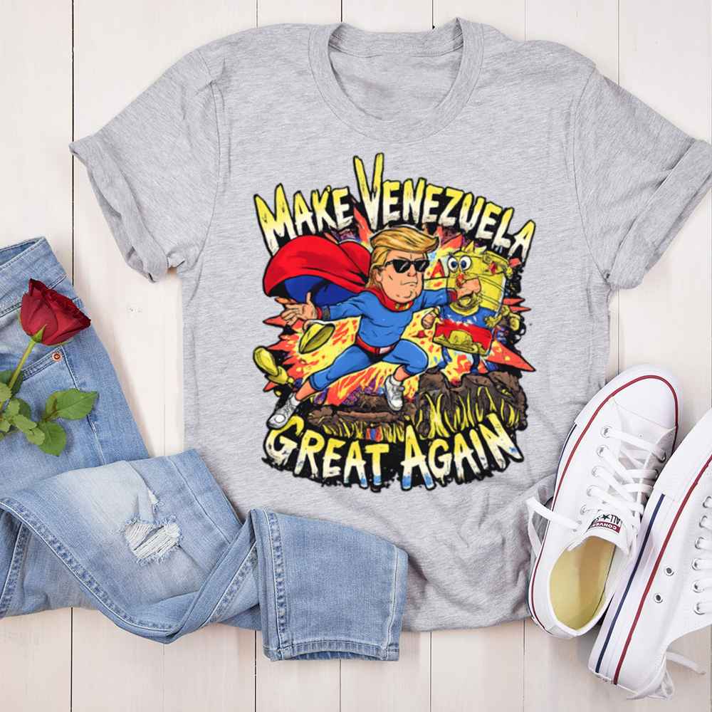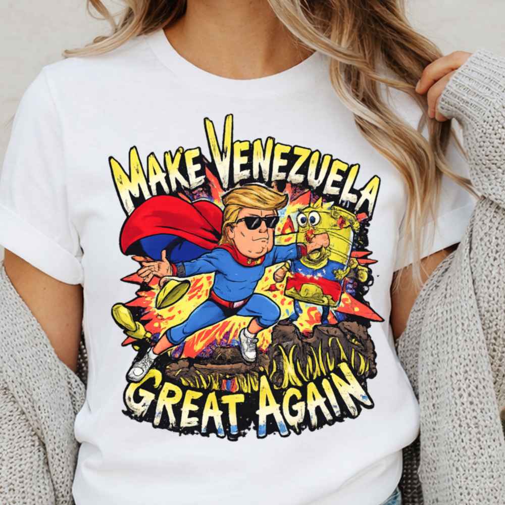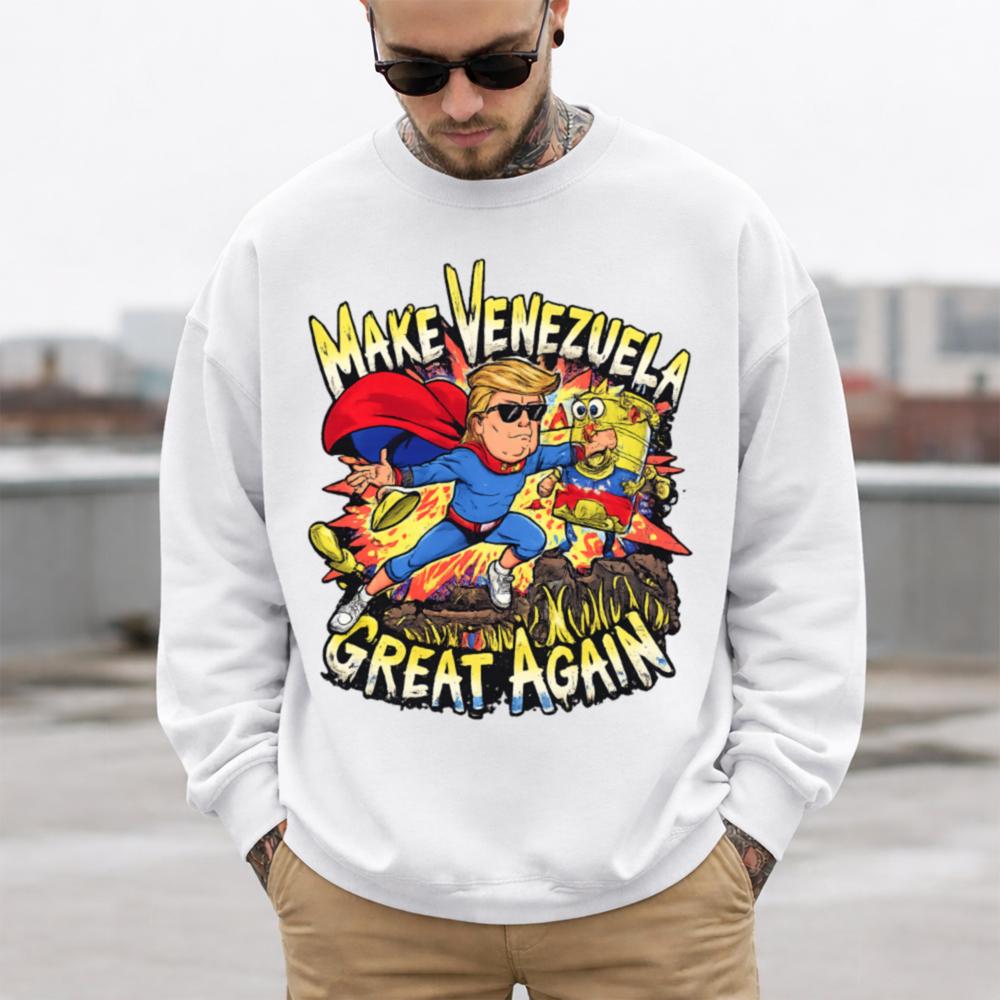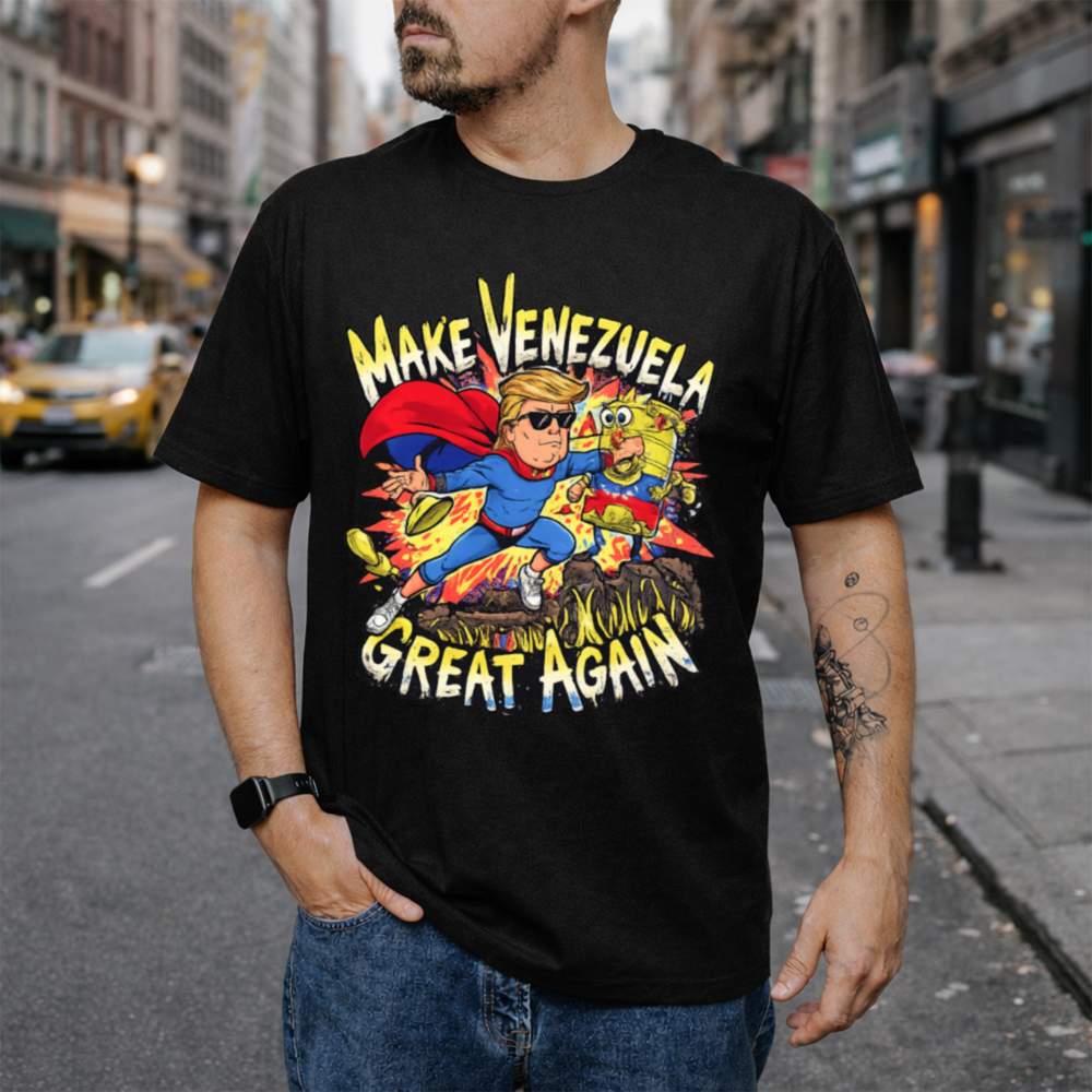 The Make Venezuela Great Again T-Shirt turns protest into pop art. Showcasing a cartoon version of Donald Trump as a musclebound superhero, the design captures him punching a broken-down robot draped in the Venezuelan flag a symbol of socialism gone wrong. Explosive comic-style visuals and bold lettering deliver the message with impact and humor.