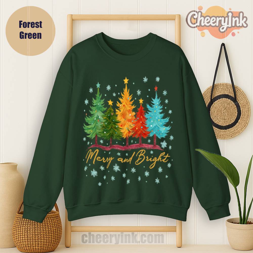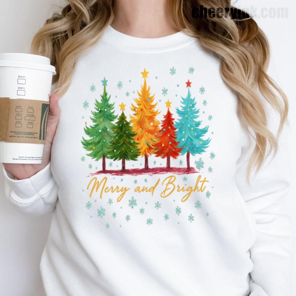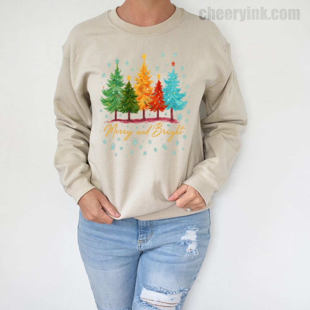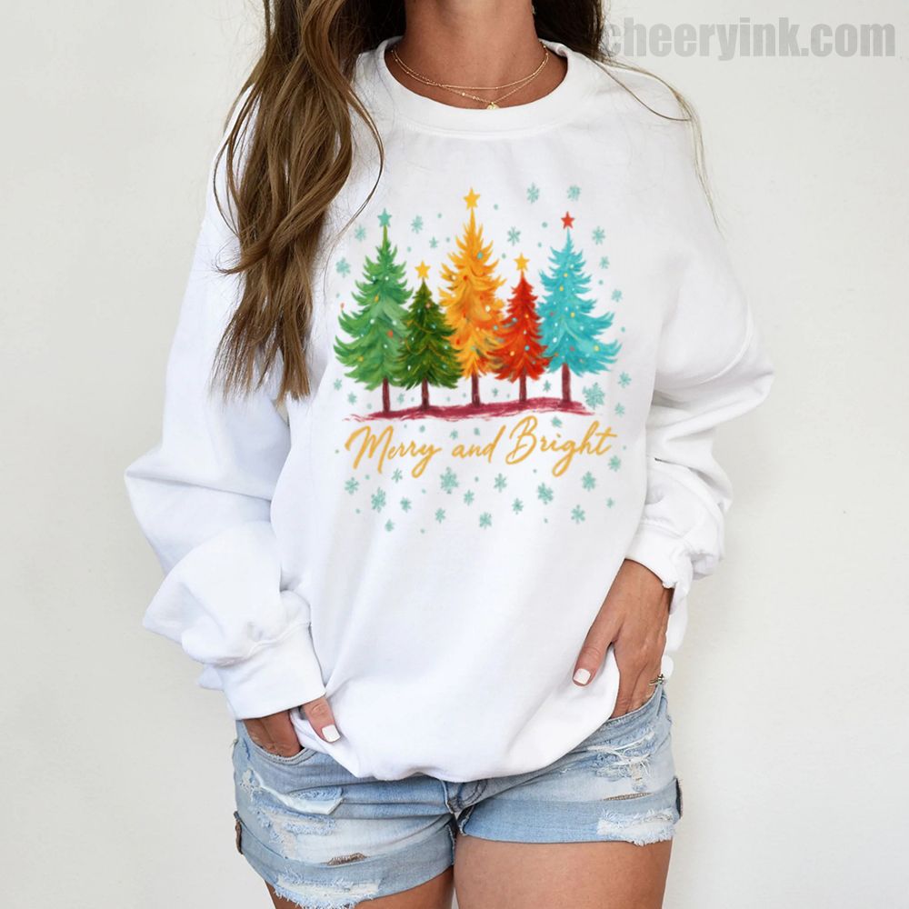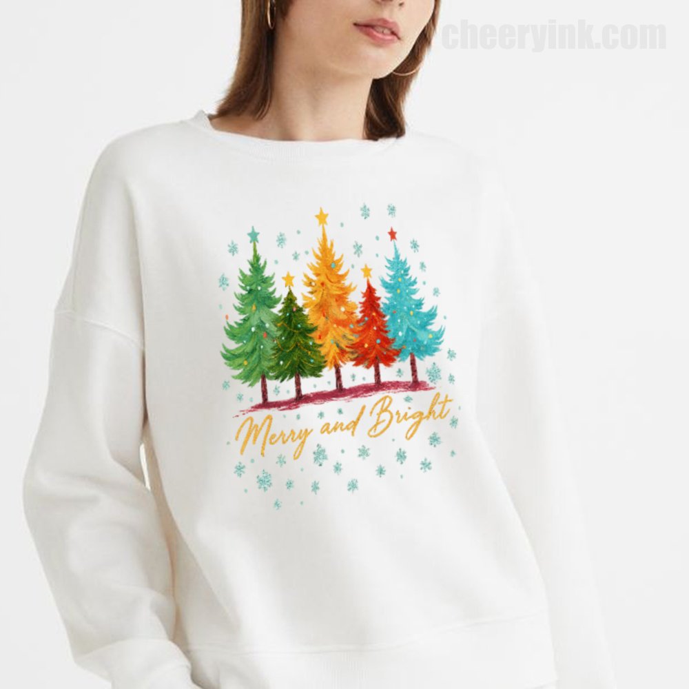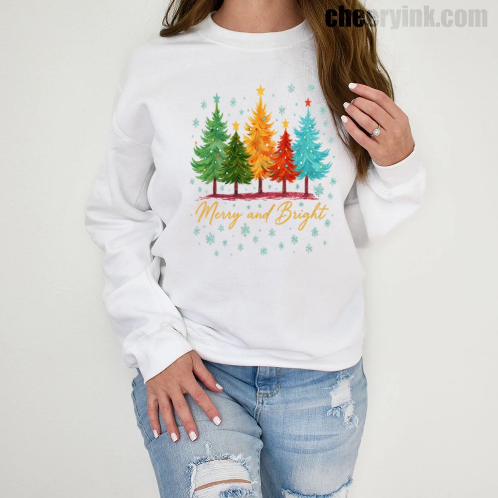 The Merry and Bright Sweatshirt combines holiday magic with ultimate comfort. Its bold, multicolor Christmas tree design against a snowy backdrop instantly brings warmth and joy to every festive occasion.