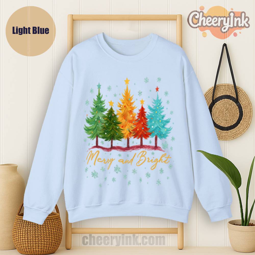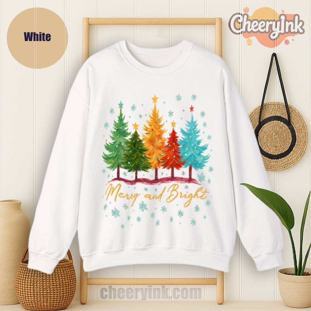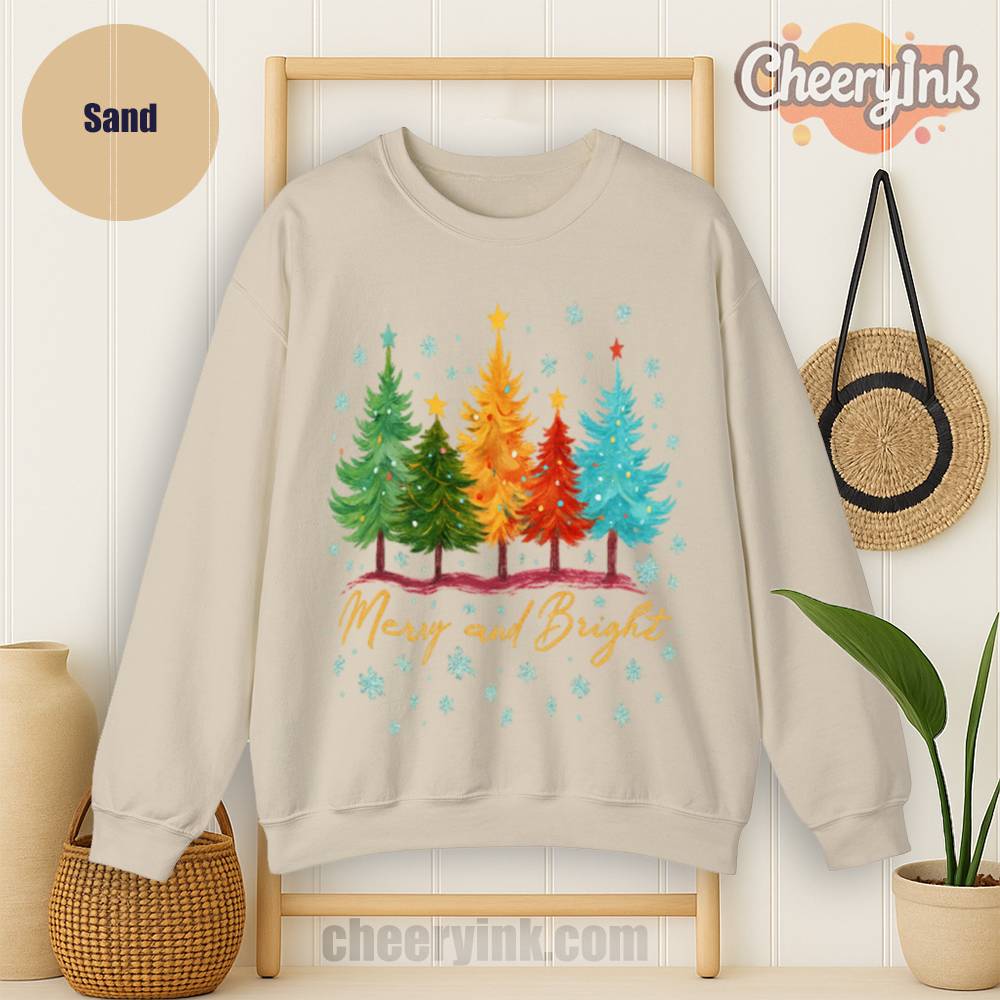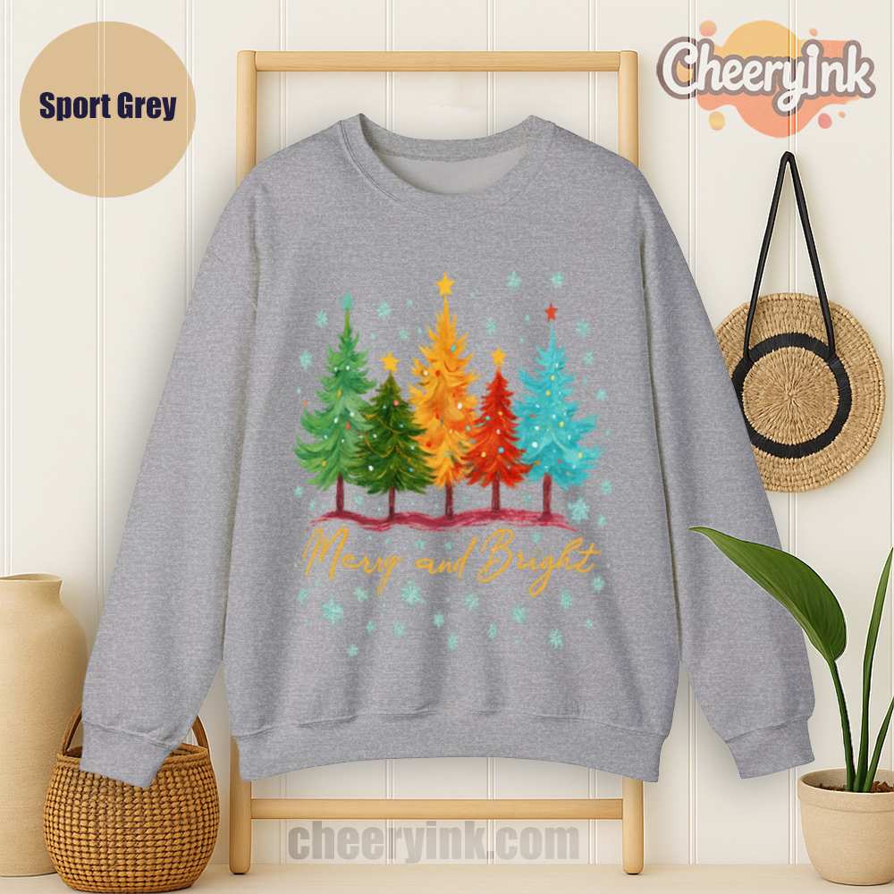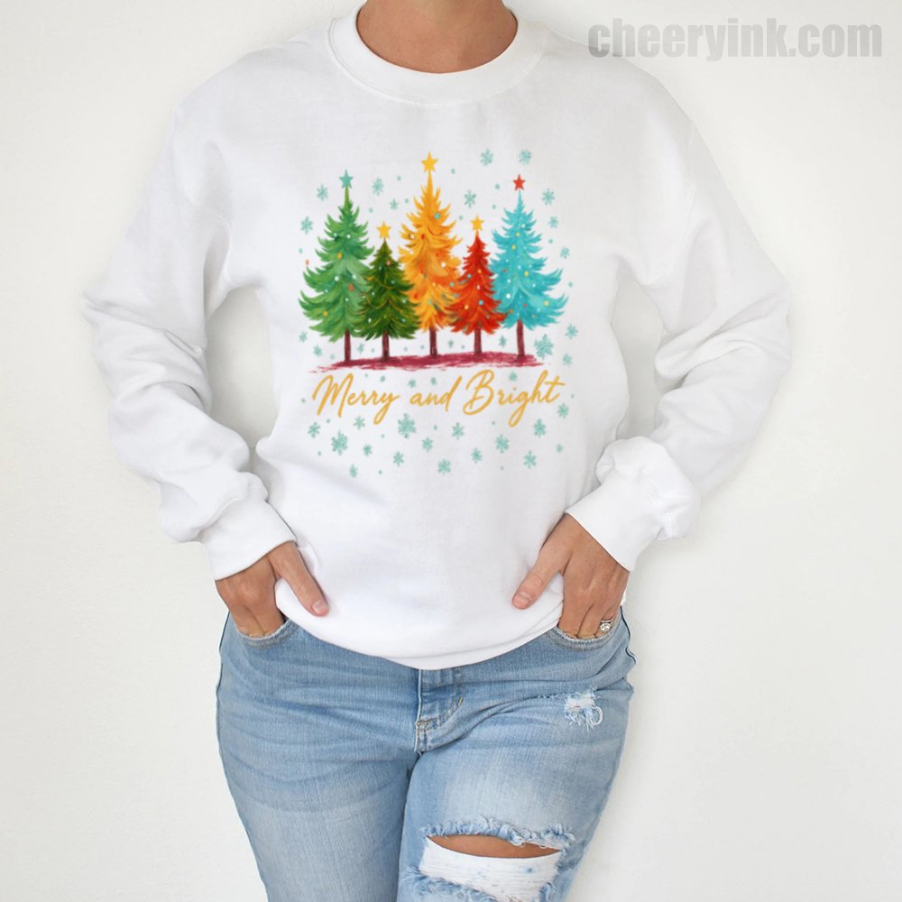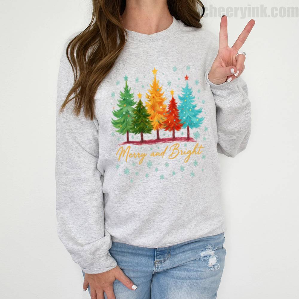 The Merry and Bright Sweatshirt combines holiday magic with ultimate comfort. Its bold, multicolor Christmas tree design against a snowy backdrop instantly brings warmth and joy to every festive occasion.