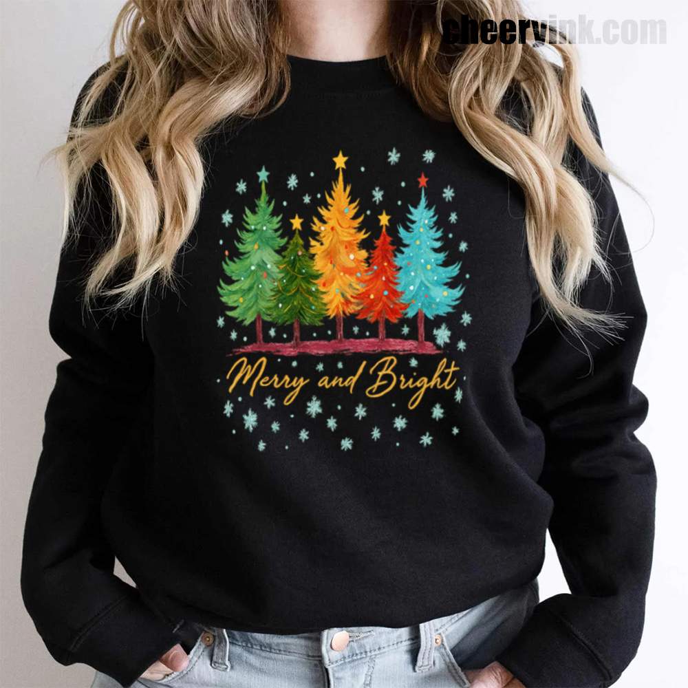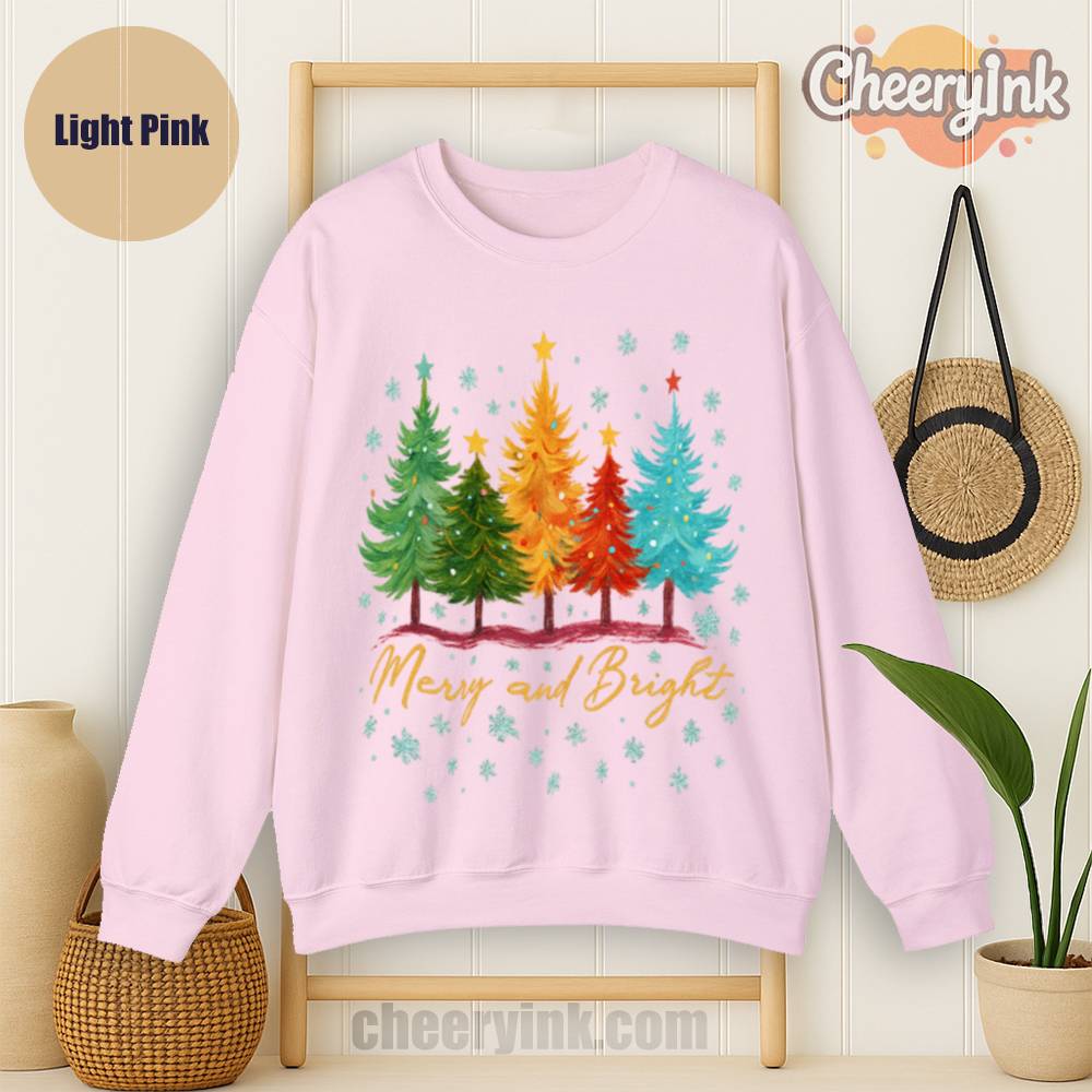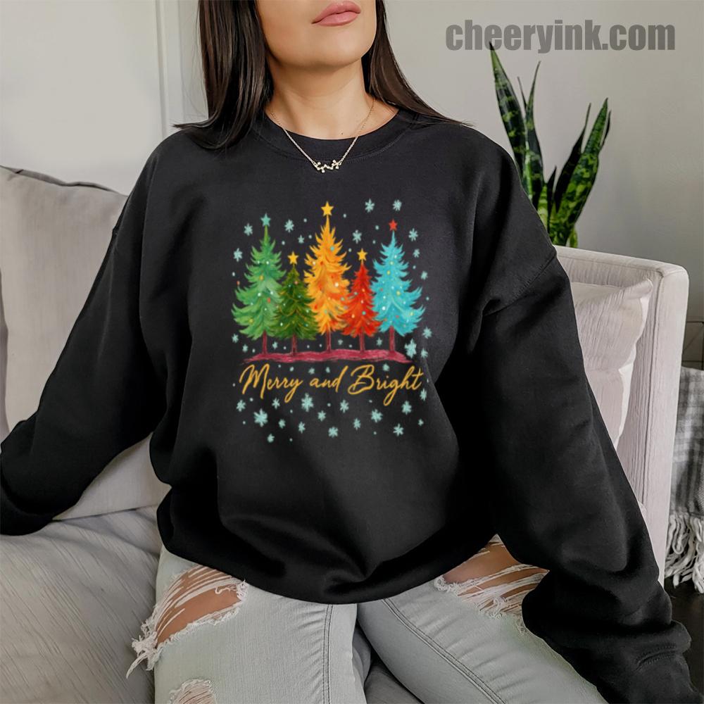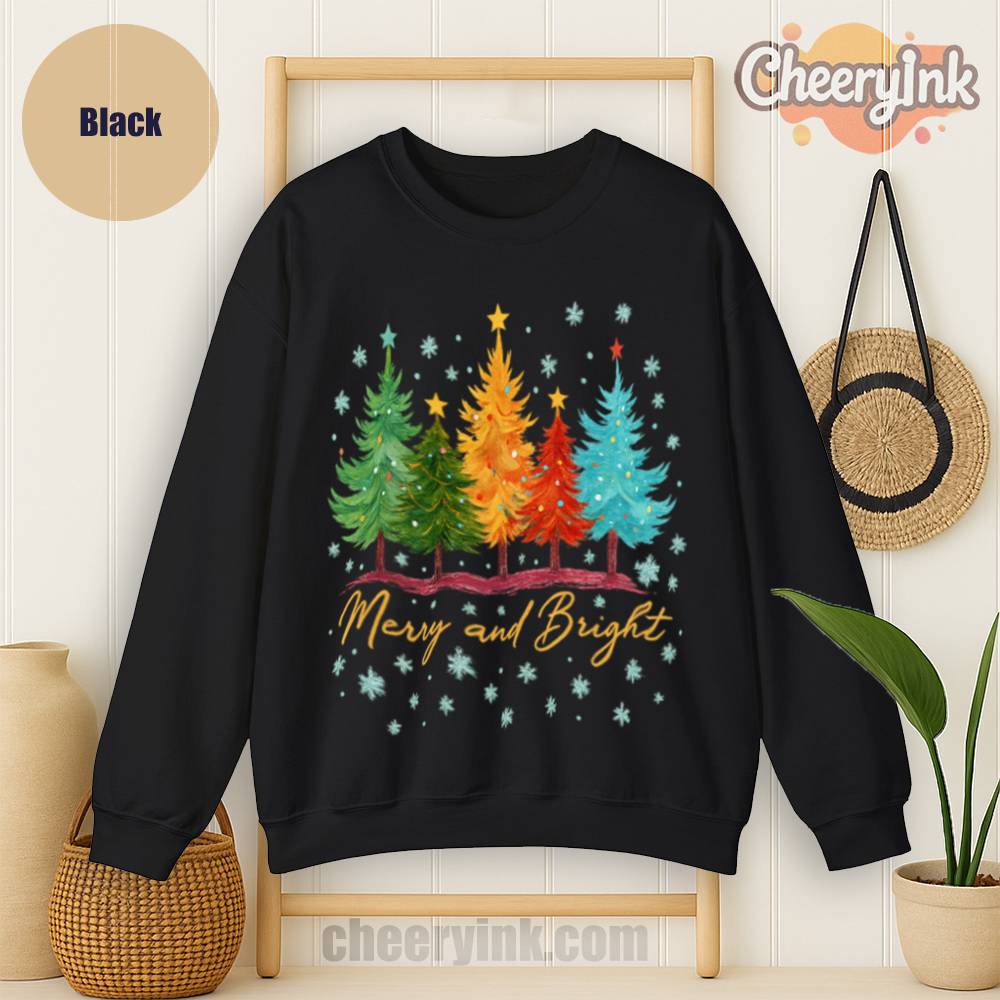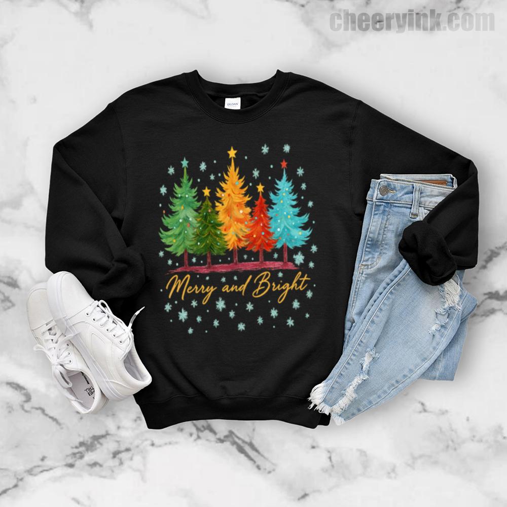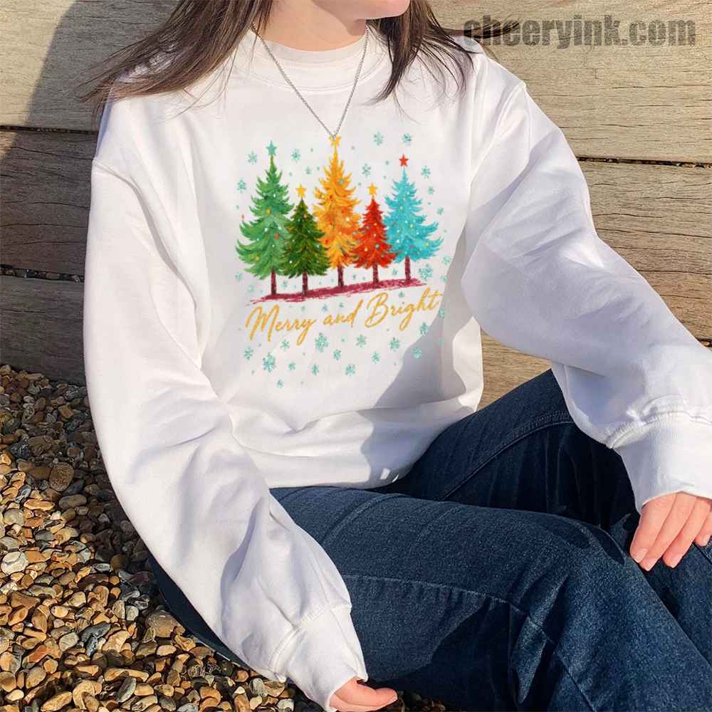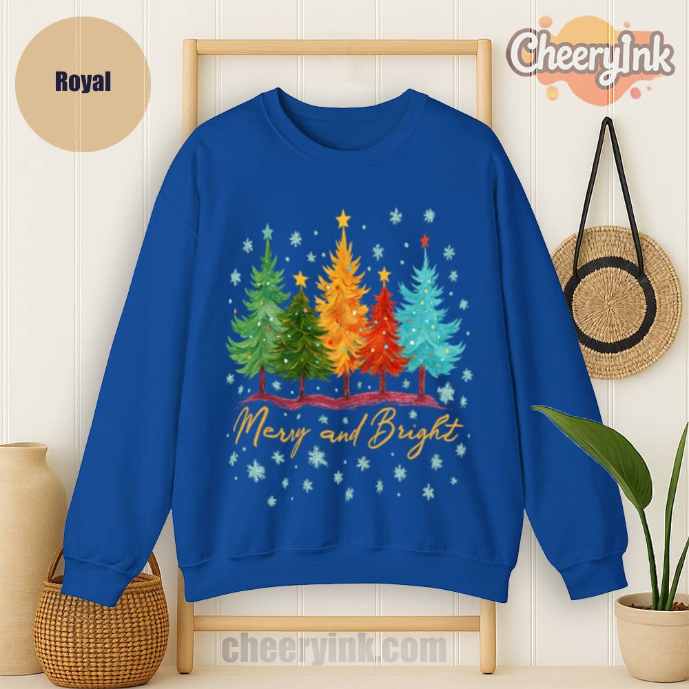 The Merry and Bright Sweatshirt combines holiday magic with ultimate comfort. Its bold, multicolor Christmas tree design against a snowy backdrop instantly brings warmth and joy to every festive occasion.