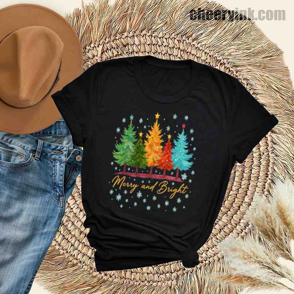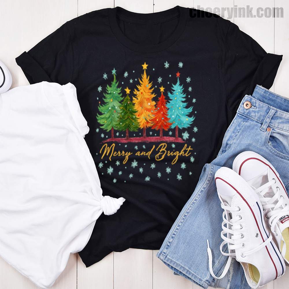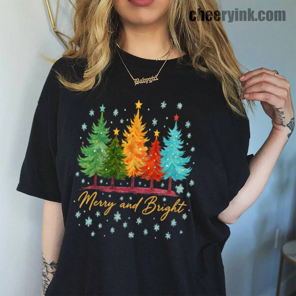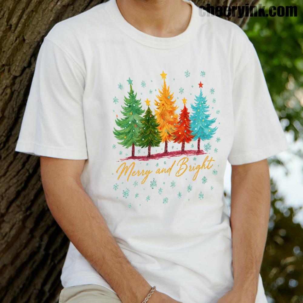 Bring the magic of the holidays to life with this Merry and Bright T-Shirt, showcasing a joyful forest of rainbow-colored Christmas trees under a snowfall of glittering snowflakes. The hand-painted look and bright lettering capture the spirit of the season with style and charm.