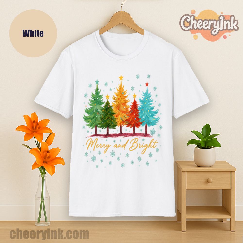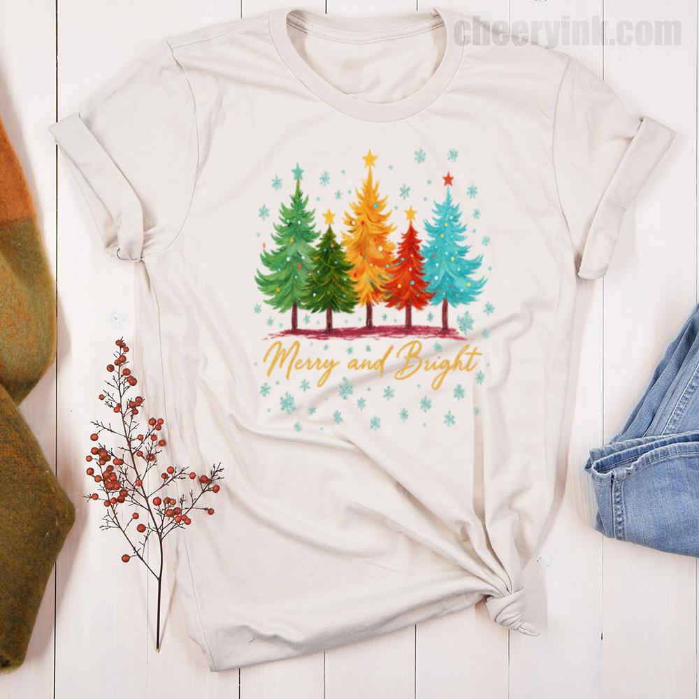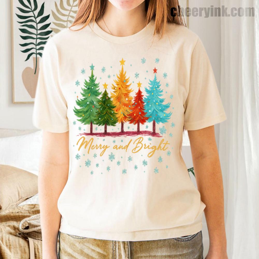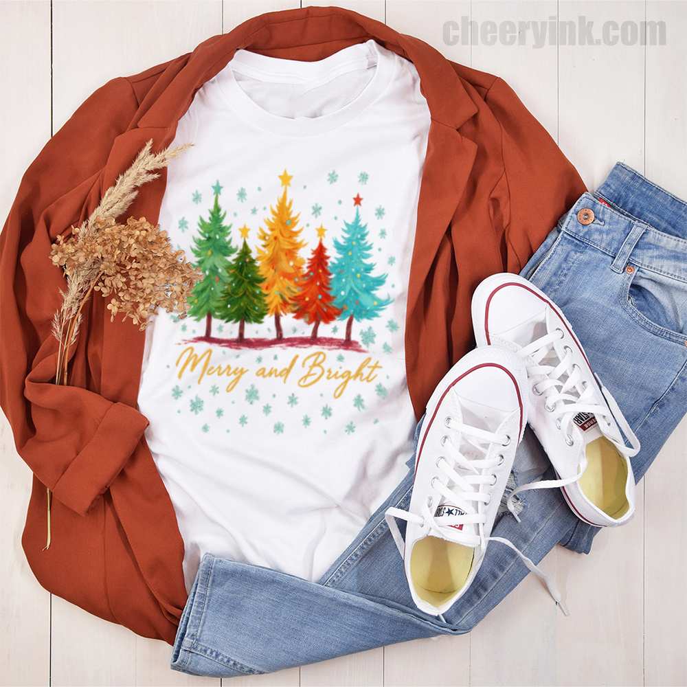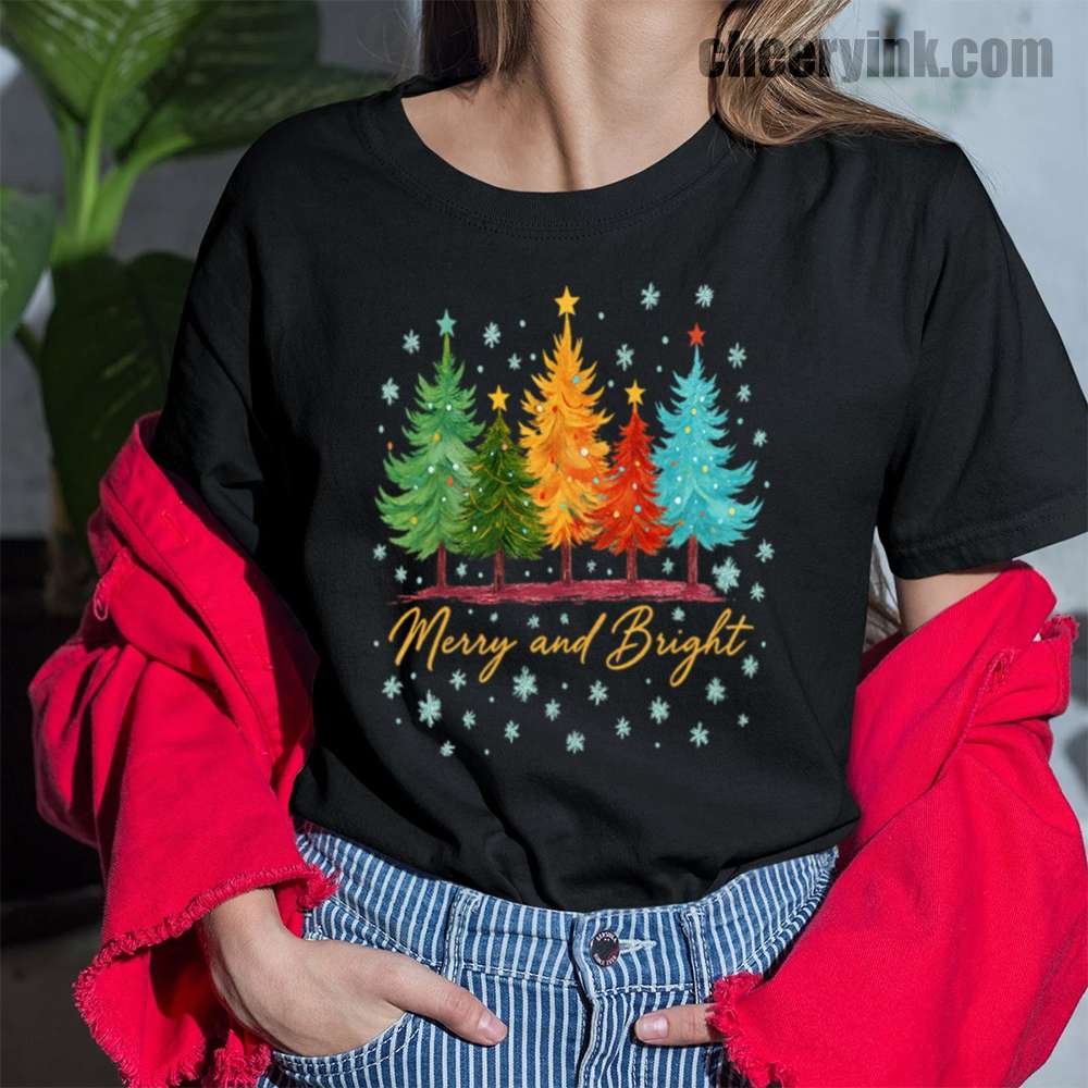 Bring the magic of the holidays to life with this Merry and Bright T-Shirt, showcasing a joyful forest of rainbow-colored Christmas trees under a snowfall of glittering snowflakes. The hand-painted look and bright lettering capture the spirit of the season with style and charm.