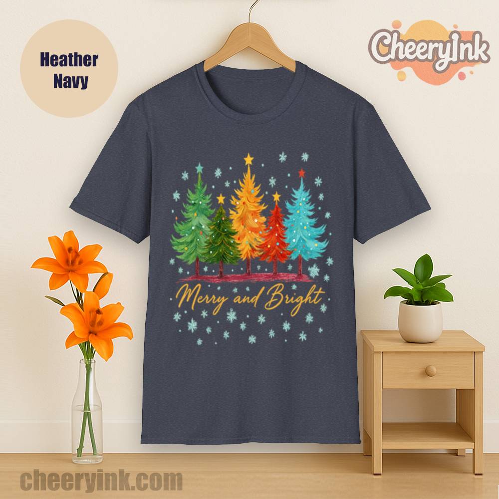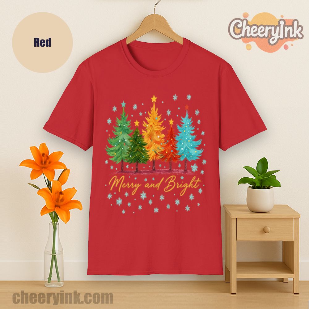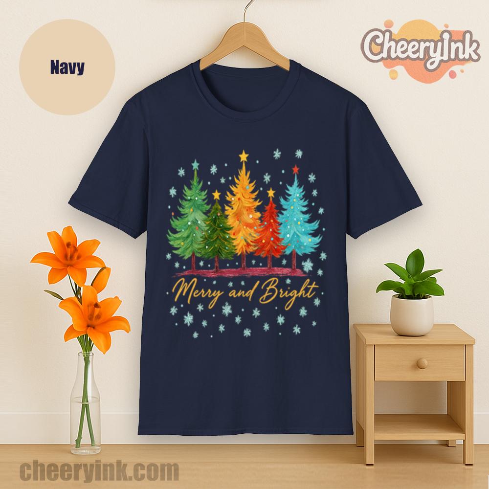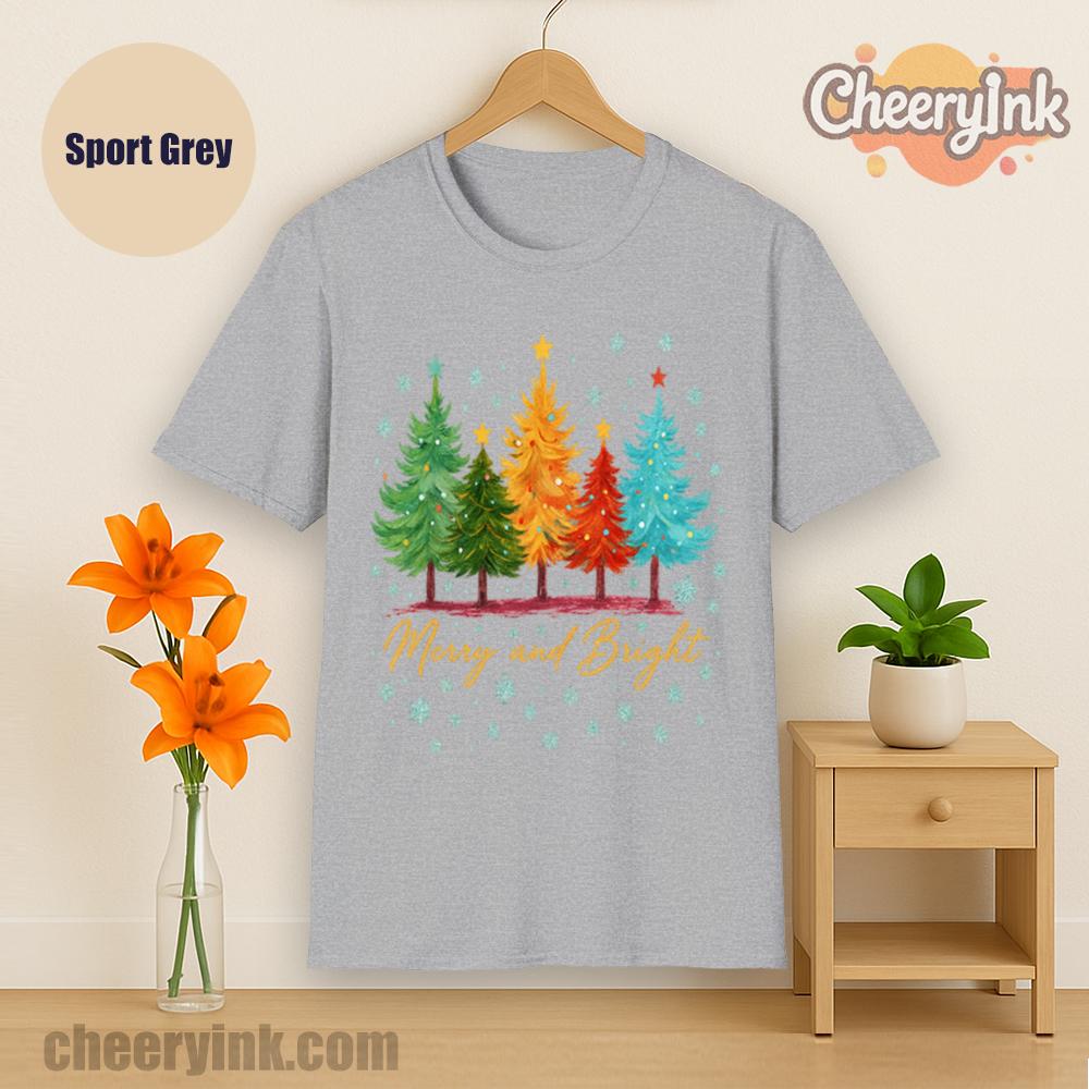 Bring the magic of the holidays to life with this Merry and Bright T-Shirt, showcasing a joyful forest of rainbow-colored Christmas trees under a snowfall of glittering snowflakes. The hand-painted look and bright lettering capture the spirit of the season with style and charm.