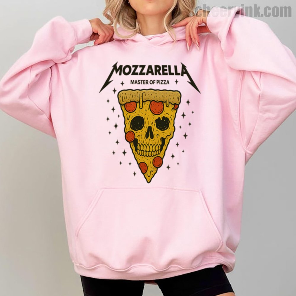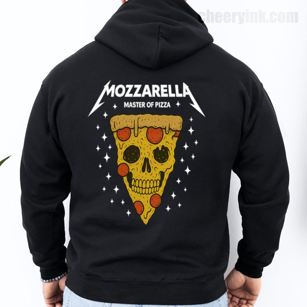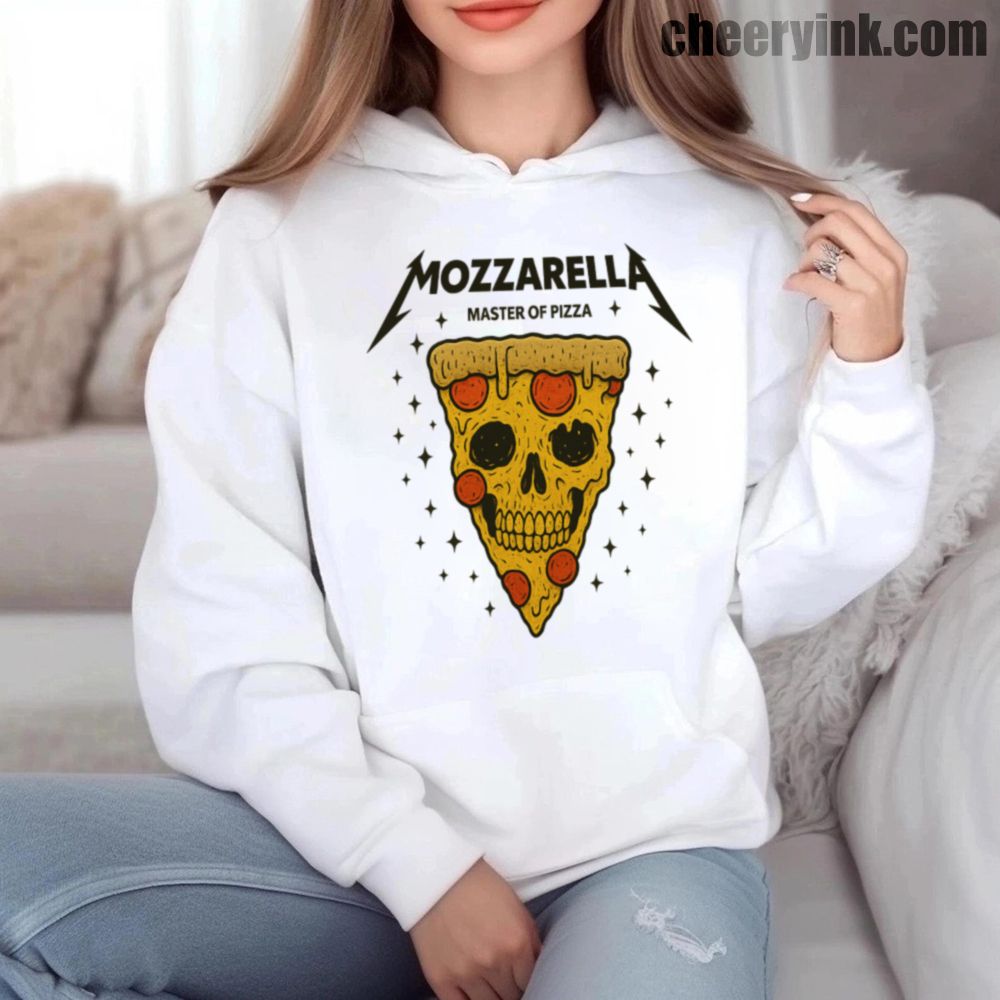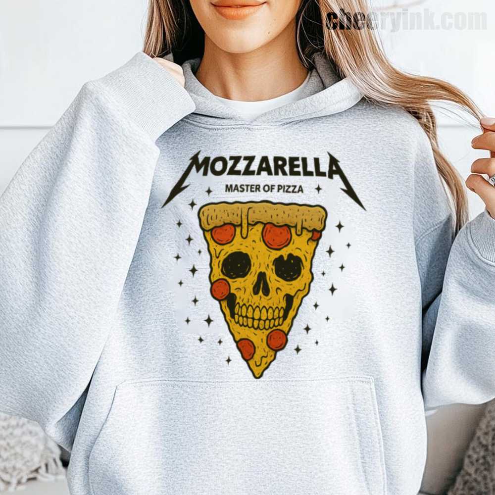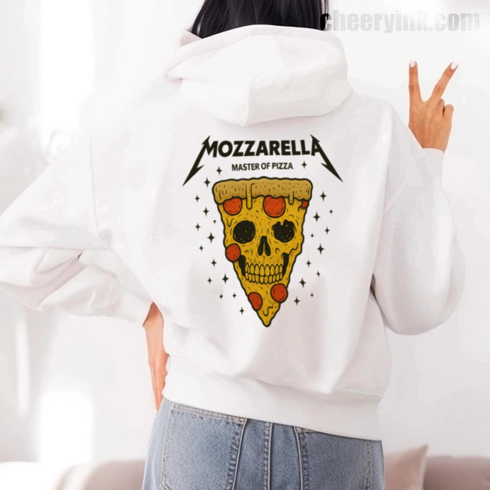 Turn heads and spark conversations with the Mozzarella Master of Pizza Hoodie! Inspired by metal band designs, this hoodie features a pizza slice shaped like a skull, surrounded by stars, and topped with melting mozzarella and pepperoni. It’s bold, fun, and deliciously rebellious.