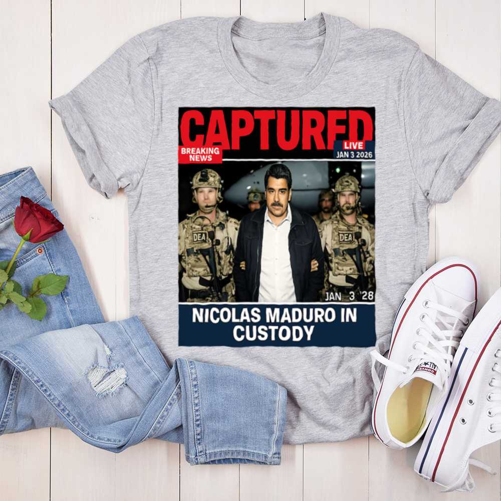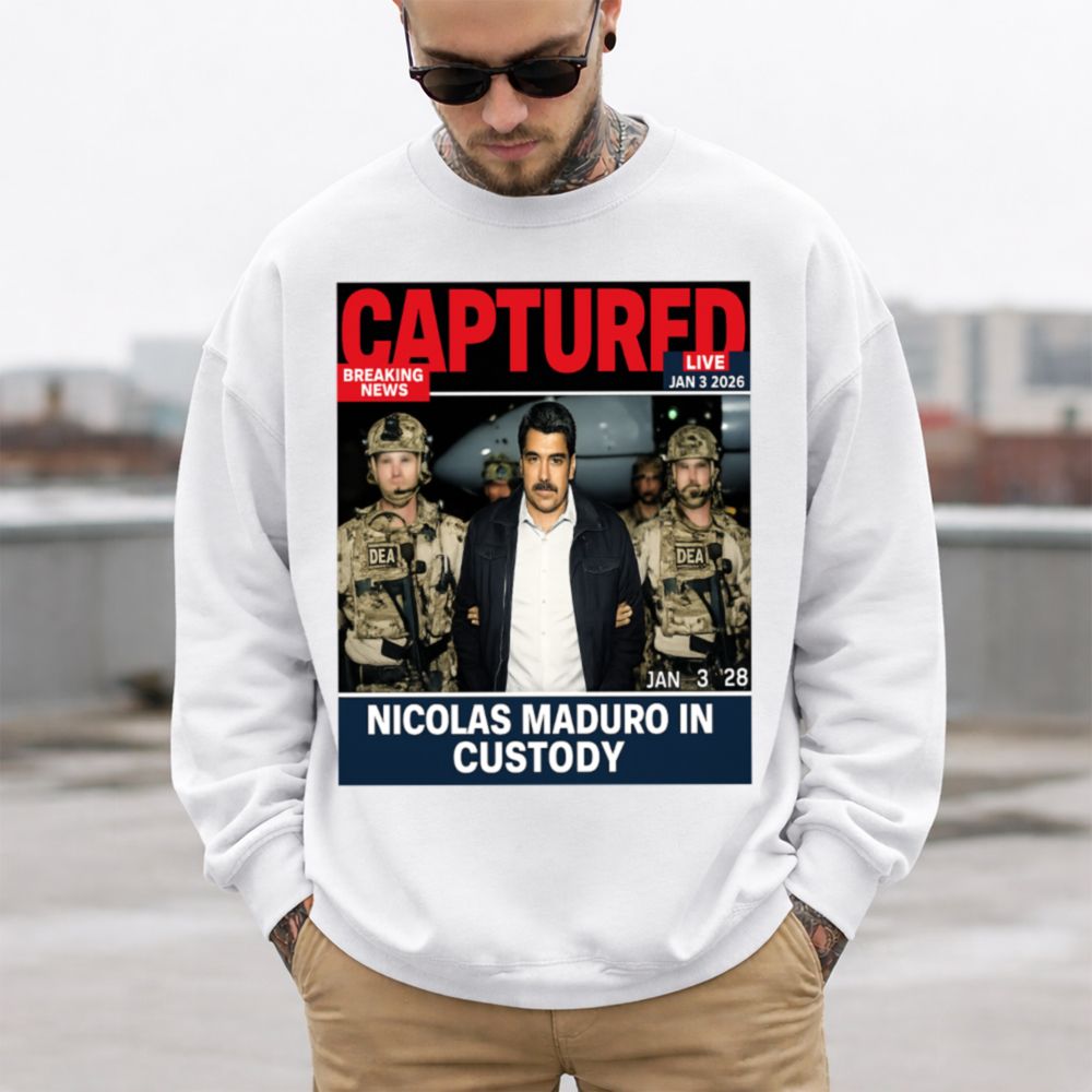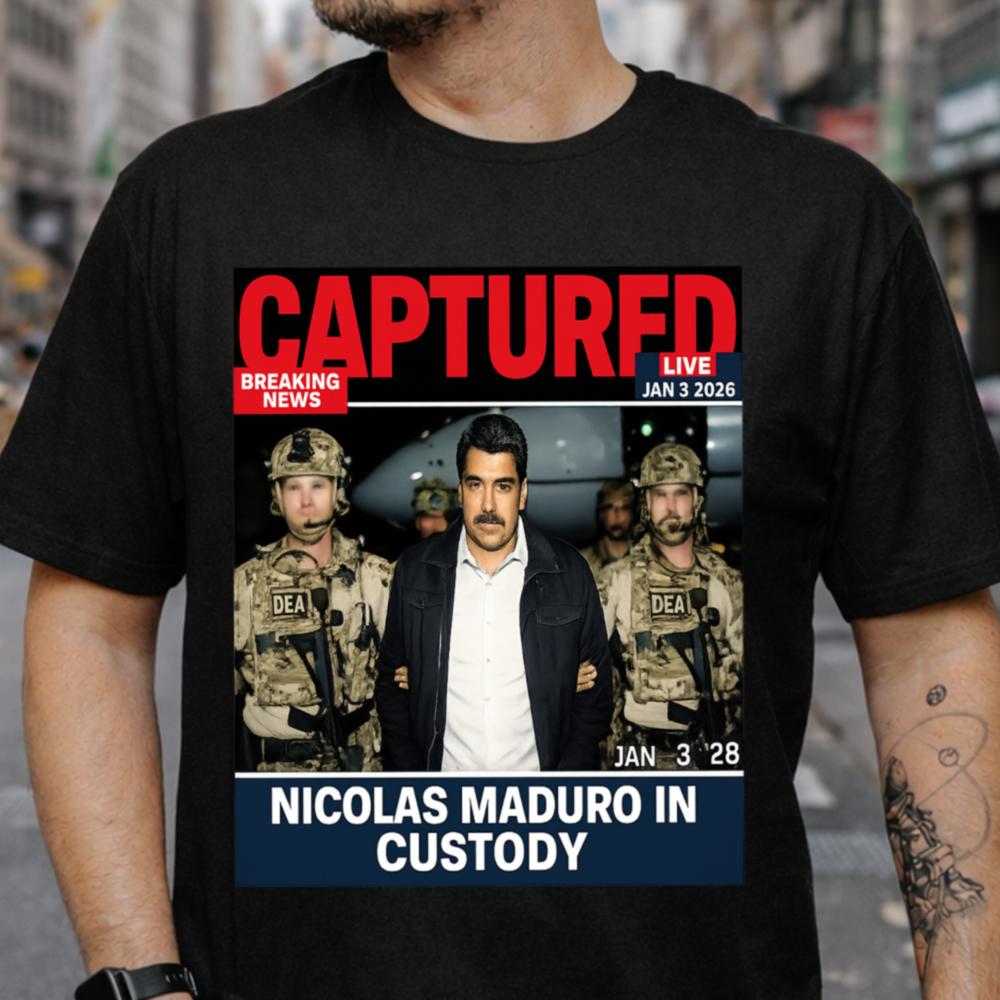 The Nicolas Maduro In Custody T-Shirt delivers a powerful message in the style of a live news report. Featuring a dramatic image of Maduro flanked by DEA agents and the bold headline “CAPTURED – NICOLAS MADURO IN CUSTODY,” it turns protest into pop culture with viral-level design energy. The date reads January 3, 2026 imagining the day justice finally arrived.