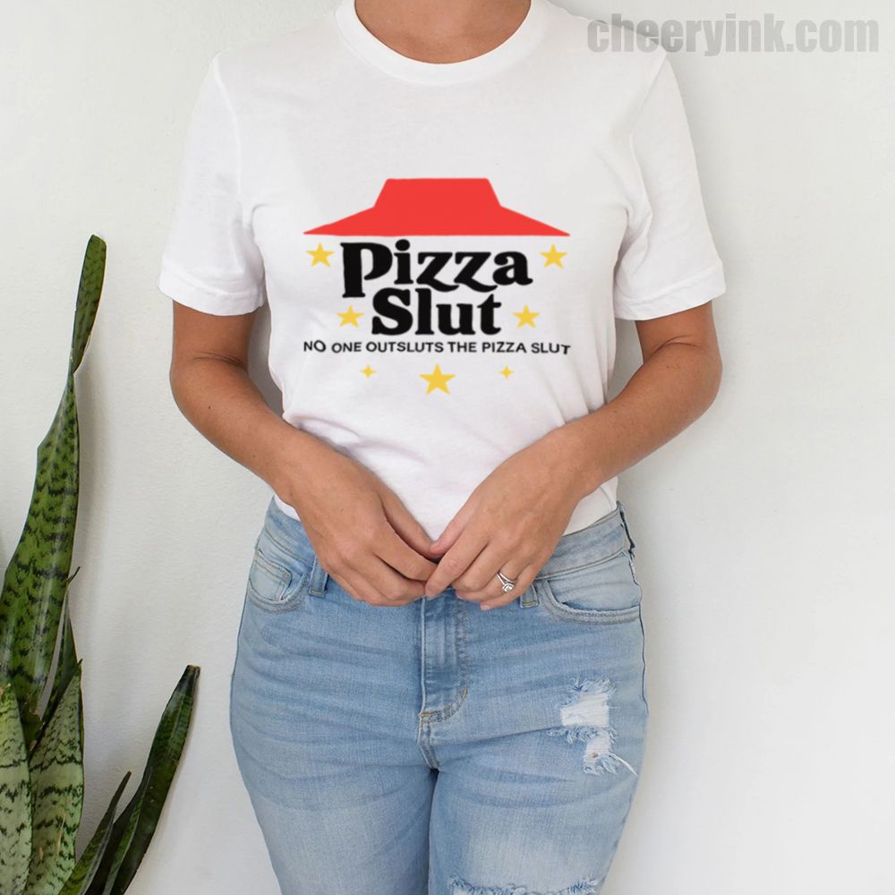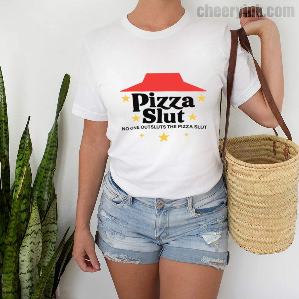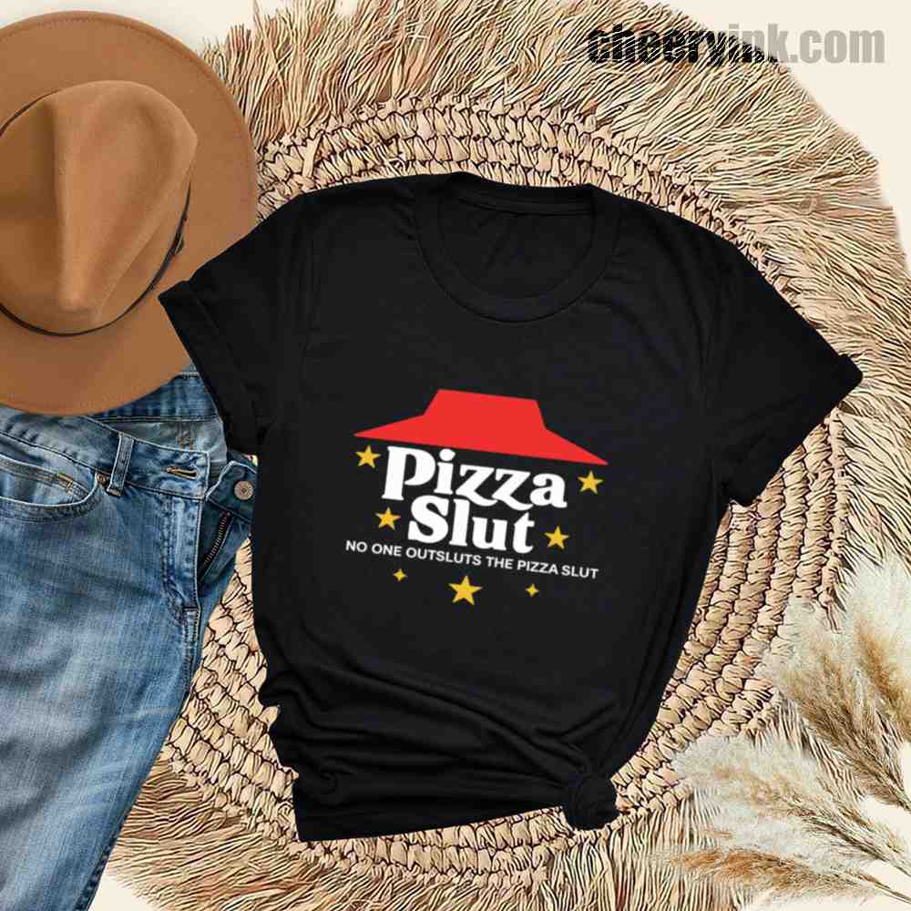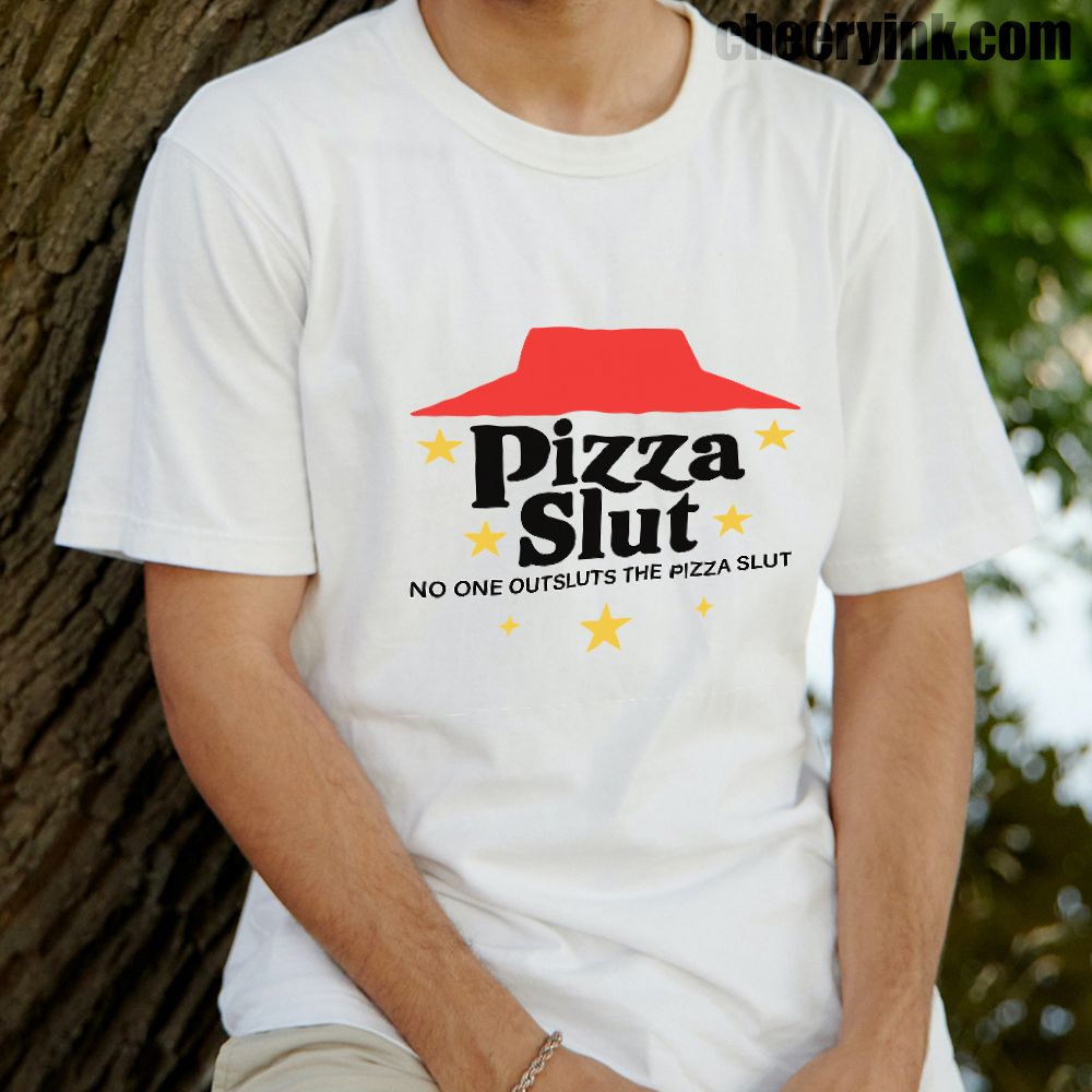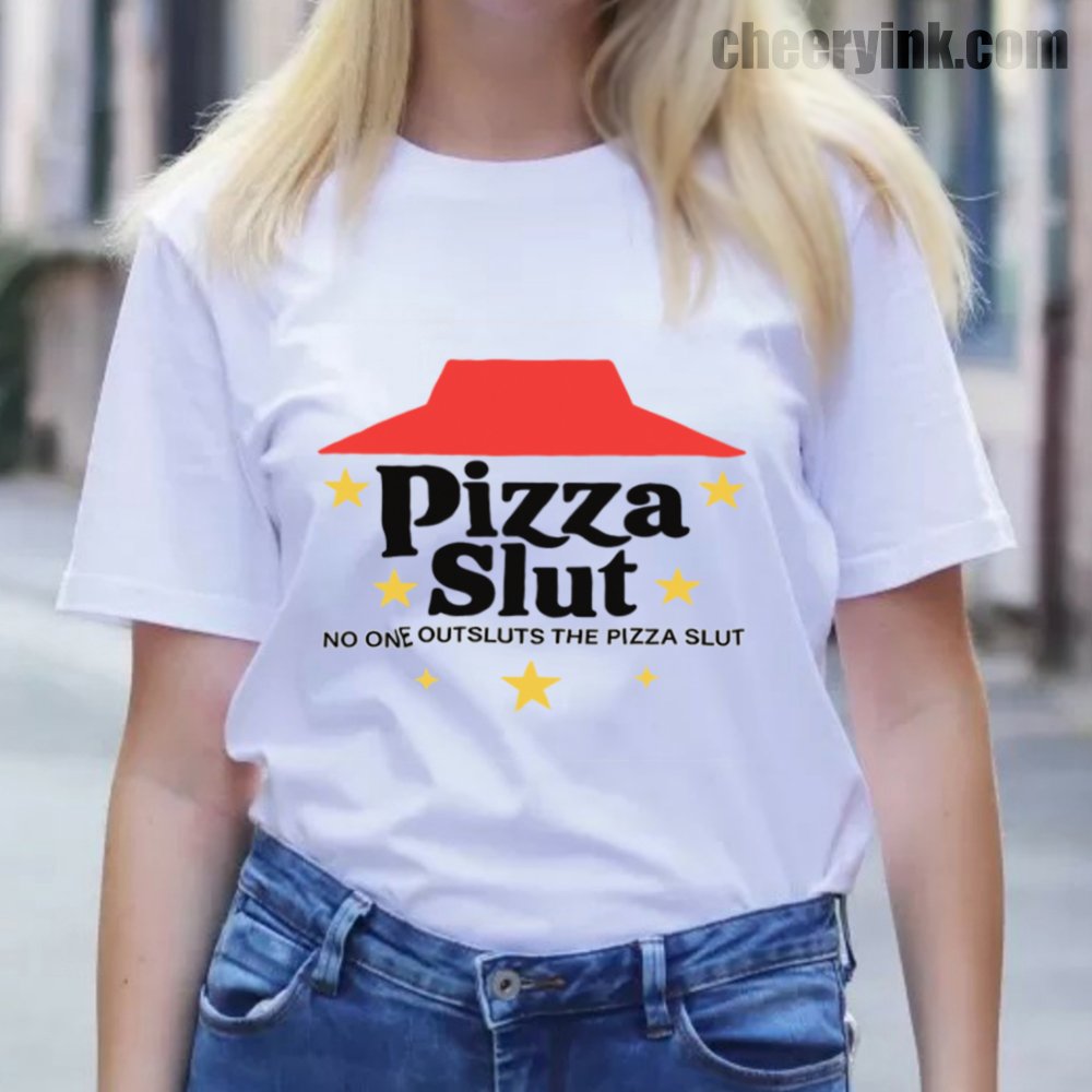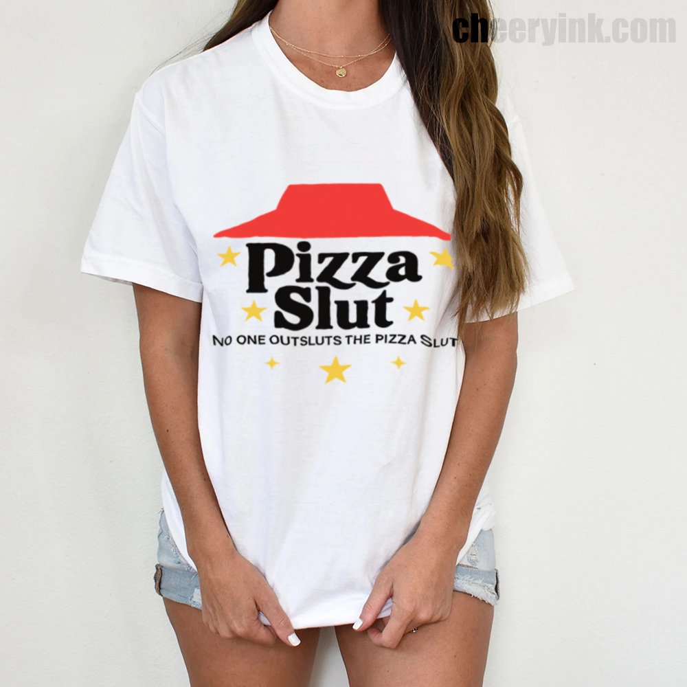 Say it loud, say it proud: you’re the Pizza Slut, and no one outs****s you! This Pizza Slut T-Shirt features a playful parody of a popular pizza brand with a raunchy twist. The bold black text, red roof, and gold stars come together for a cheeky statement piece that’s sure to get attention.