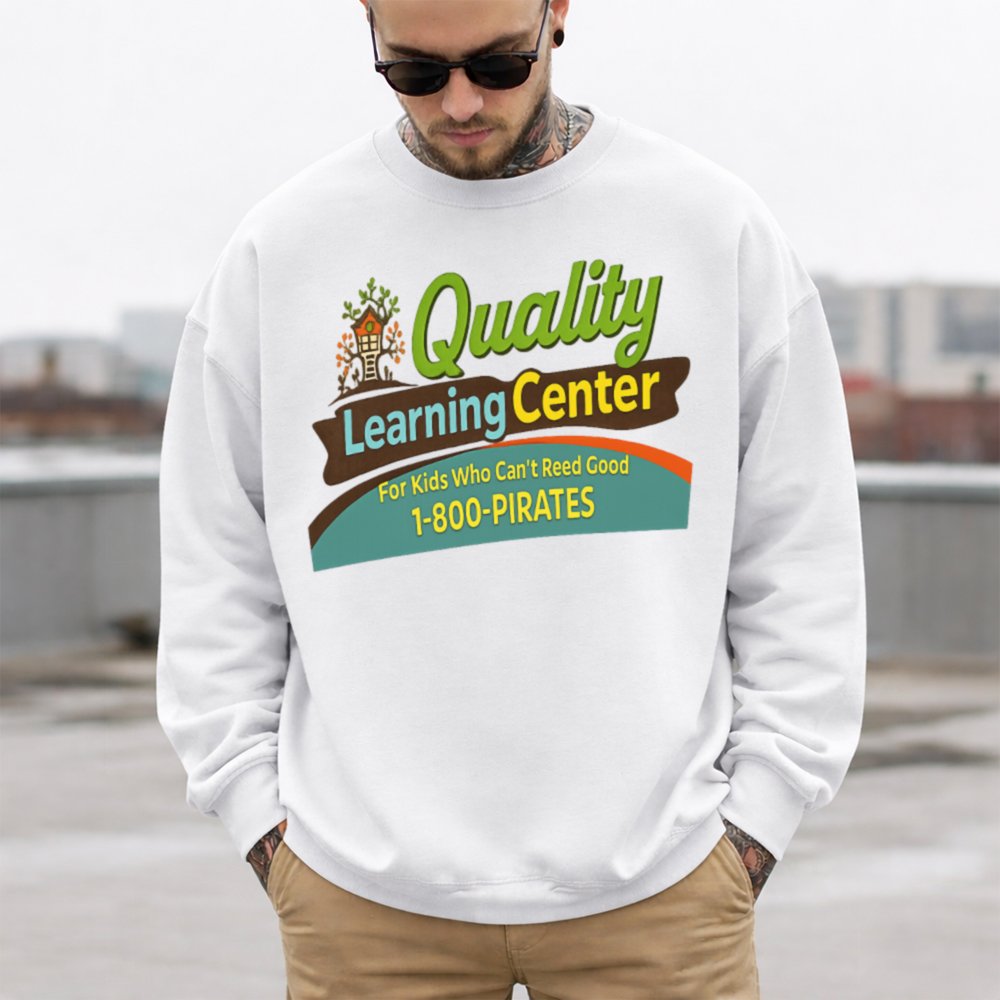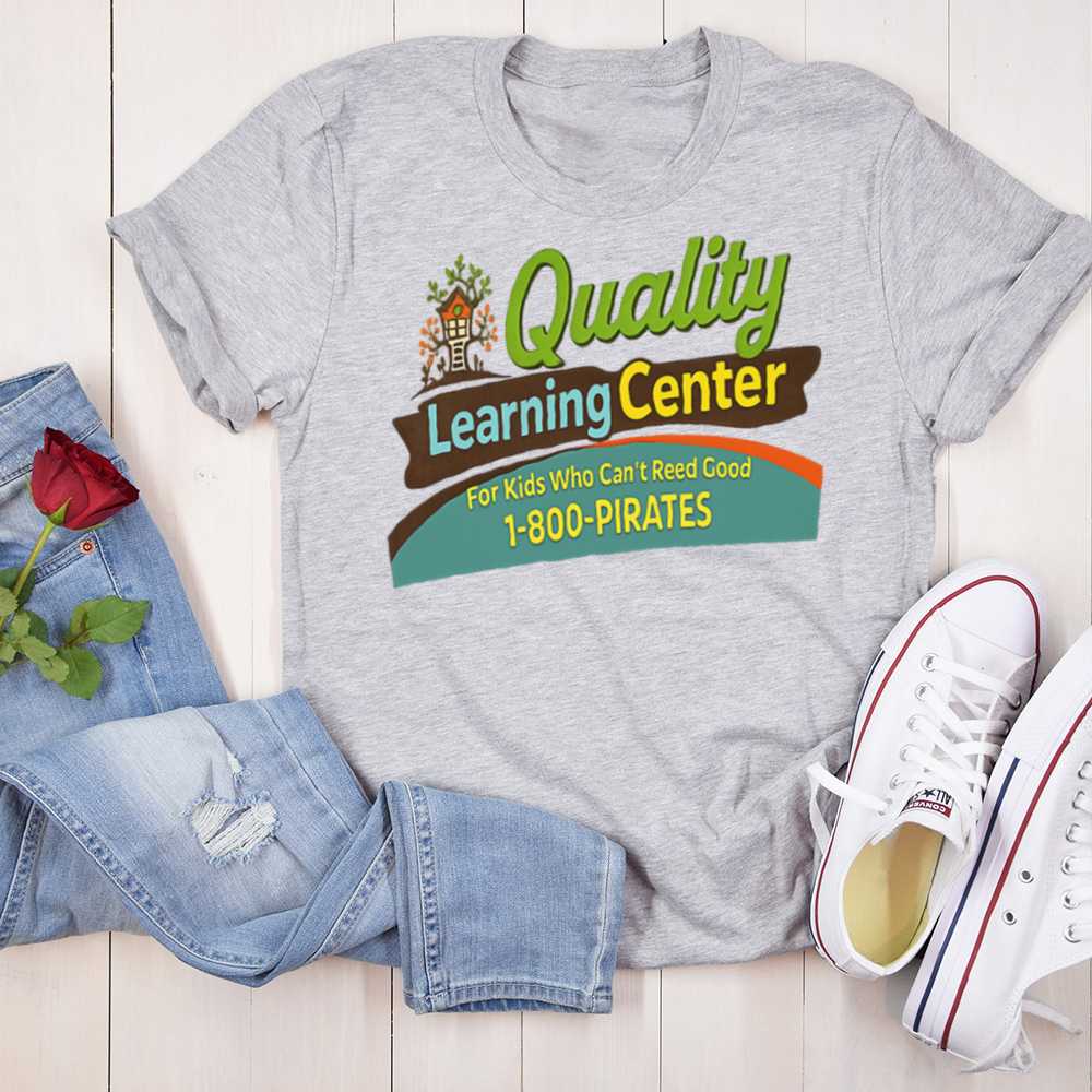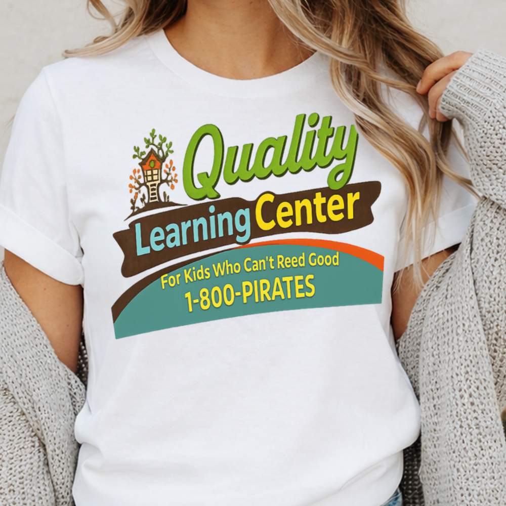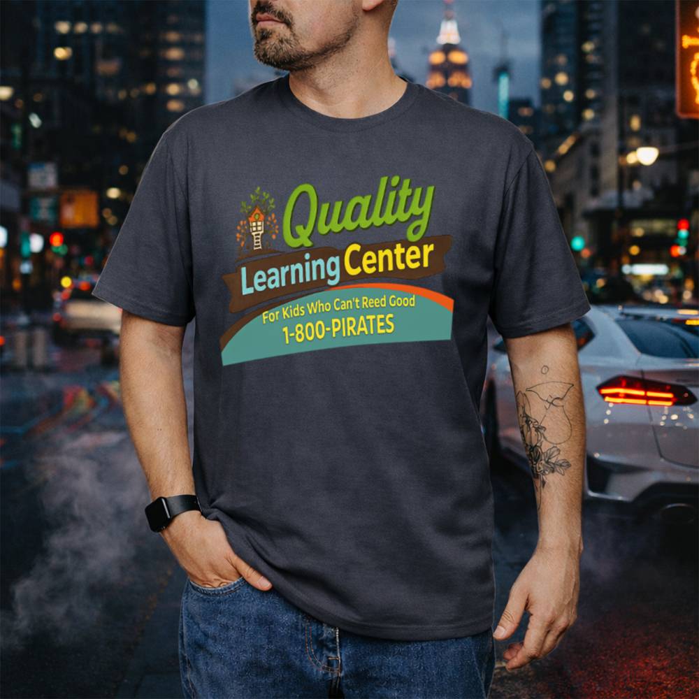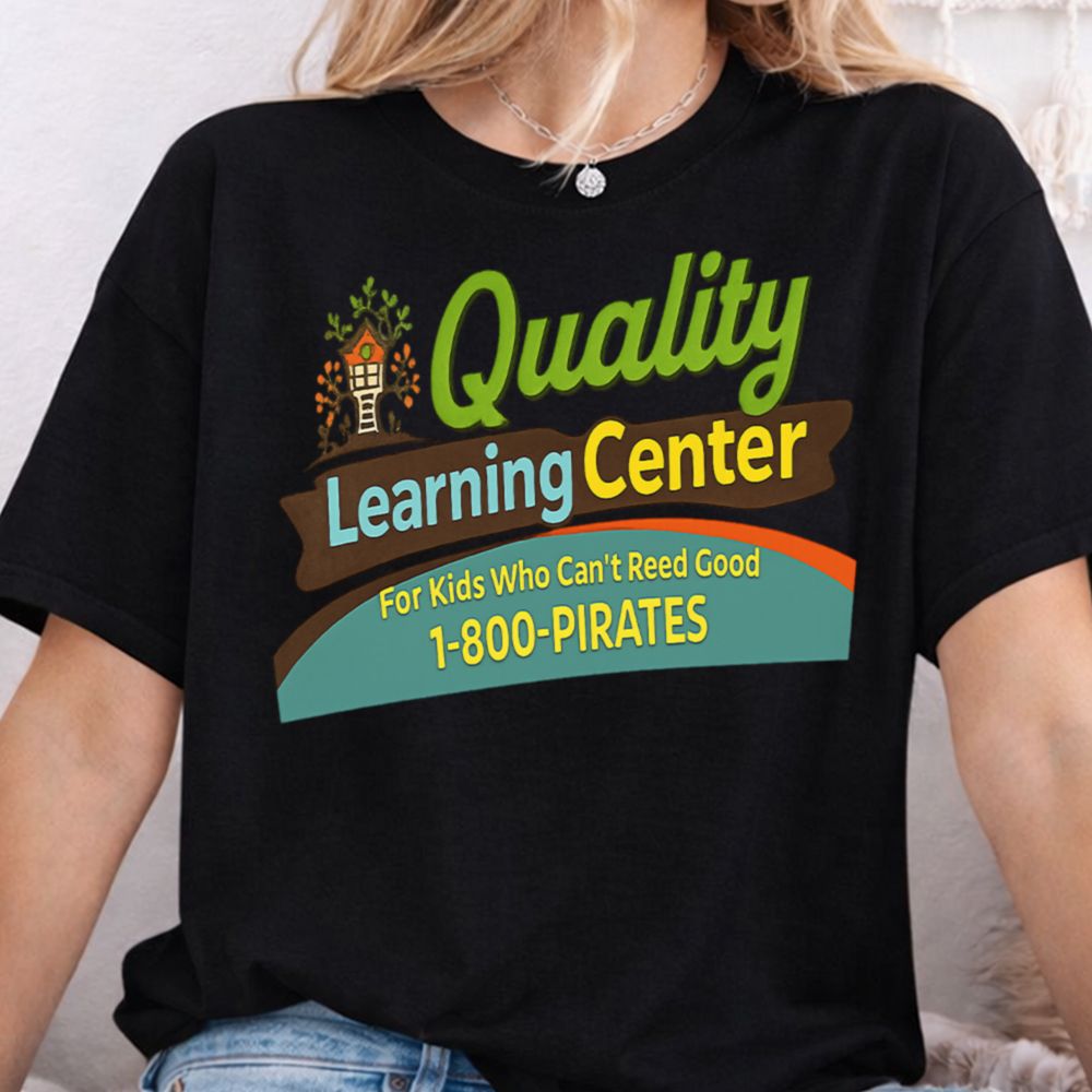 The Quality Learning Center T-Shirt is a comedy goldmine of irony and bad spelling done on purpose. Featuring the phrase “For Kids Who Can’t Reed Good” and the fake hotline 1-800-PIRATES, this unisex tee is the ultimate tribute to absurd humor and chaotic energy.