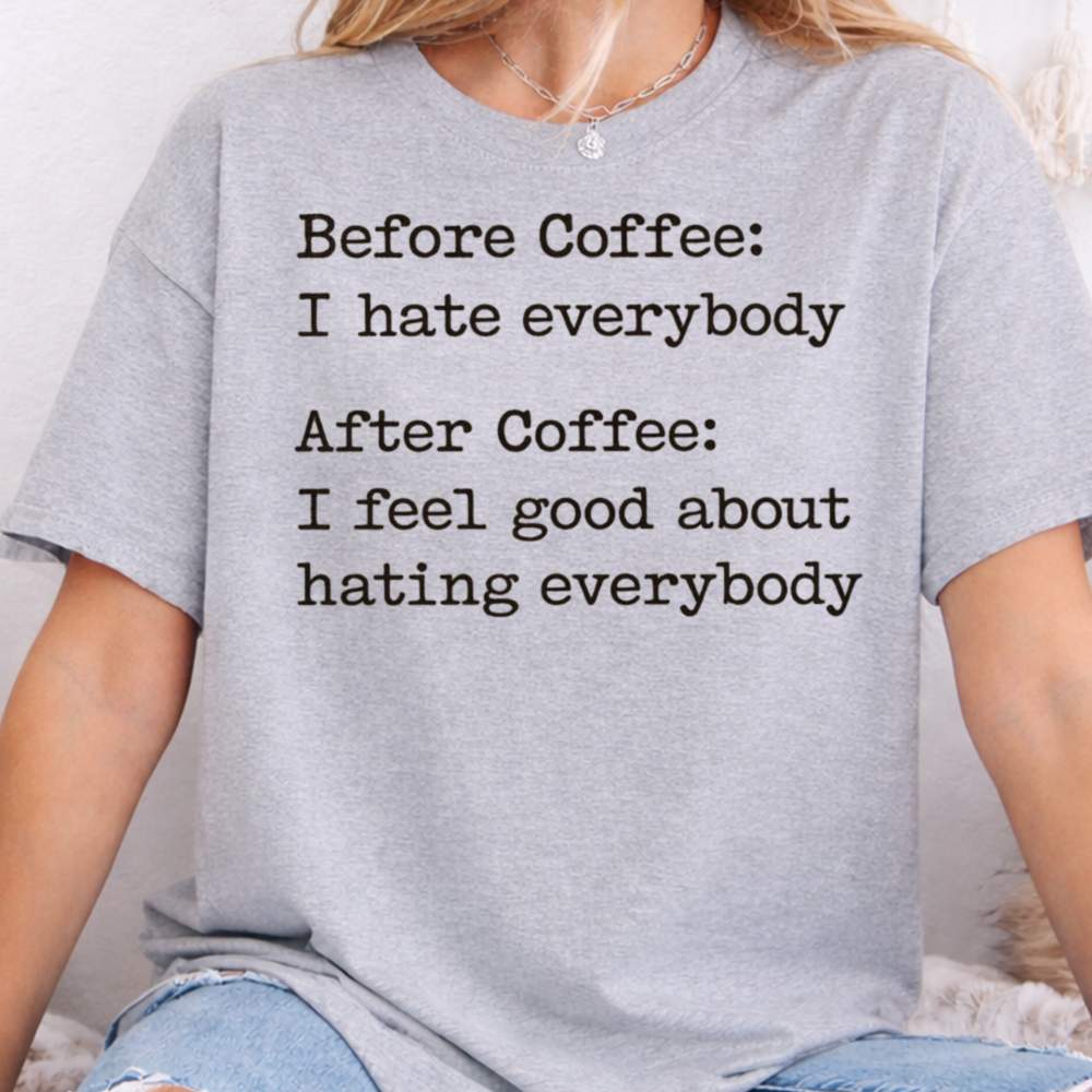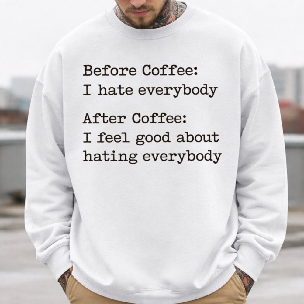 The sarcastic introvert caffeine-dependent mood swing t-shirt captures that all-too-relatable truth: mornings require fuel before friendliness. Featuring the bold phrase “Before Coffee: I hate everybody. After Coffee: I feel good about hating everybody,” this design blends dry wit with unapologetic self-awareness.