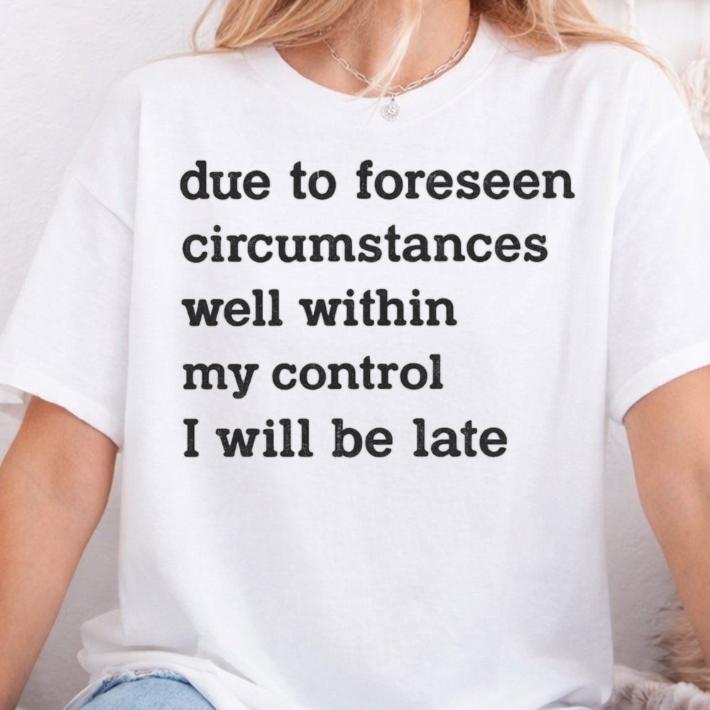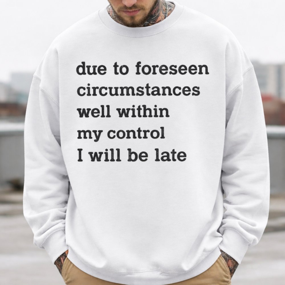 The phrase about “foreseen circumstances” playfully flips responsibility on its head, turning habitual lateness into a confident personality trait. It’s less about poor time management and more about prioritizing your own rhythm over external pressure. For introverts especially, extra time alone often beats arriving early to forced small talk.