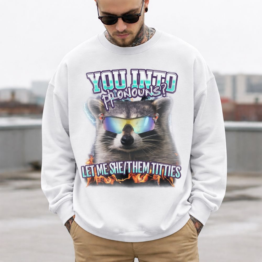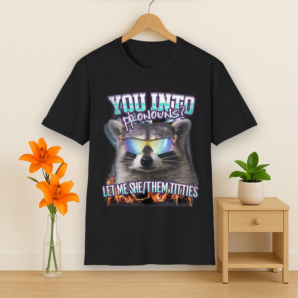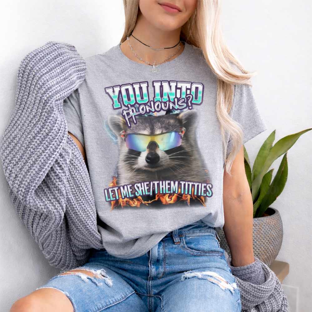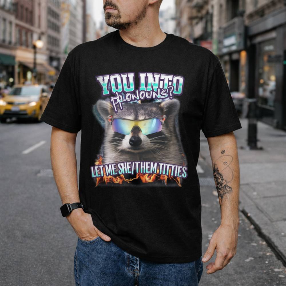 The She/They Pronouns T-Shirt is unapologetically bold, queer, and hilarious. Featuring a raccoon in rainbow-tinted sunglasses surrounded by flames, this viral-style graphic pairs hard-hitting humor with an empowering edge. The phrase “YOU INTO PRONOUNS? LET ME SHE/THEM TITTIES” is exactly the kind of chaotic energy the queer internet adores part comedy, part protest, 100% confidence.