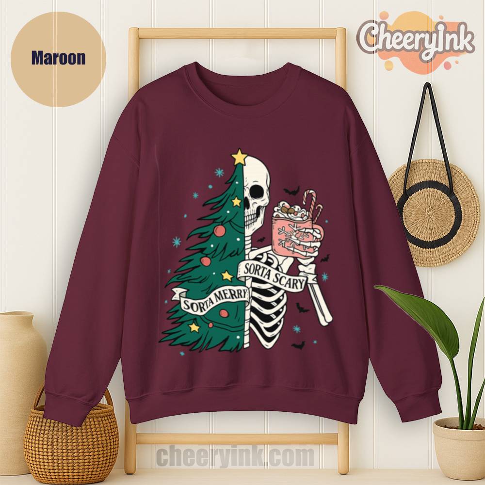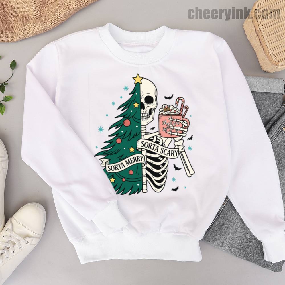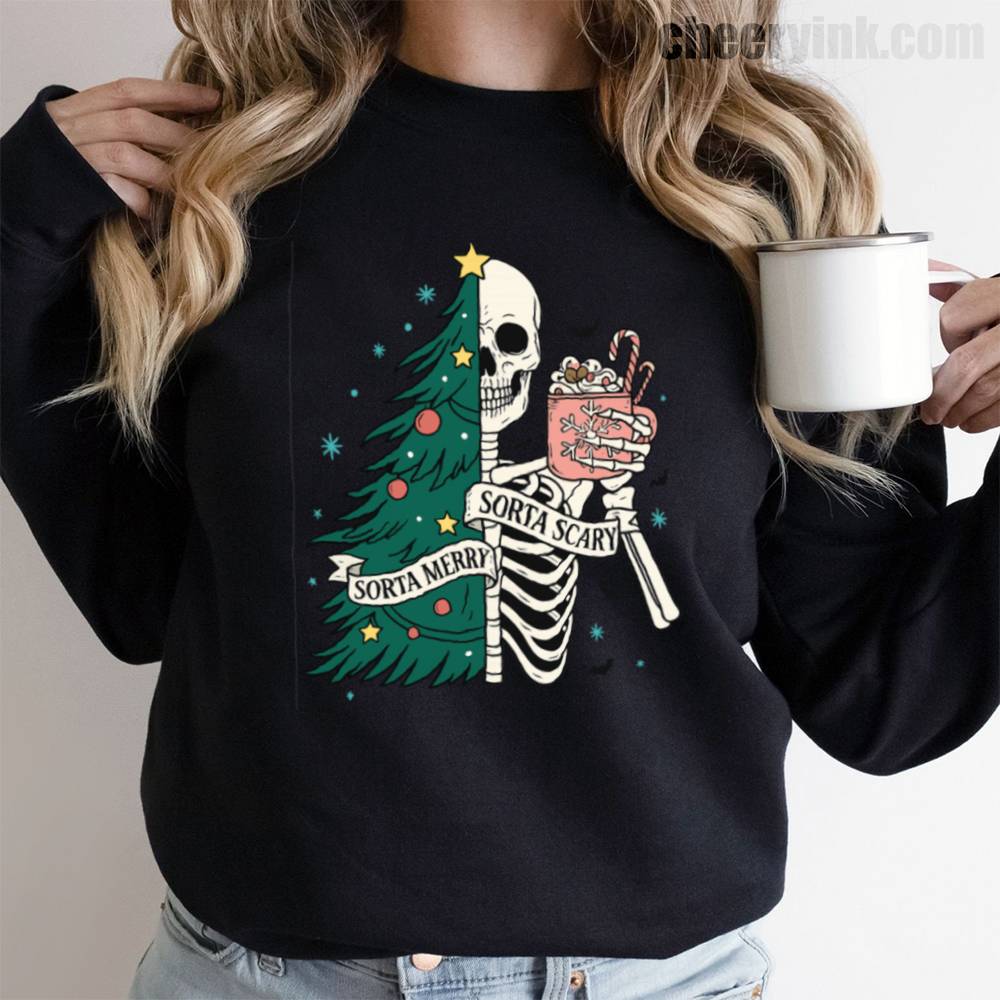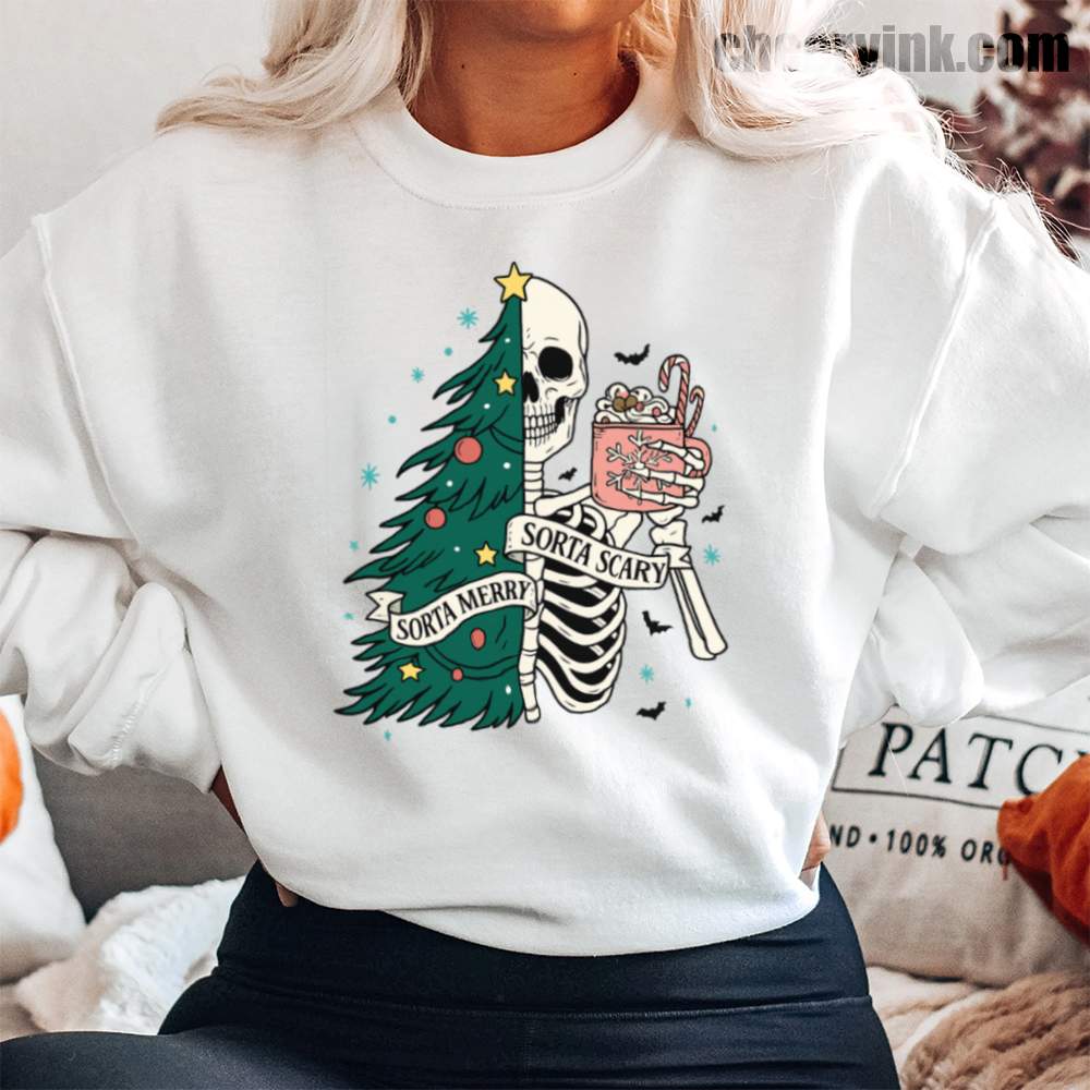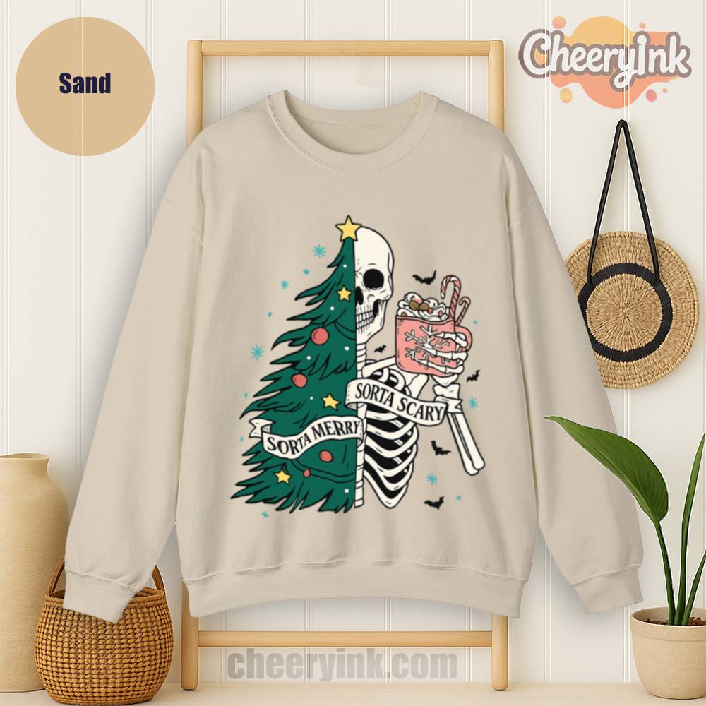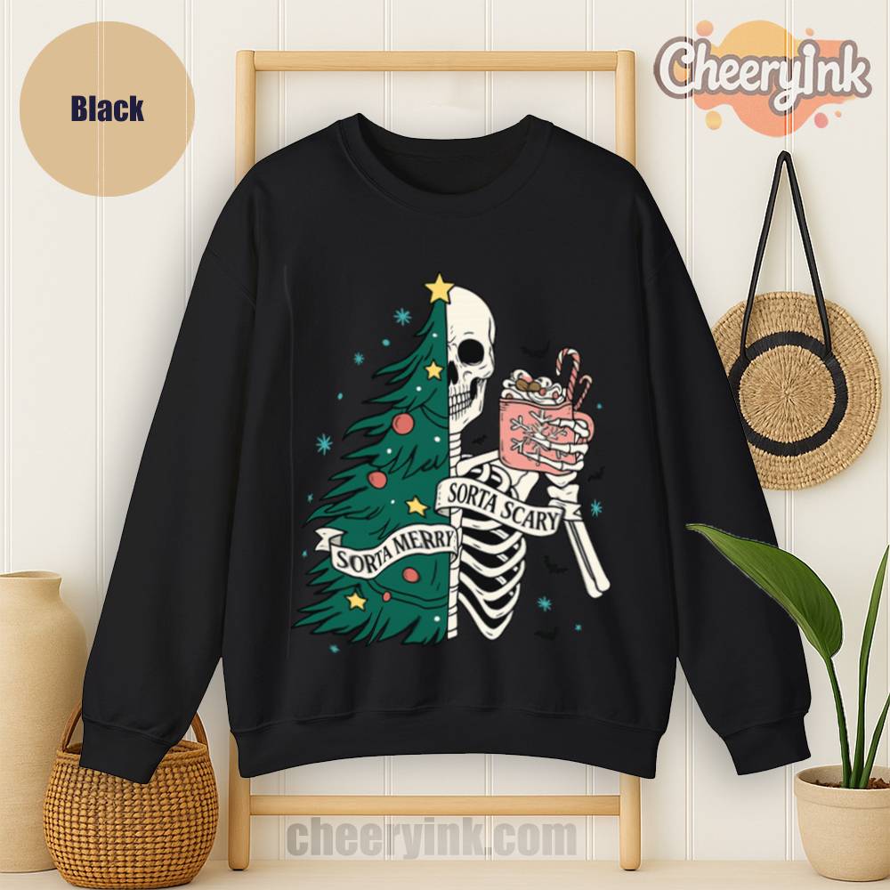 The Sorta Merry Sorta Scary Sweatshirt brings the spooky season straight into your Christmas celebration. With its half-skeleton, half-tree design and playful candy cane cocoa, it’s perfect for those who love the strange and festive.
