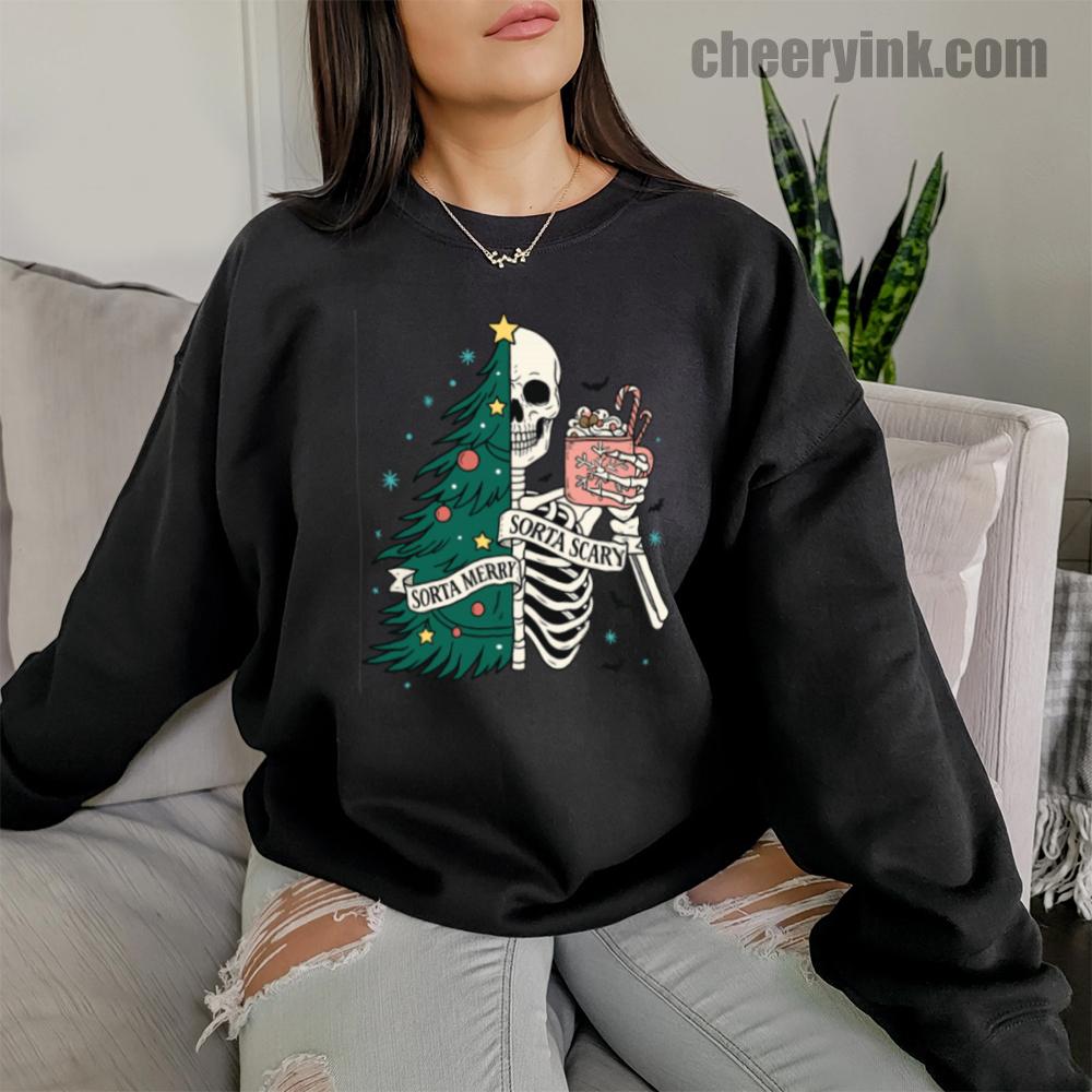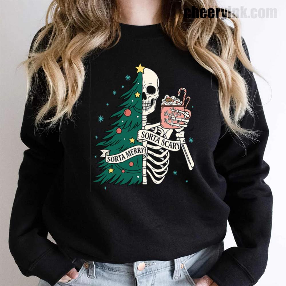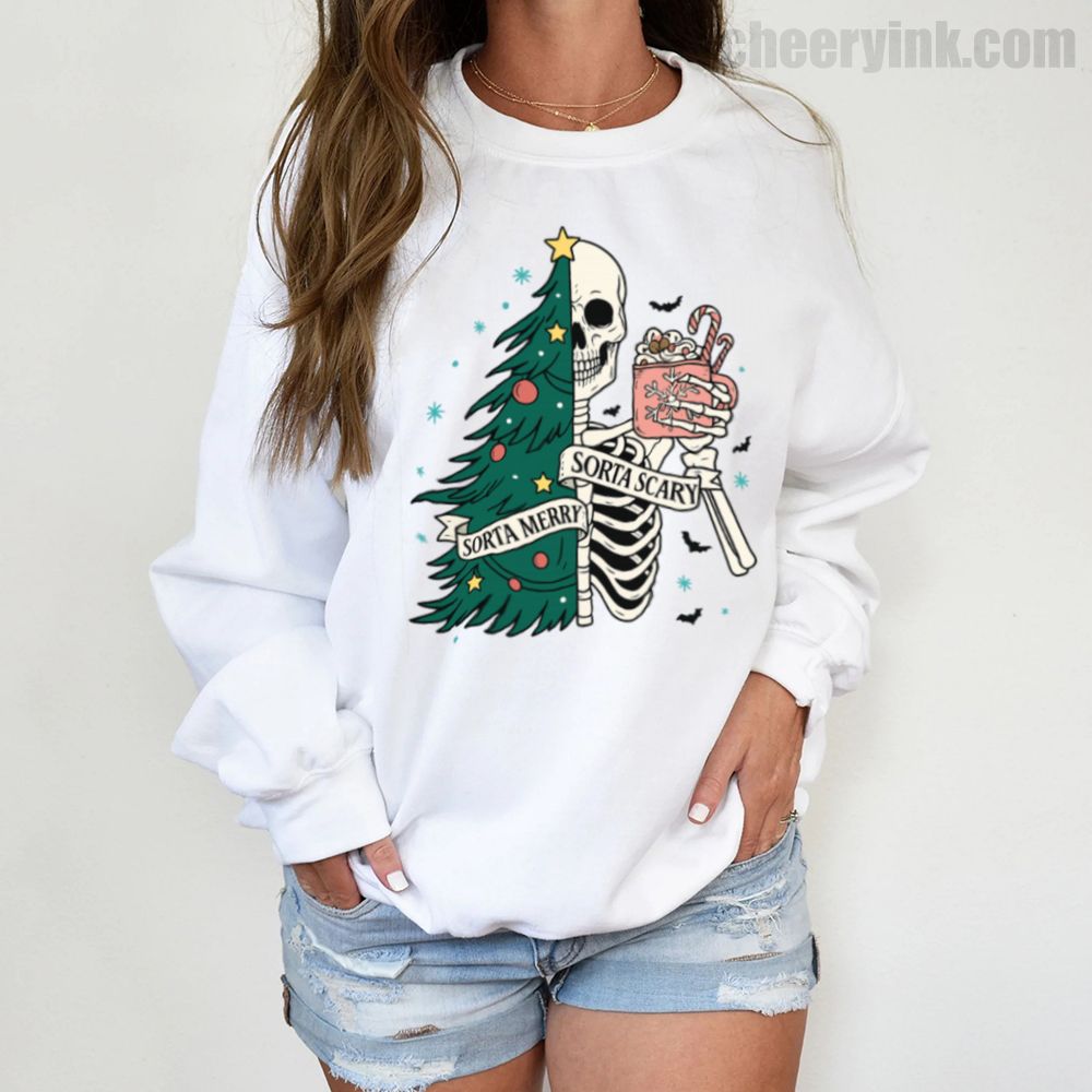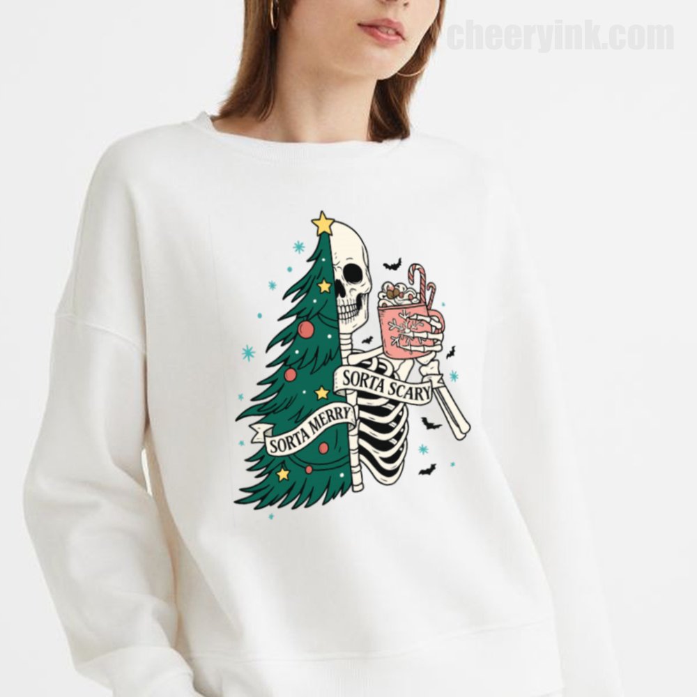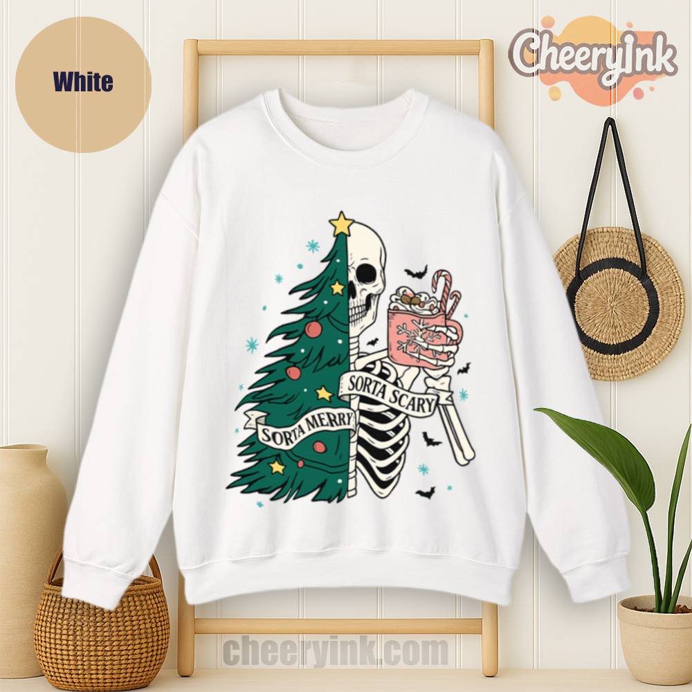 The Sorta Merry Sorta Scary Sweatshirt brings the spooky season straight into your Christmas celebration. With its half-skeleton, half-tree design and playful candy cane cocoa, it’s perfect for those who love the strange and festive.