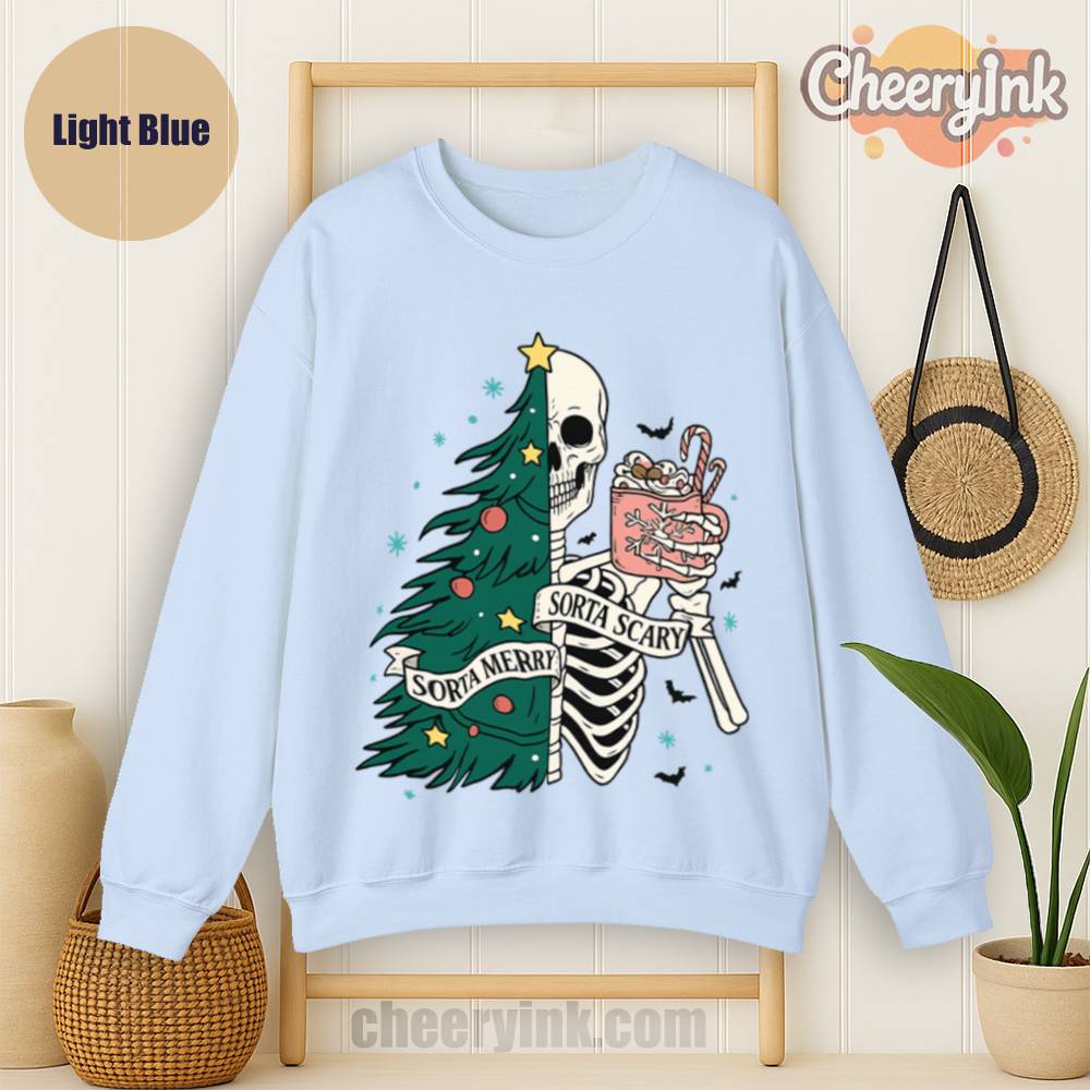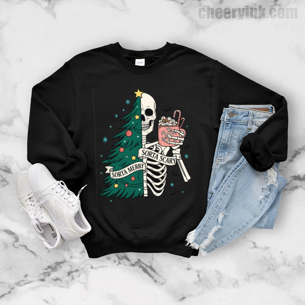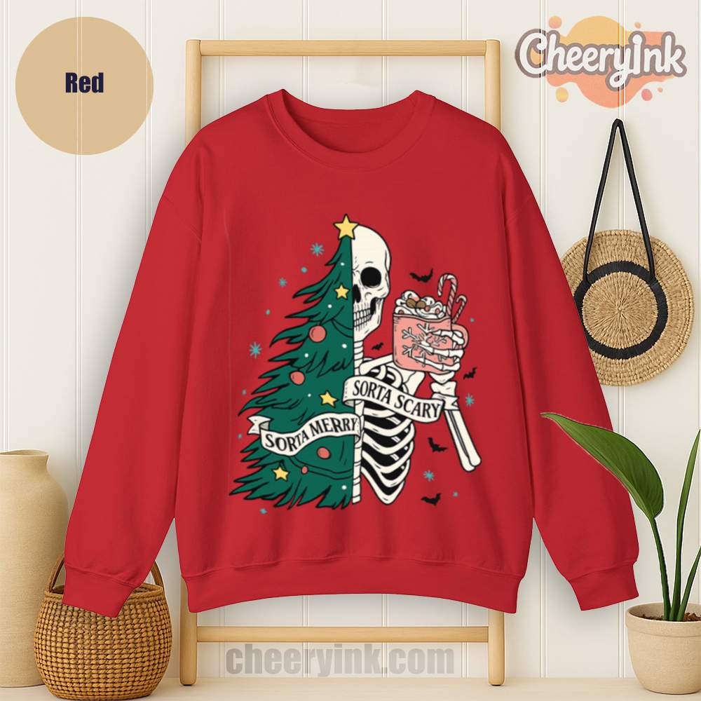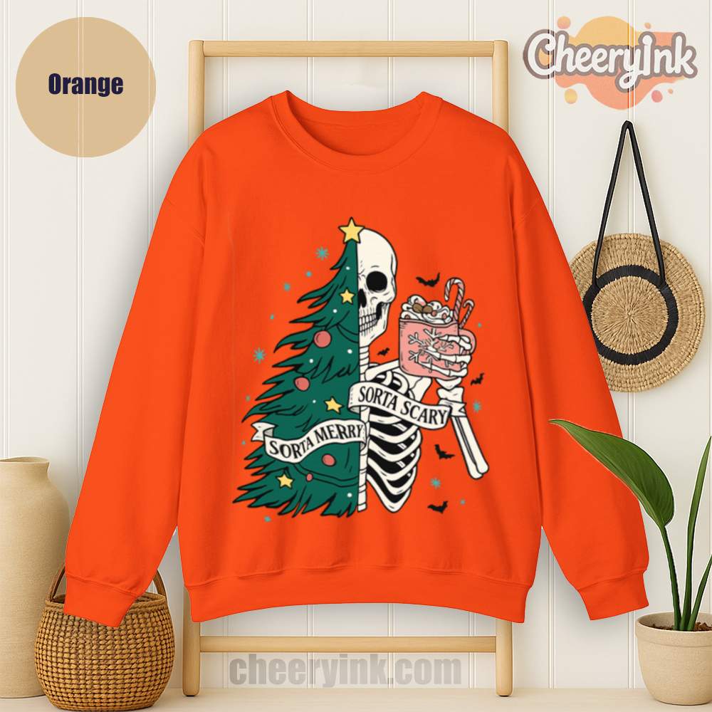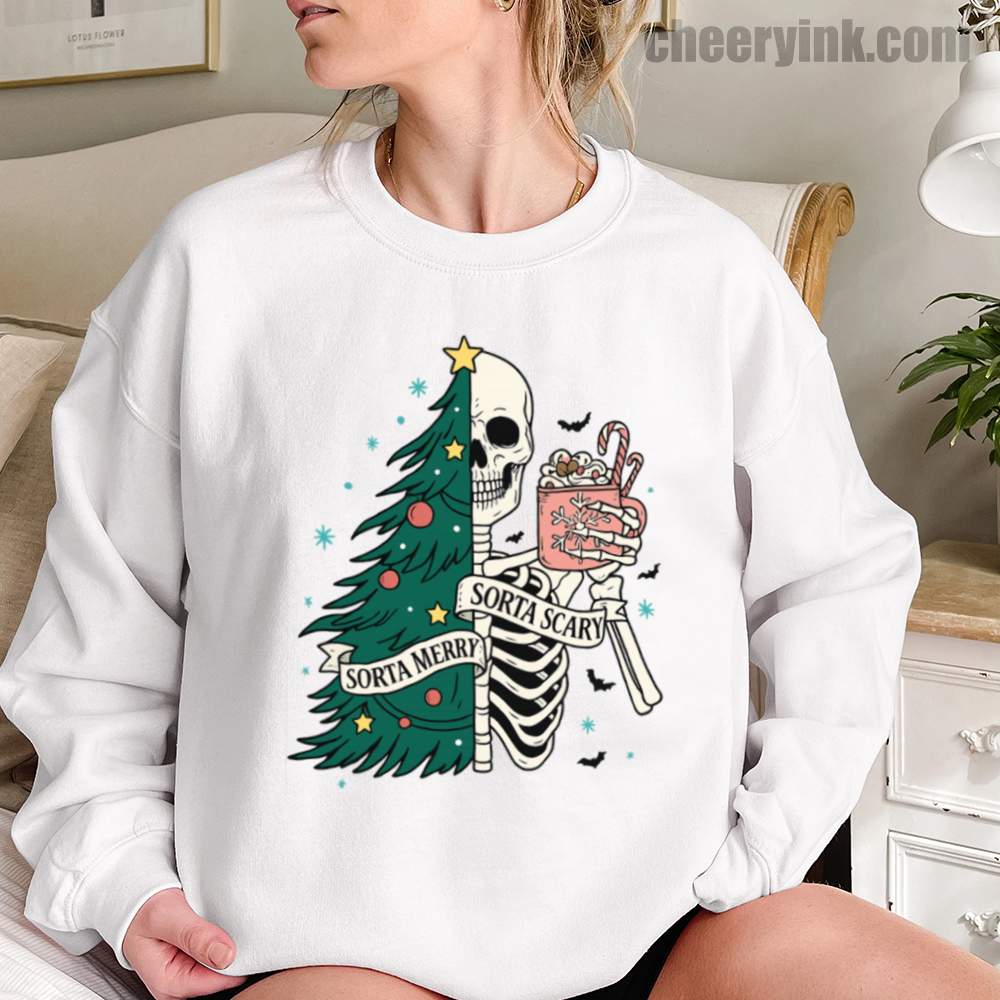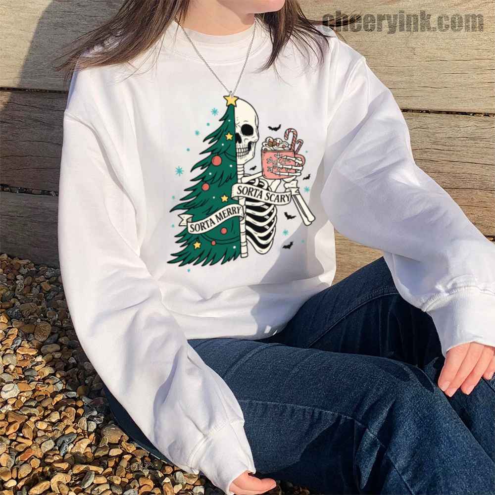 The Sorta Merry Sorta Scary Sweatshirt brings the spooky season straight into your Christmas celebration. With its half-skeleton, half-tree design and playful candy cane cocoa, it’s perfect for those who love the strange and festive.