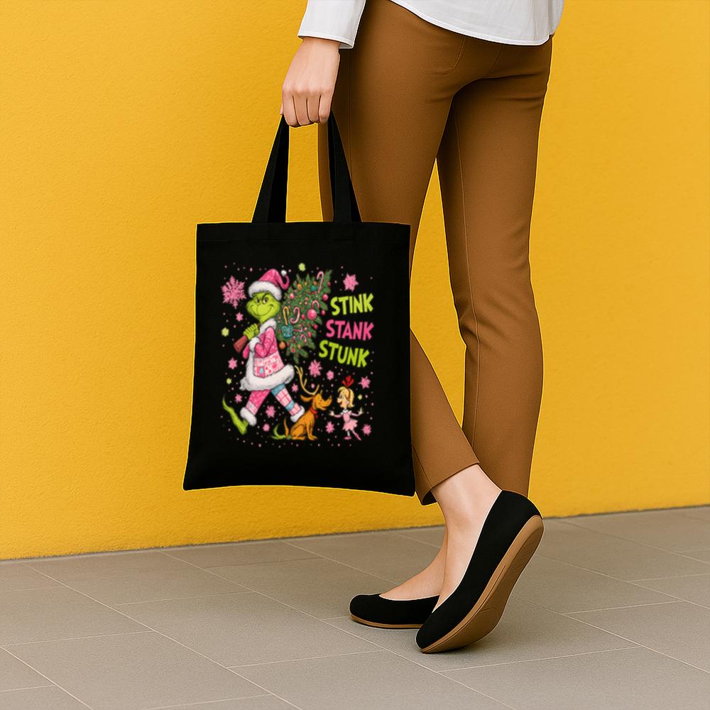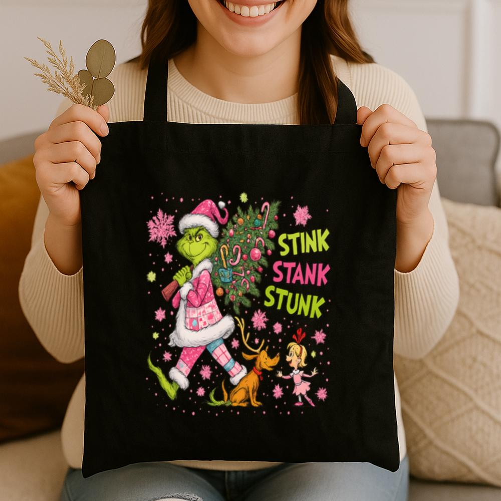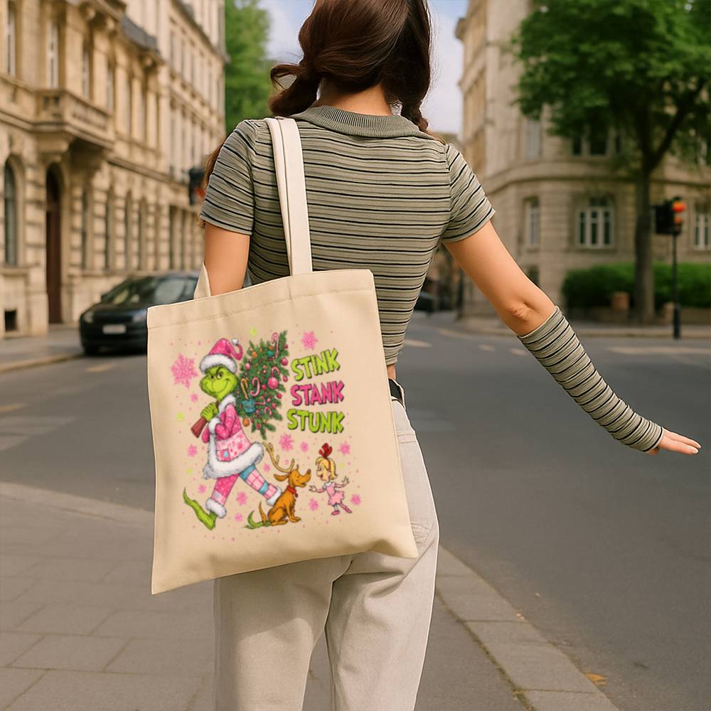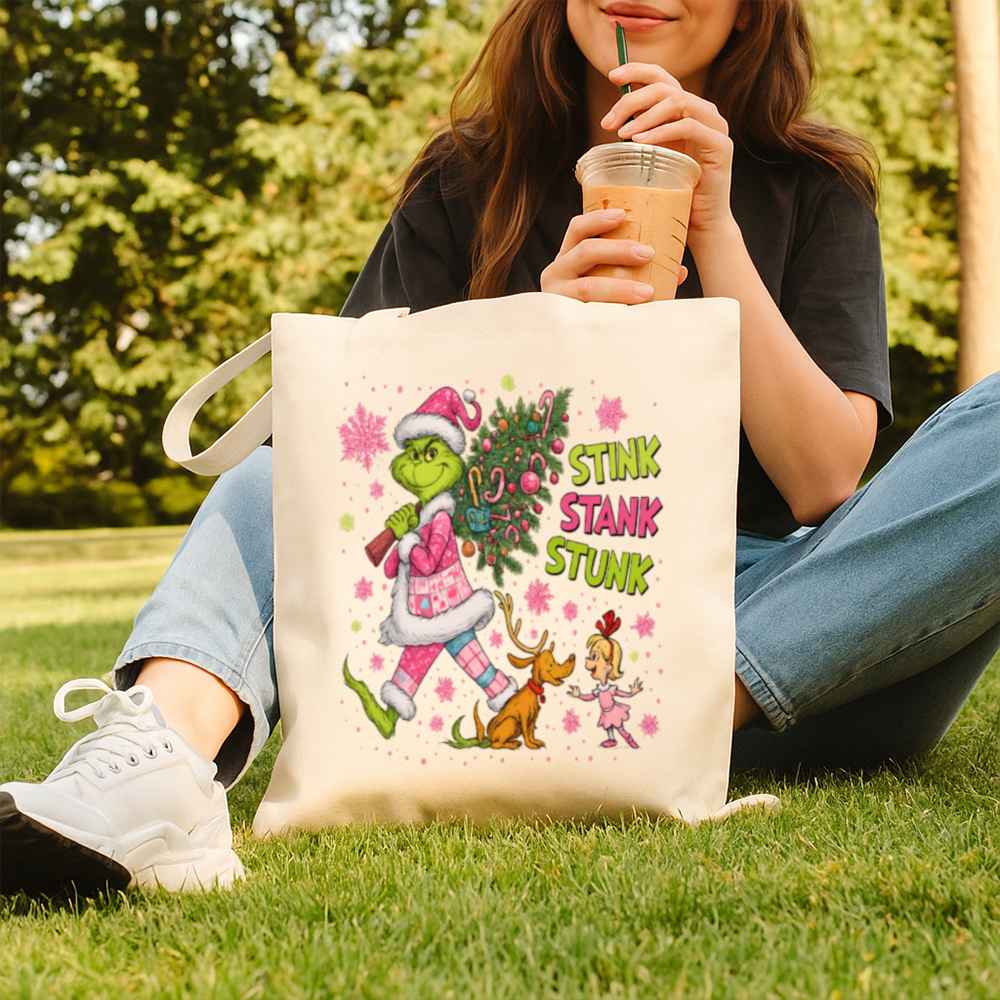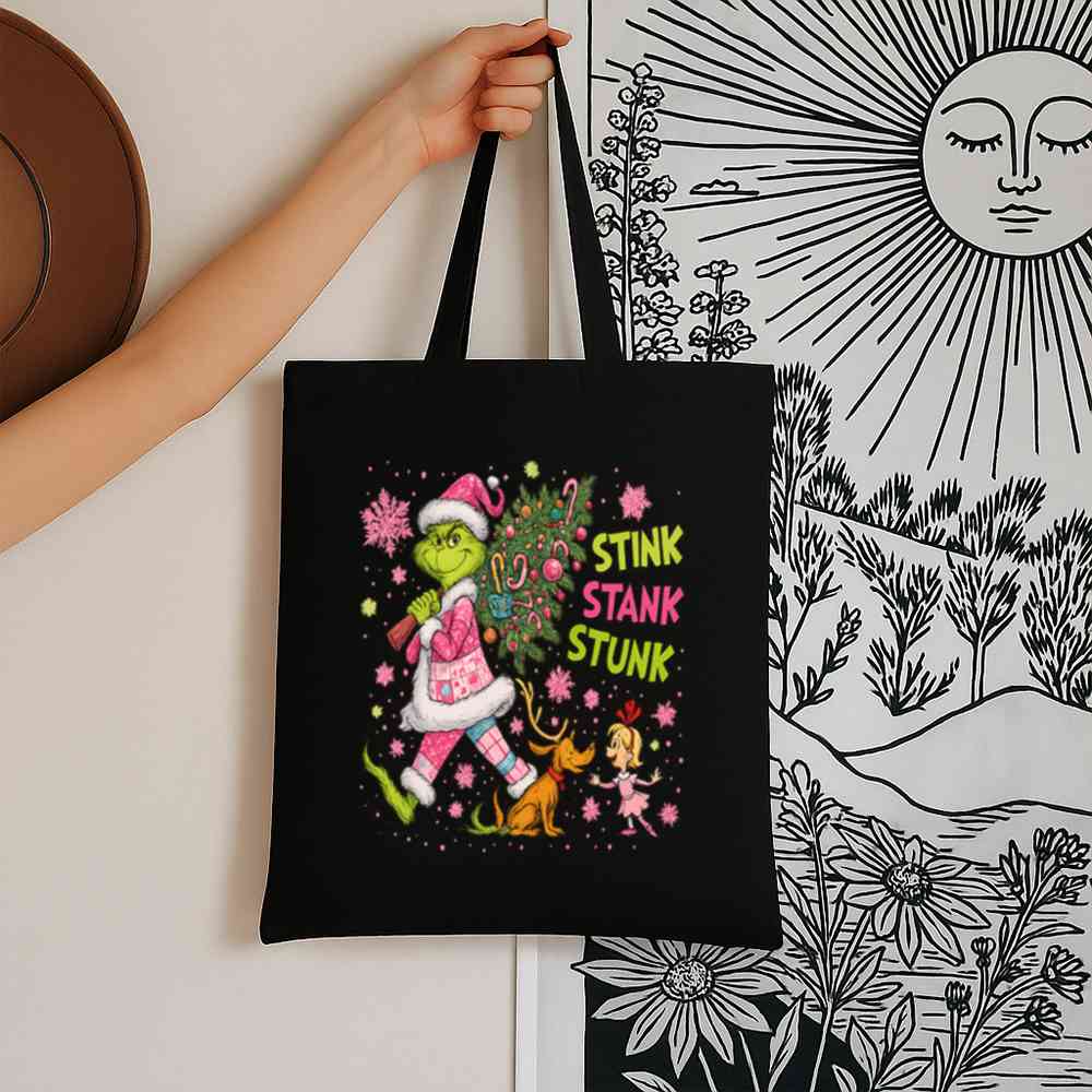 The Stink Stank Stunk Tote Bag delivers both function and festive snark. With its bright, cheeky design featuring a green Christmas grump, a decked-out tree, and sassy quote, this tote is the perfect match for sarcastic holiday shoppers and eco-conscious grinches alike.