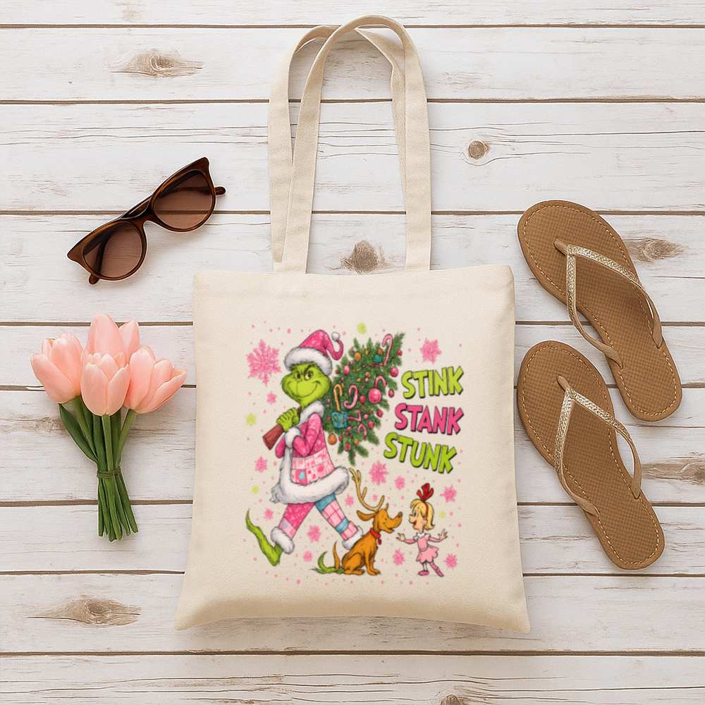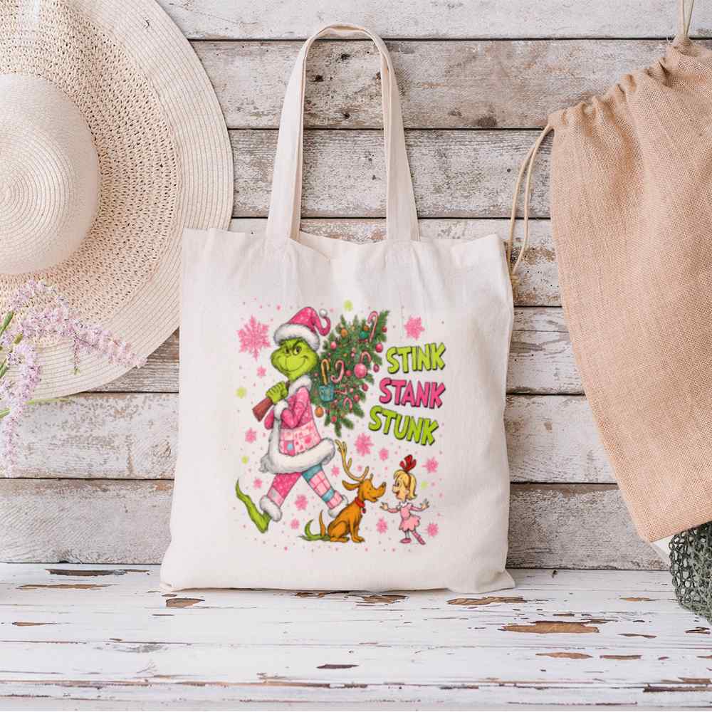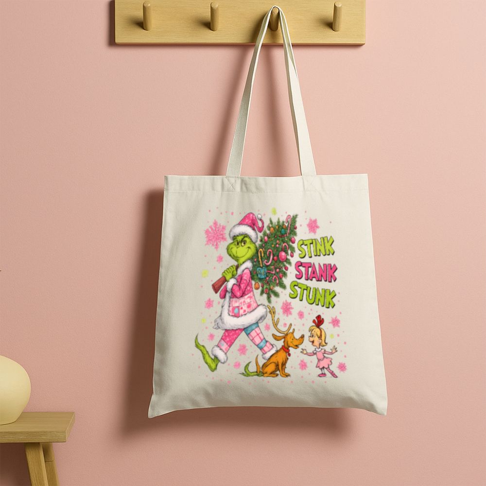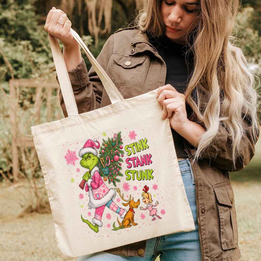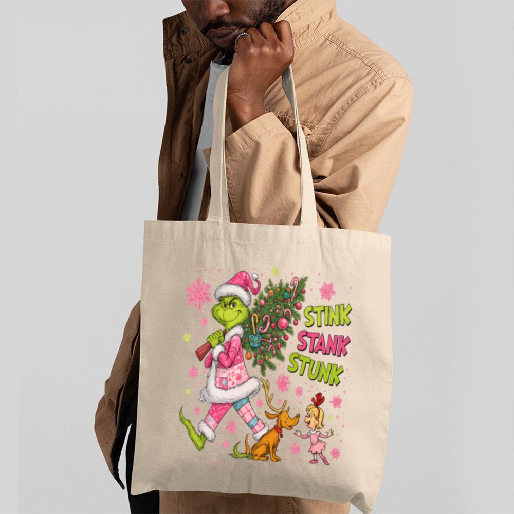 The Stink Stank Stunk Tote Bag delivers both function and festive snark. With its bright, cheeky design featuring a green Christmas grump, a decked-out tree, and sassy quote, this tote is the perfect match for sarcastic holiday shoppers and eco-conscious grinches alike.