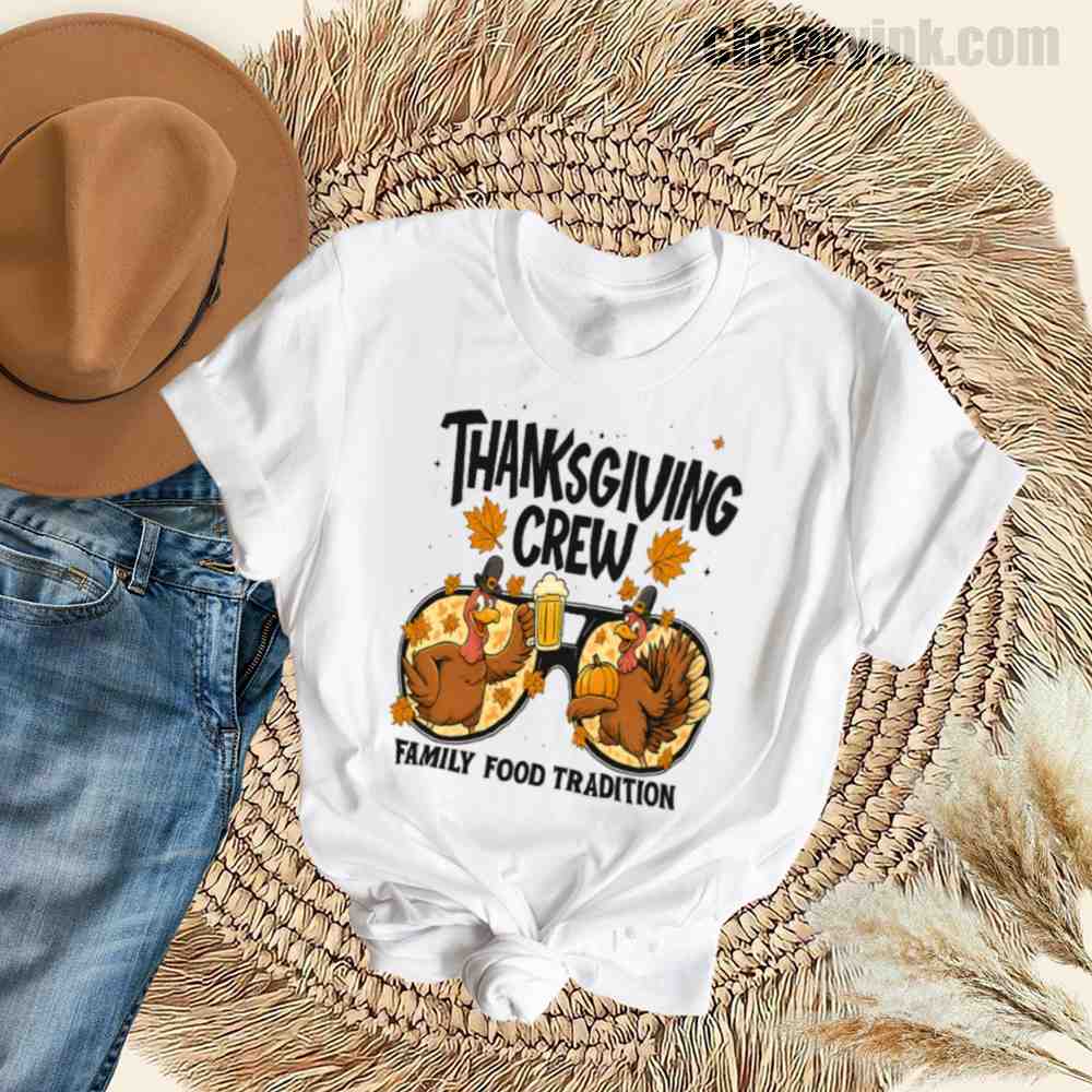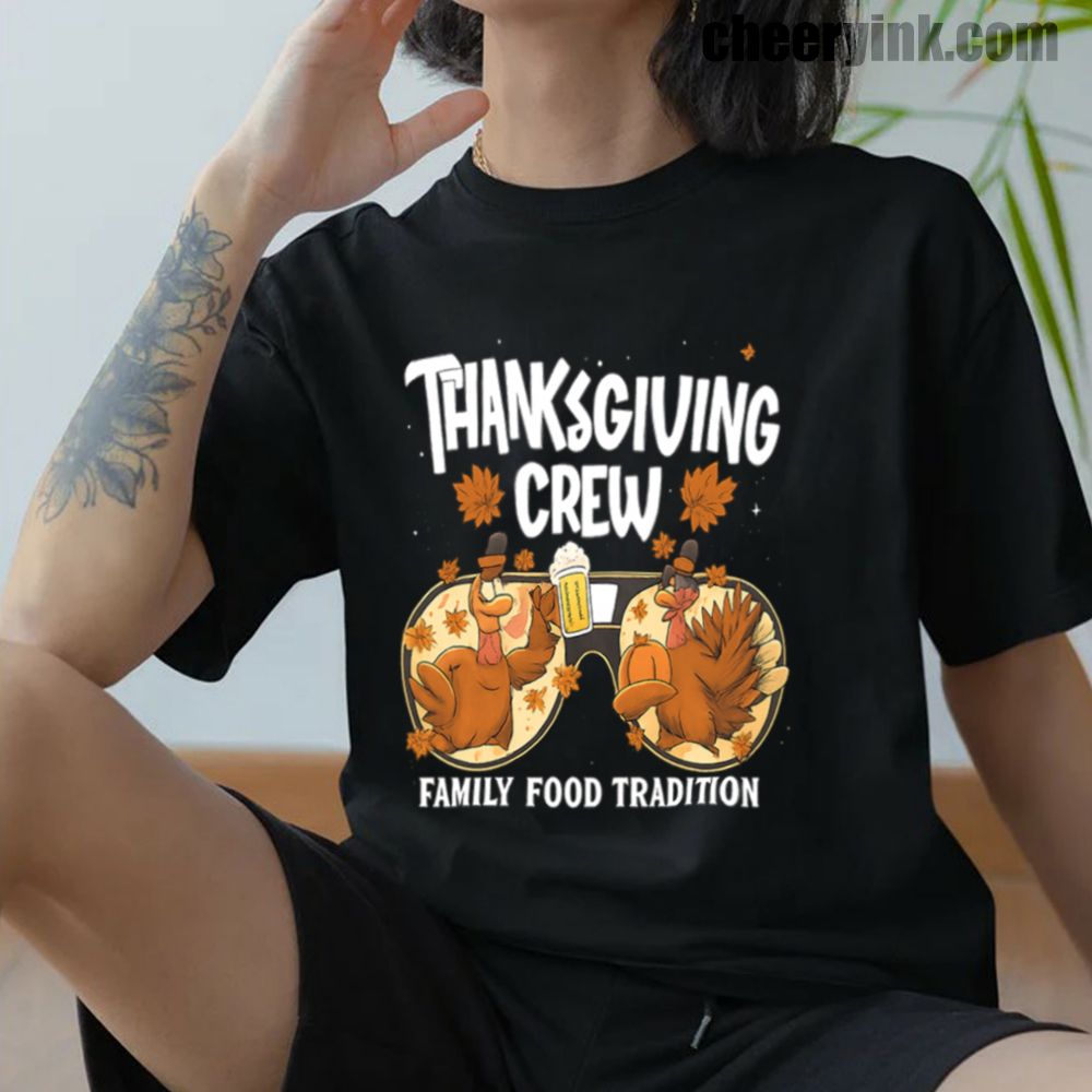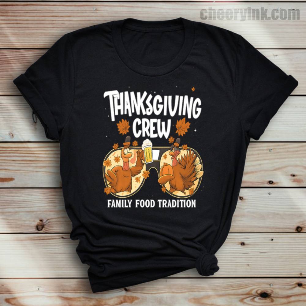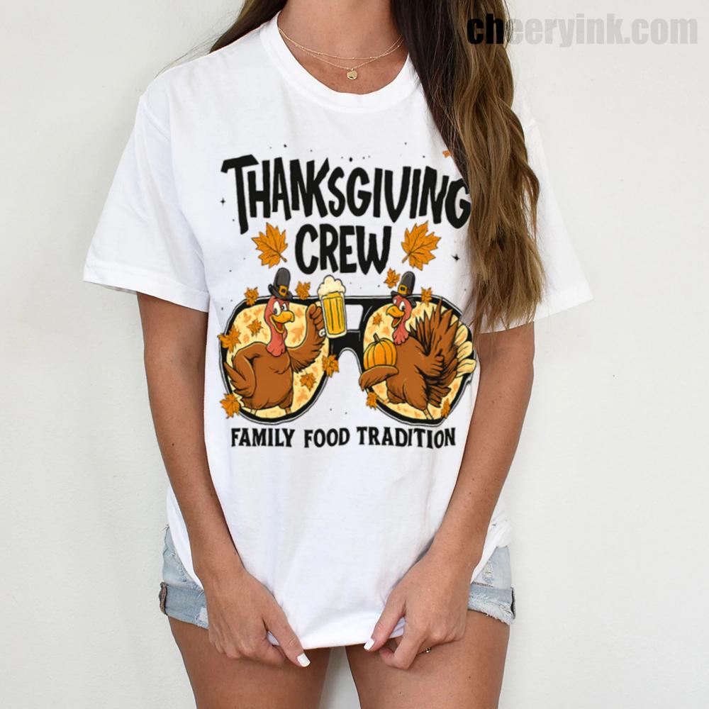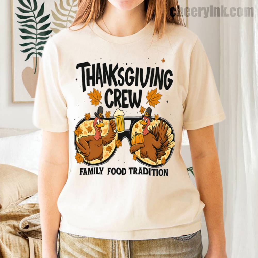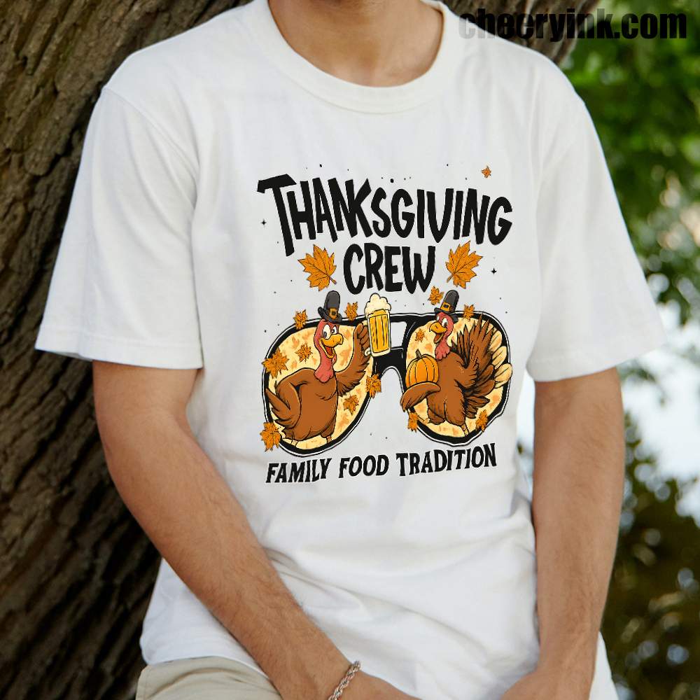 Get ready to feast and laugh in the Thanksgiving Crew T-Shirt.  a fun and festive way to show off your holiday spirit. With a cheerful design featuring cartoon turkeys, autumn leaves, beer mugs, and pumpkins all reflected in retro sunglasses, this tee is a must-have for your holiday wardrobe. Whether you’re the host or the guest, this shirt lets everyone know you’re part of the Thanksgiving fun.