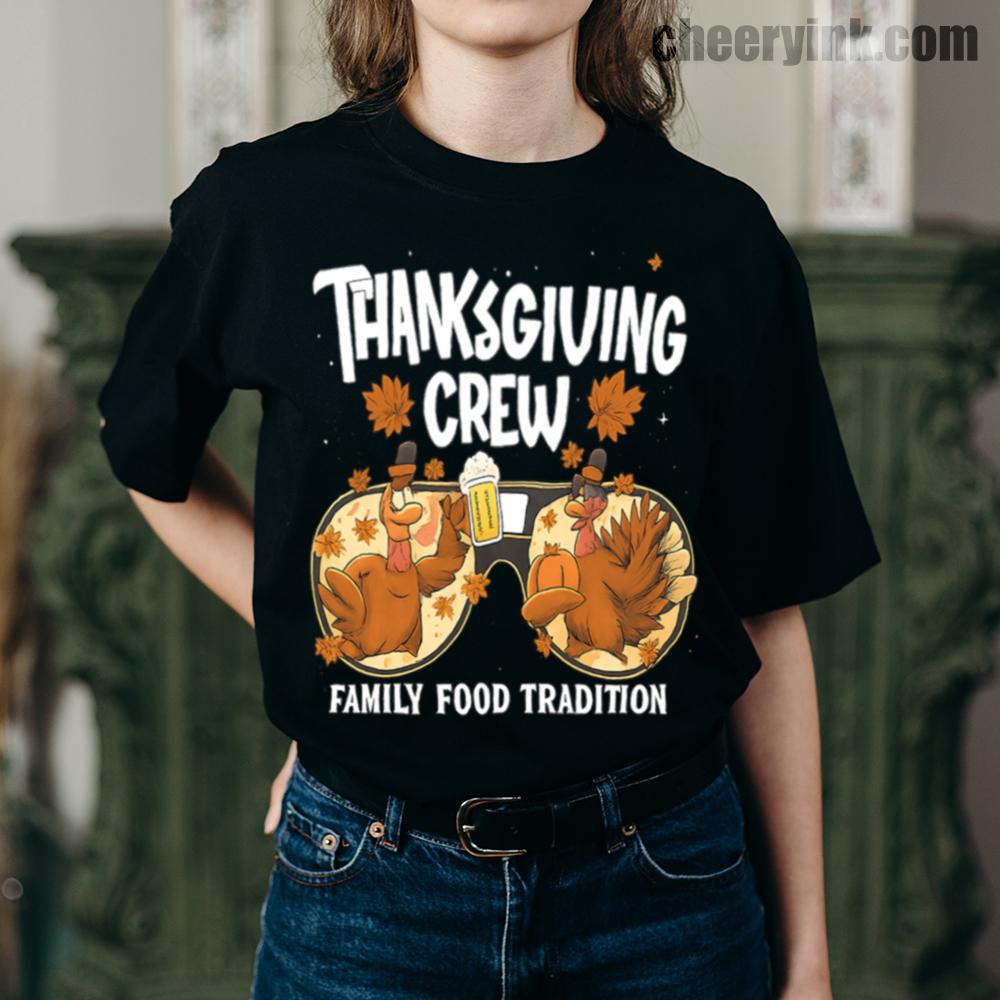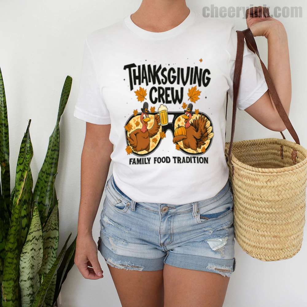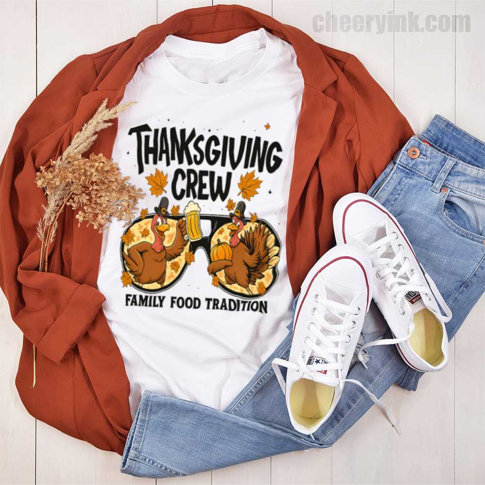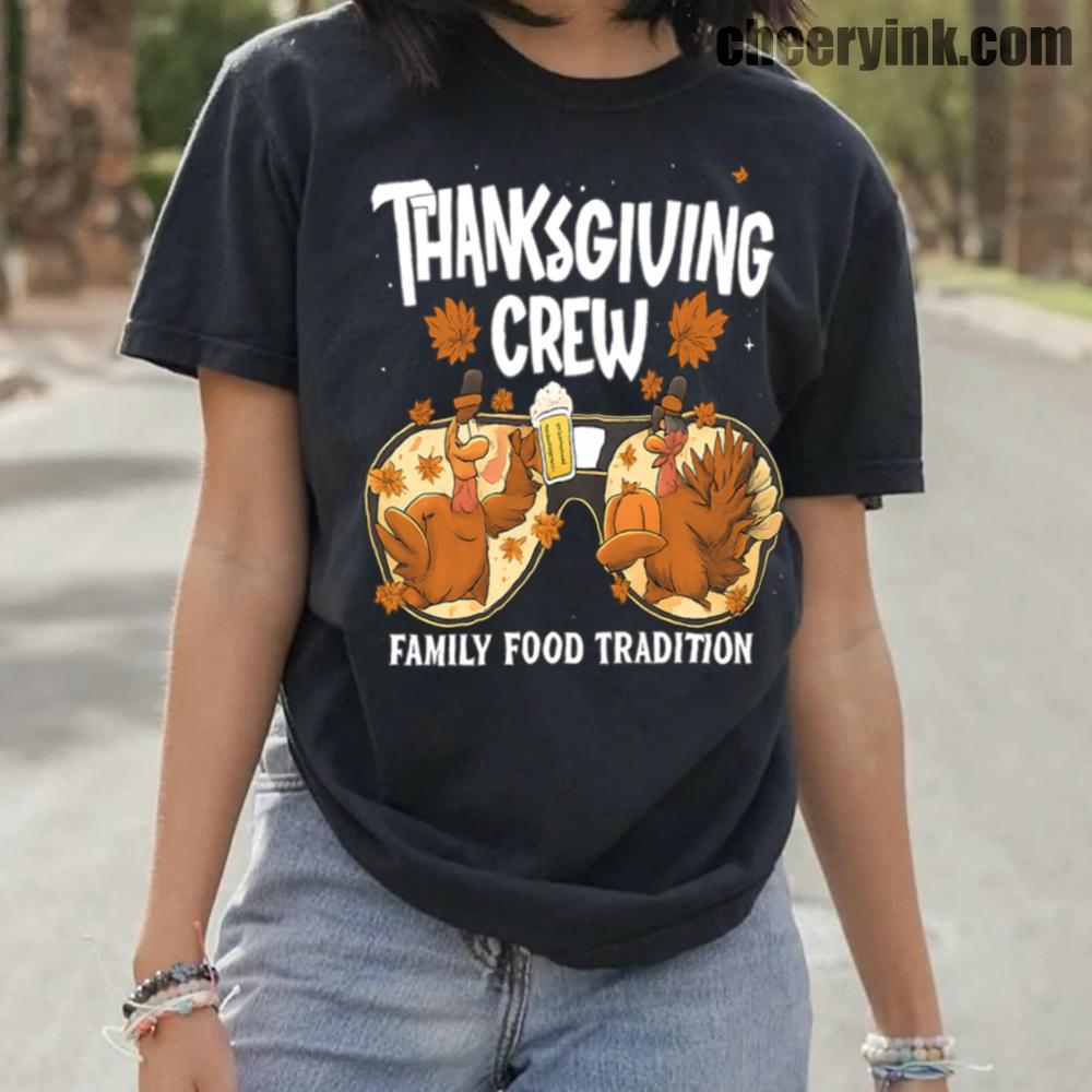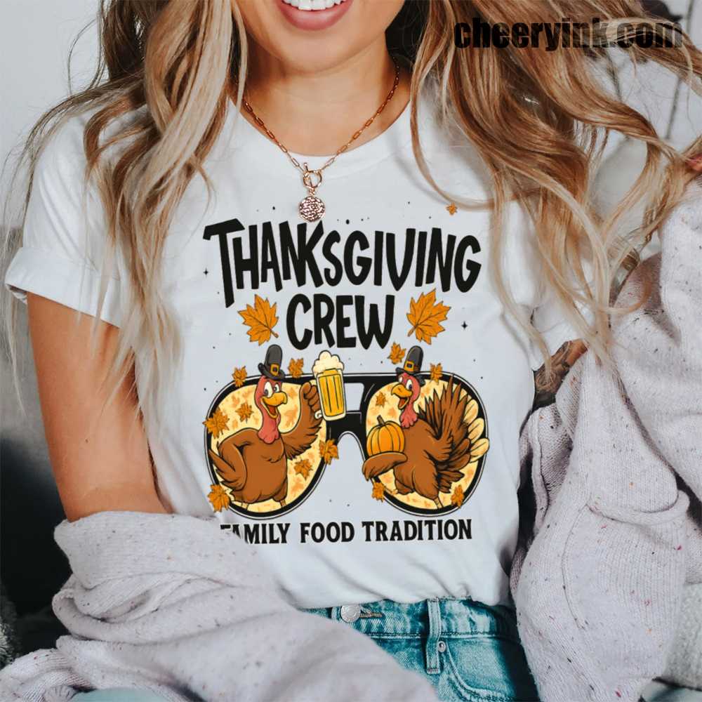 Get ready to feast and laugh in the Thanksgiving Crew T-Shirt.  a fun and festive way to show off your holiday spirit. With a cheerful design featuring cartoon turkeys, autumn leaves, beer mugs, and pumpkins all reflected in retro sunglasses, this tee is a must-have for your holiday wardrobe. Whether you’re the host or the guest, this shirt lets everyone know you’re part of the Thanksgiving fun.