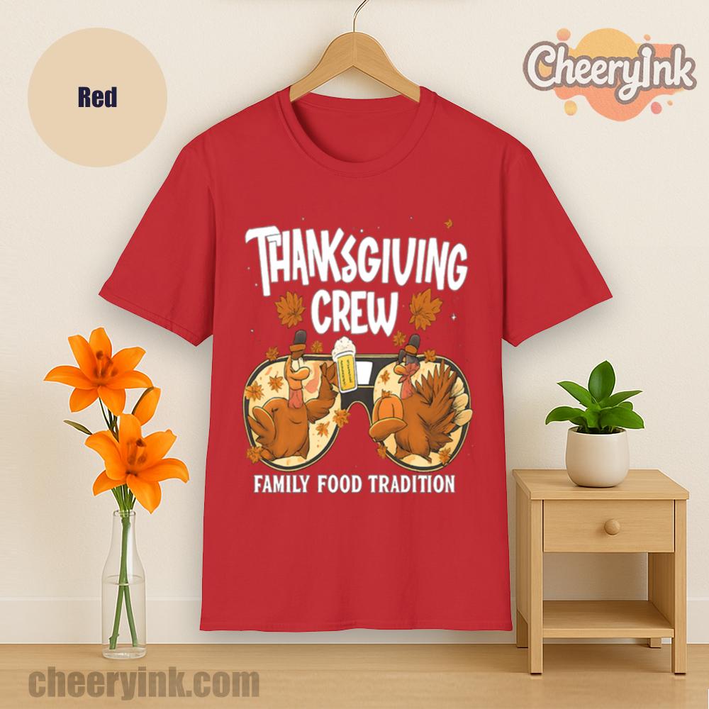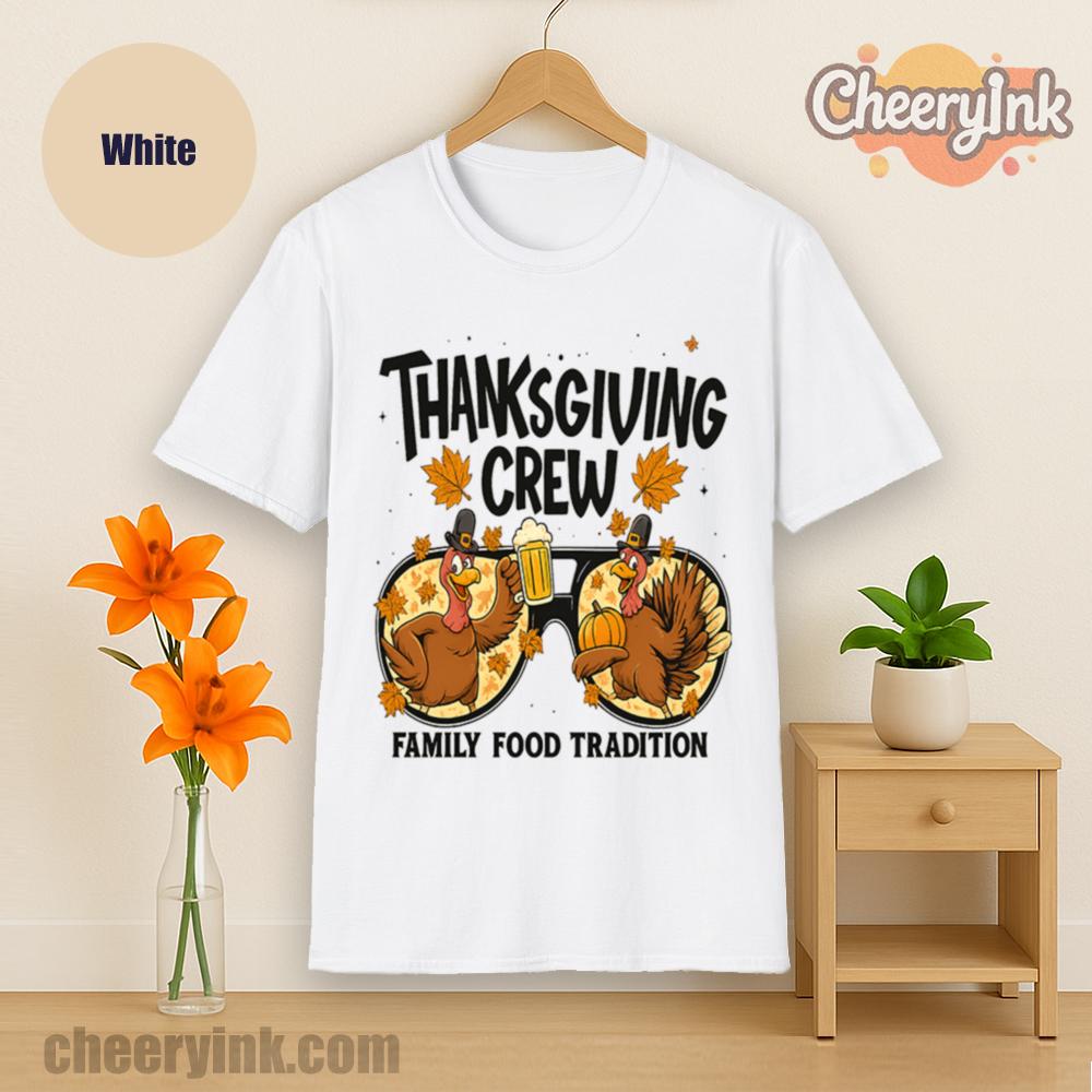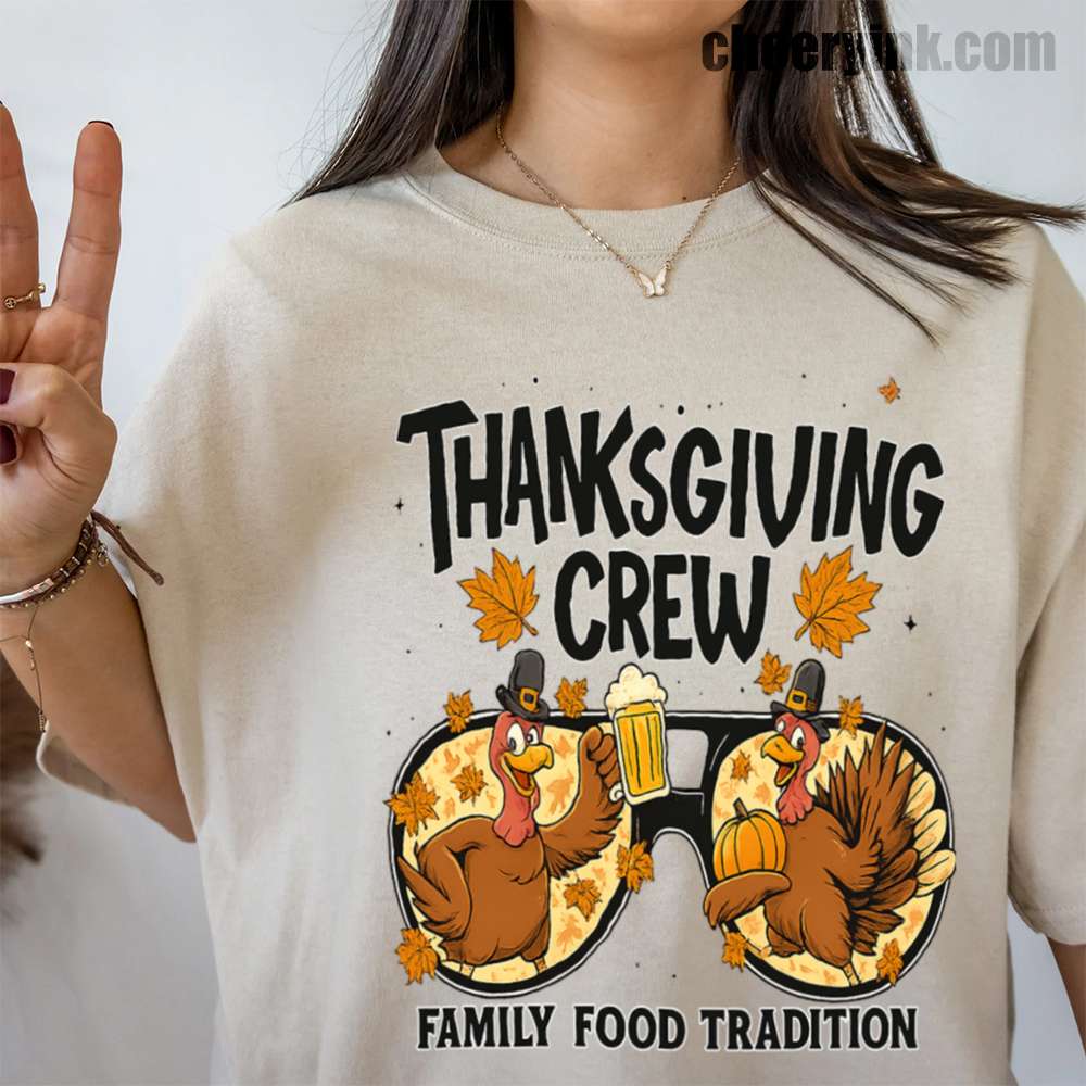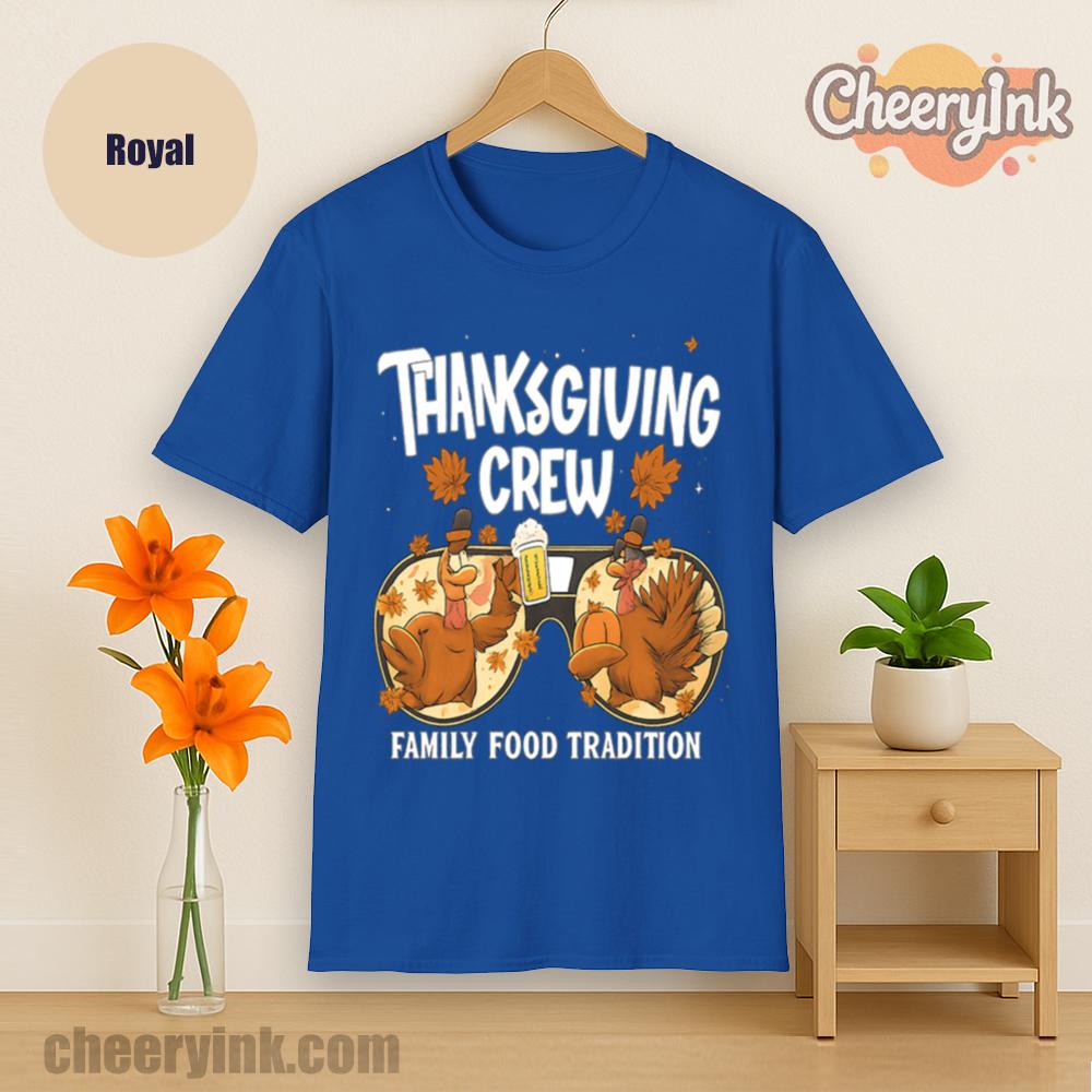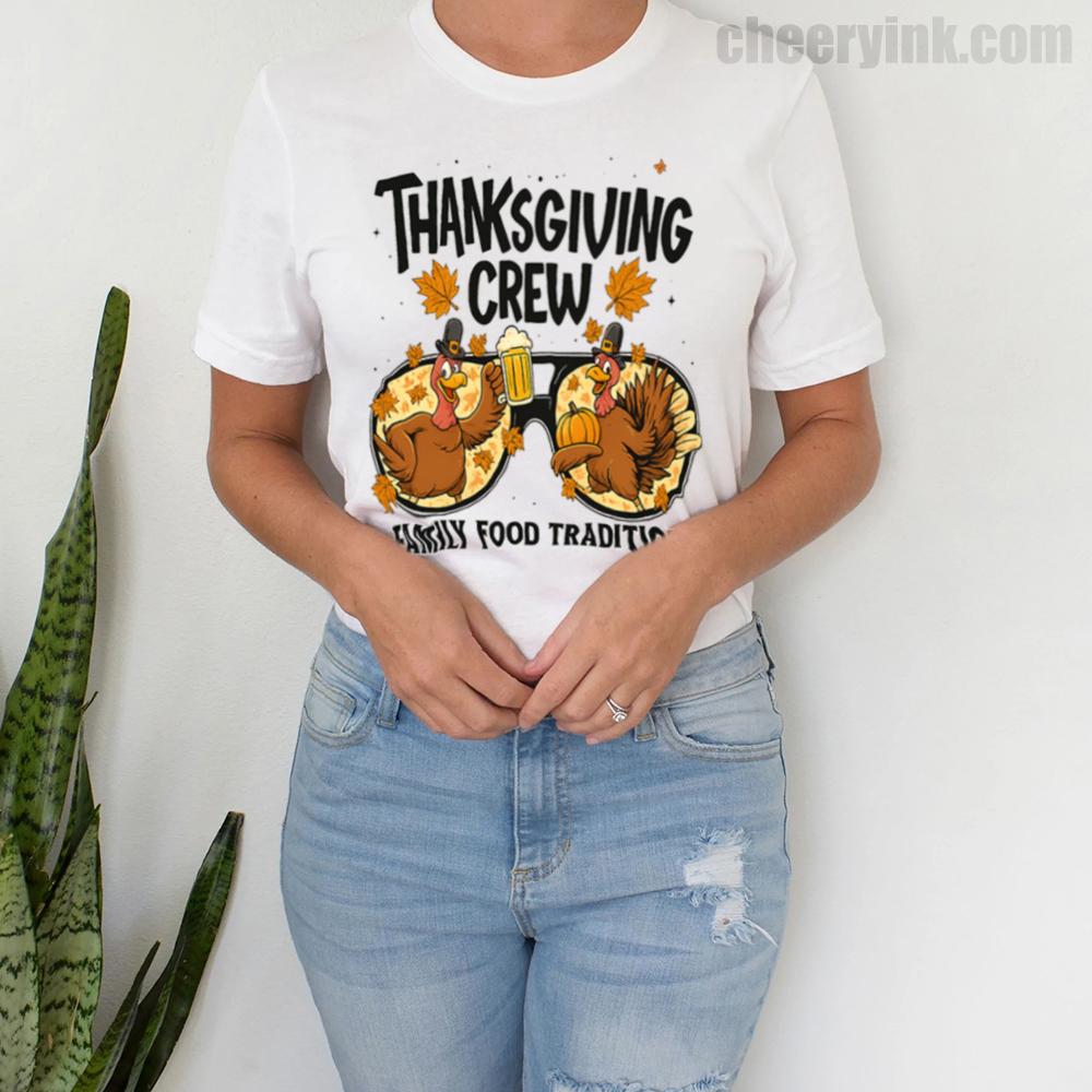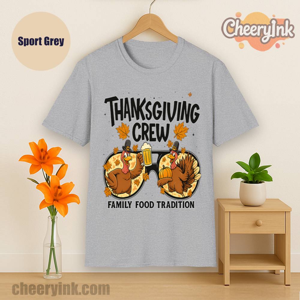 Get ready to feast and laugh in the Thanksgiving Crew T-Shirt.  a fun and festive way to show off your holiday spirit. With a cheerful design featuring cartoon turkeys, autumn leaves, beer mugs, and pumpkins all reflected in retro sunglasses, this tee is a must-have for your holiday wardrobe. Whether you’re the host or the guest, this shirt lets everyone know you’re part of the Thanksgiving fun.